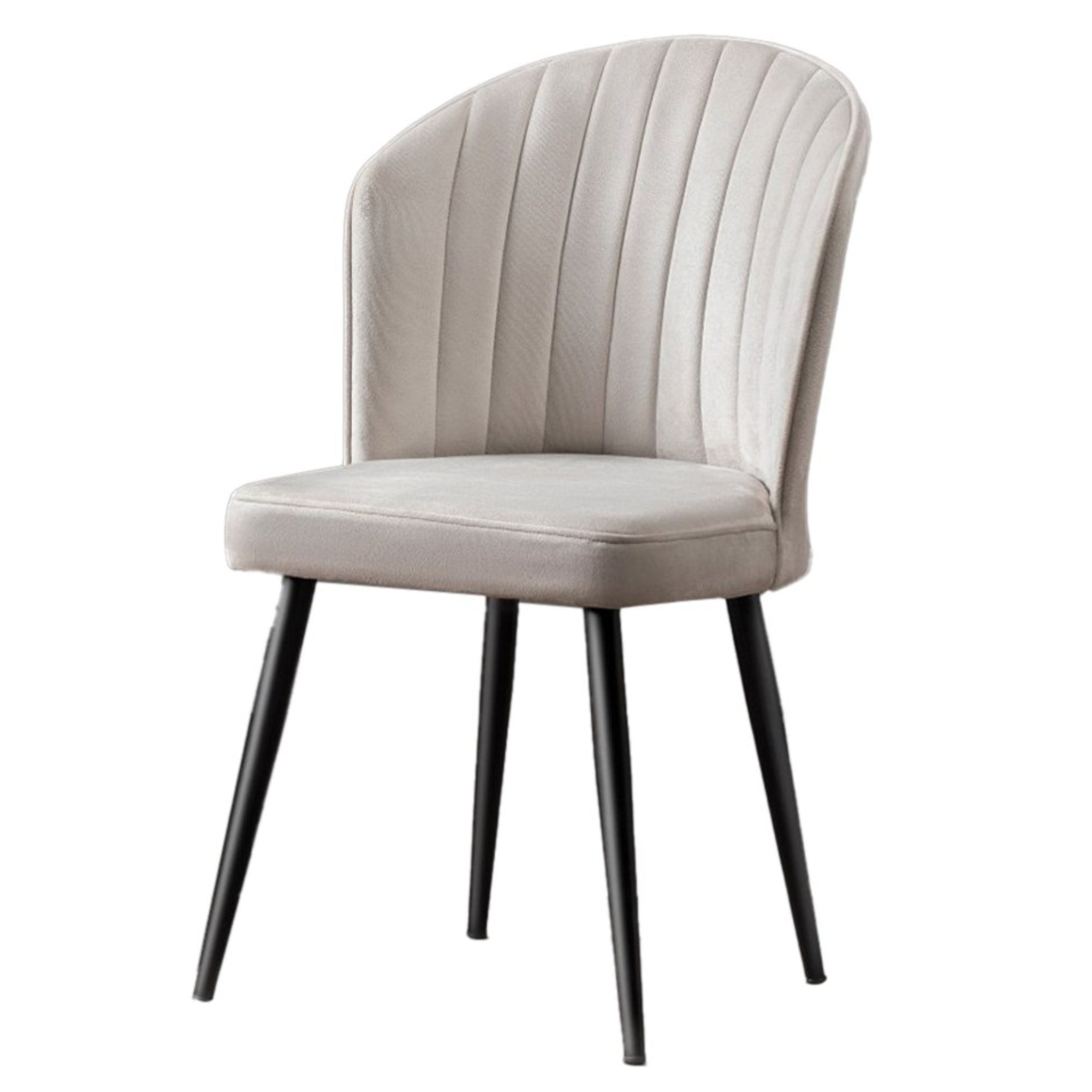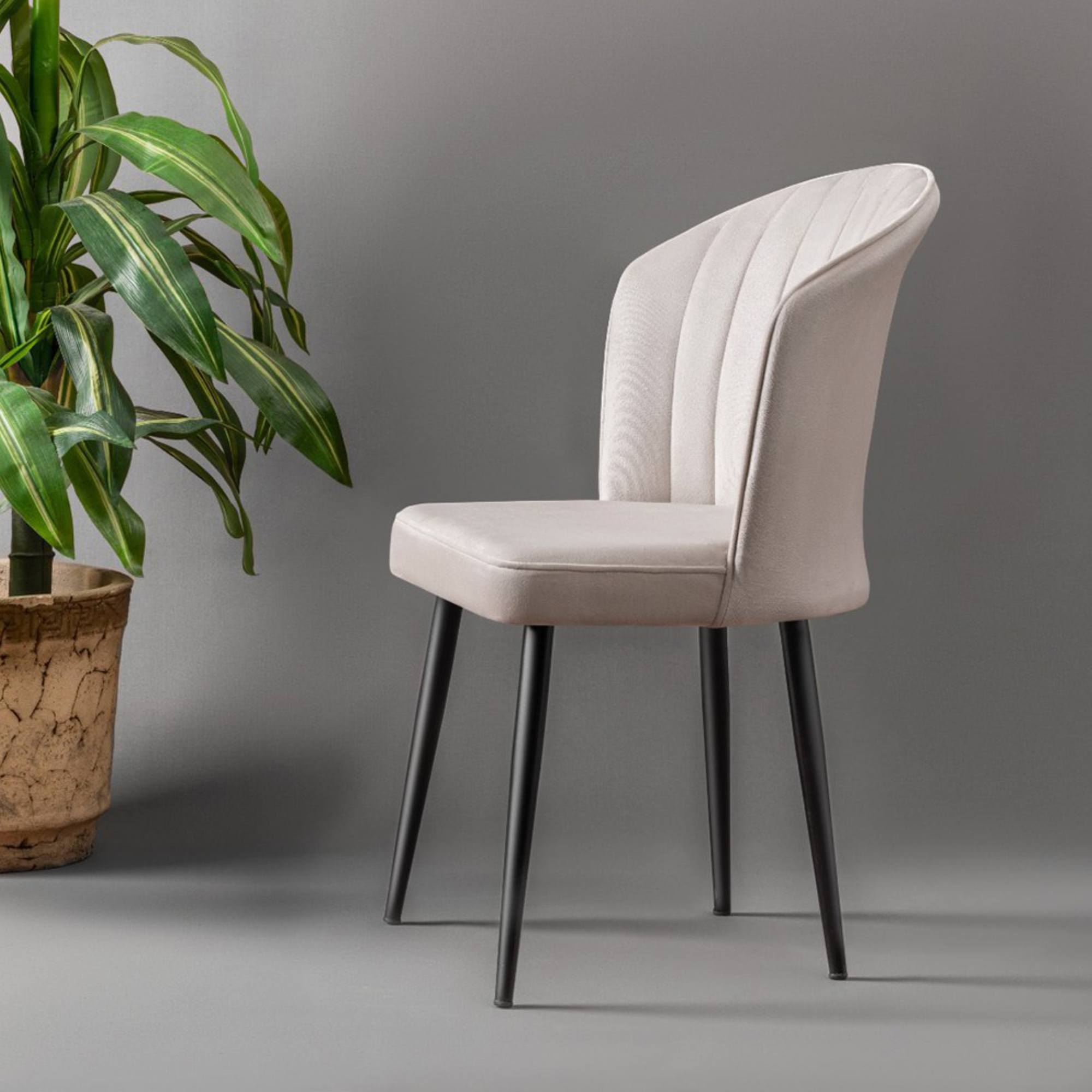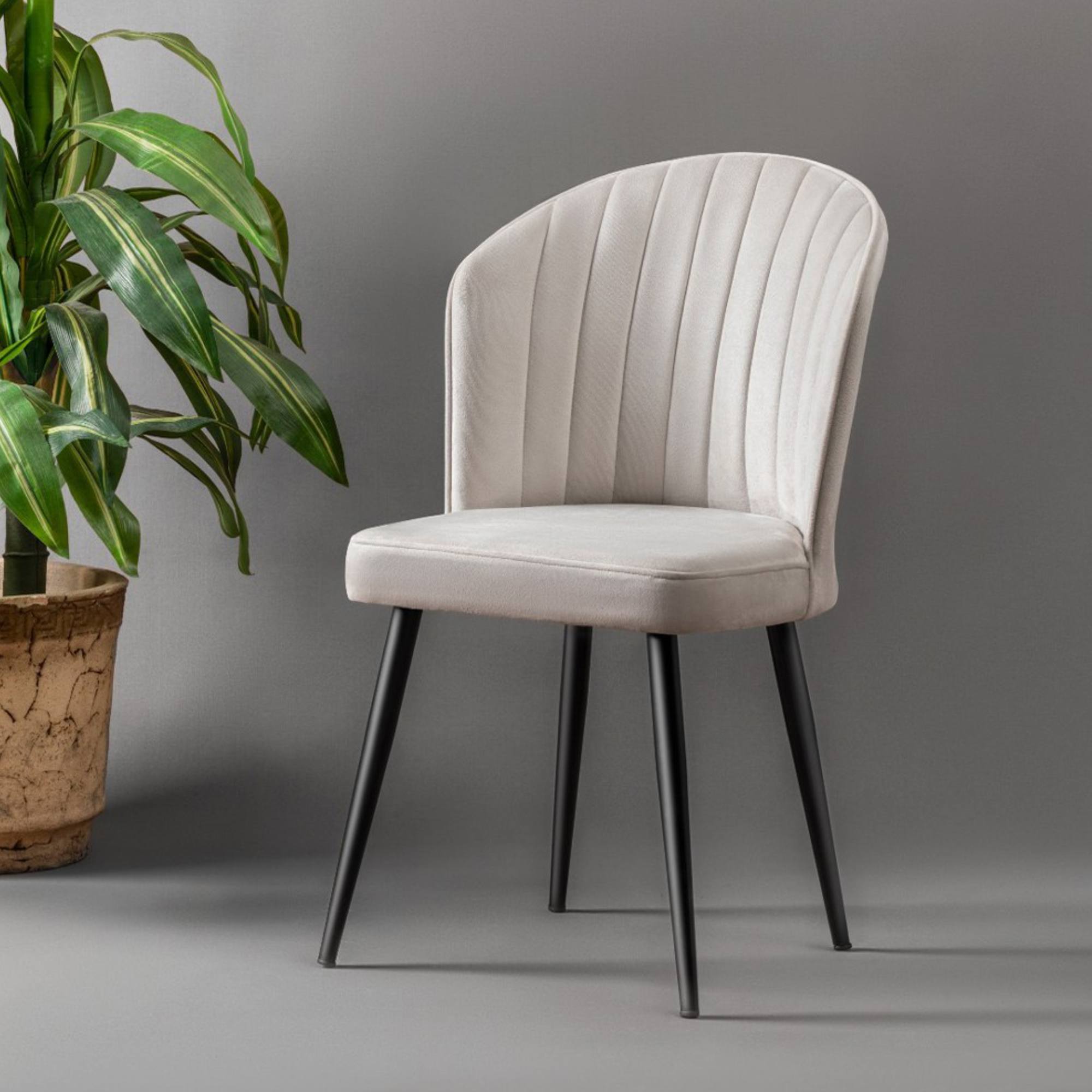 Jedálenské stoličky RUBI sú čalúnené hladkou tkaninou a zdobí ich elegantné prešívanie.