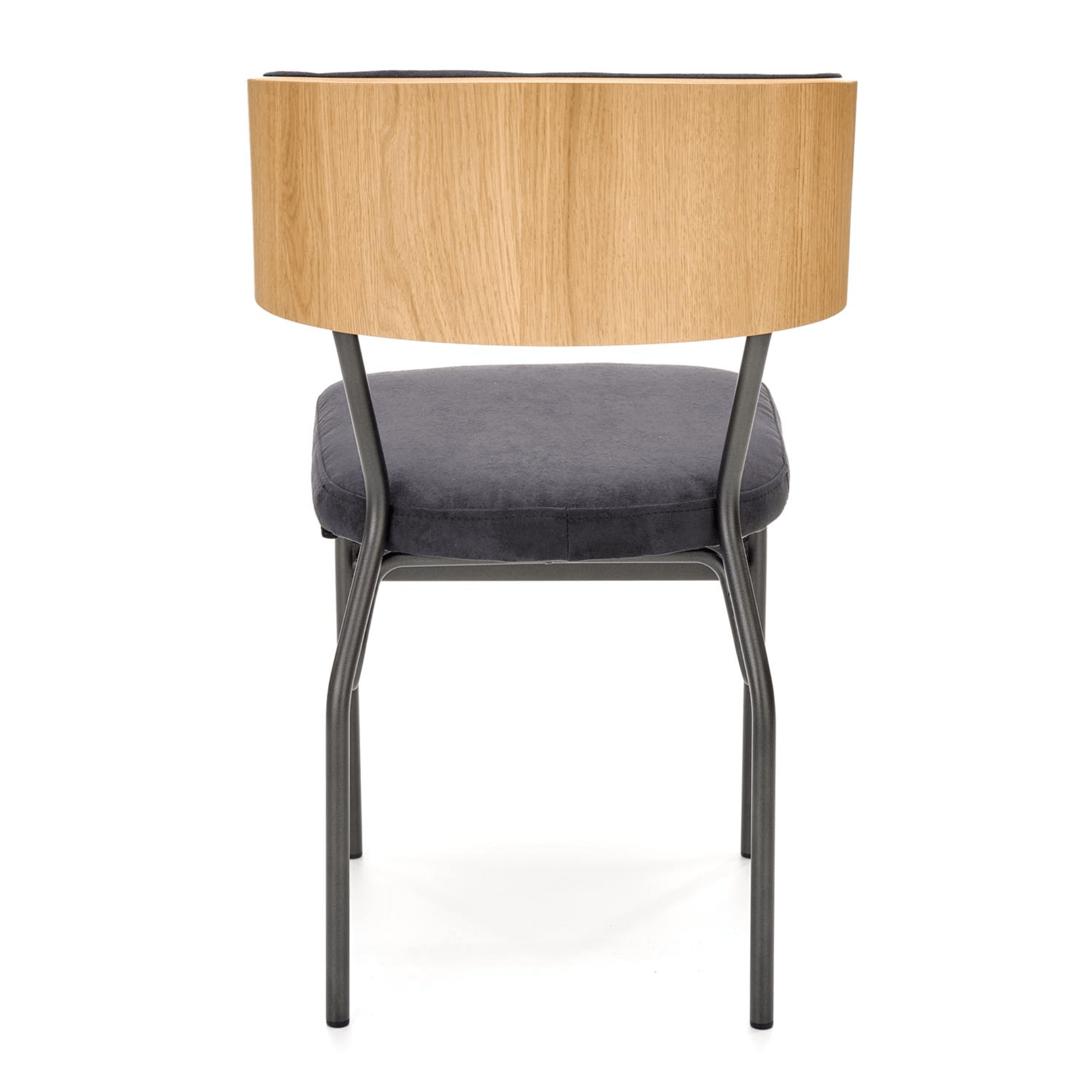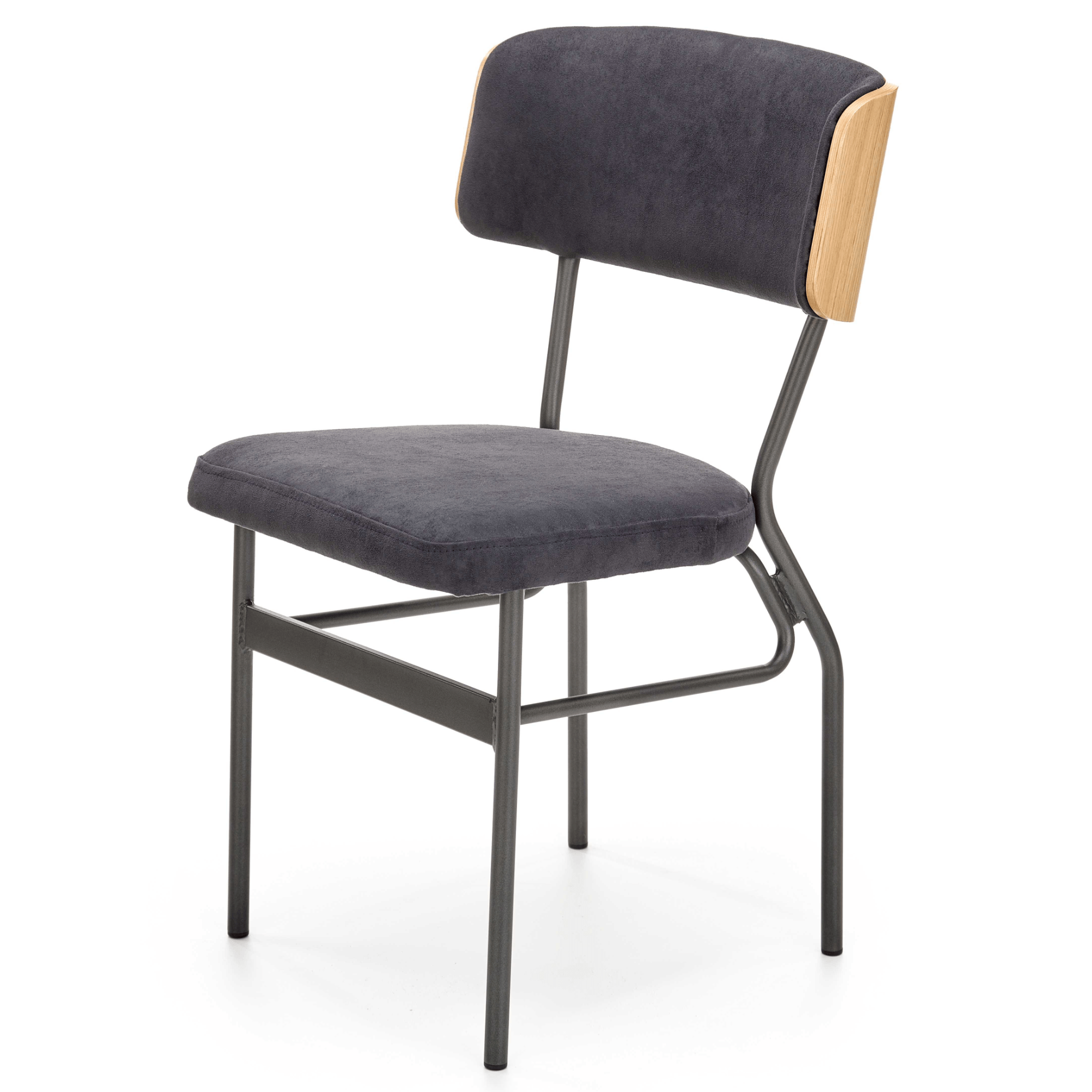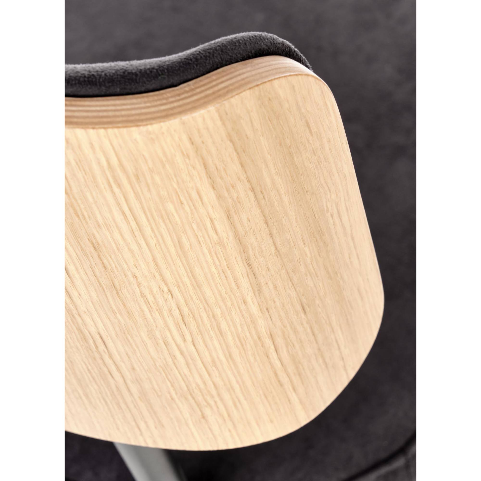 Pohodlie je dosiahnuté čalúnením sedadla a chrbtovej opierky – spoločným menovateľom je čalúnenie z hladkej tkaniny zamatového vzhľadu. Zadná strana opierky je ohýbanej dubovej dyhy prírodného odtieňa, ktorý je kontrastom k čiernej a maximálne stabilnej kovovej konštrukcii.
