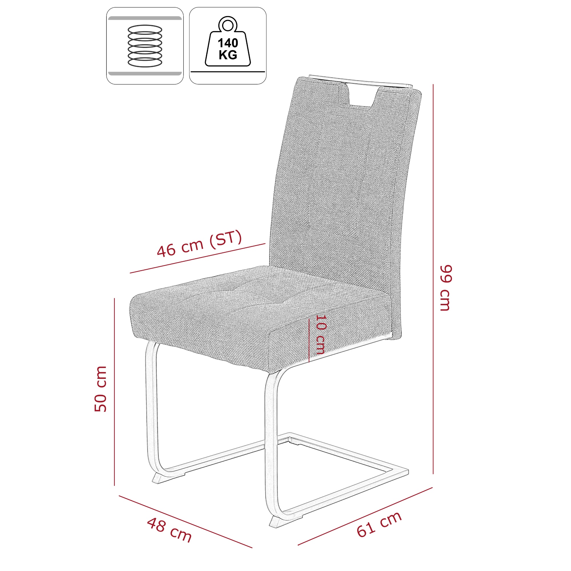 Jedálenské stoličky majú pevnú a stabilnú konštrukciu, ktorá je vyrobená z kovu. Povrch konštrukcie je opatrený práškovým nástrekom. Sedenie na stoličkách je pohodlné najmä vďaka mäkkým penovým sedákom s pružinovým jadrom. Stoličky sú čalúnené mikrovláknom a zdobí ich elegantné prešívanie. Aby sa s nimi lepšie manipulovalo, sú vybavené úchytkami. Nosnosť každej stoličky je 140 kg.