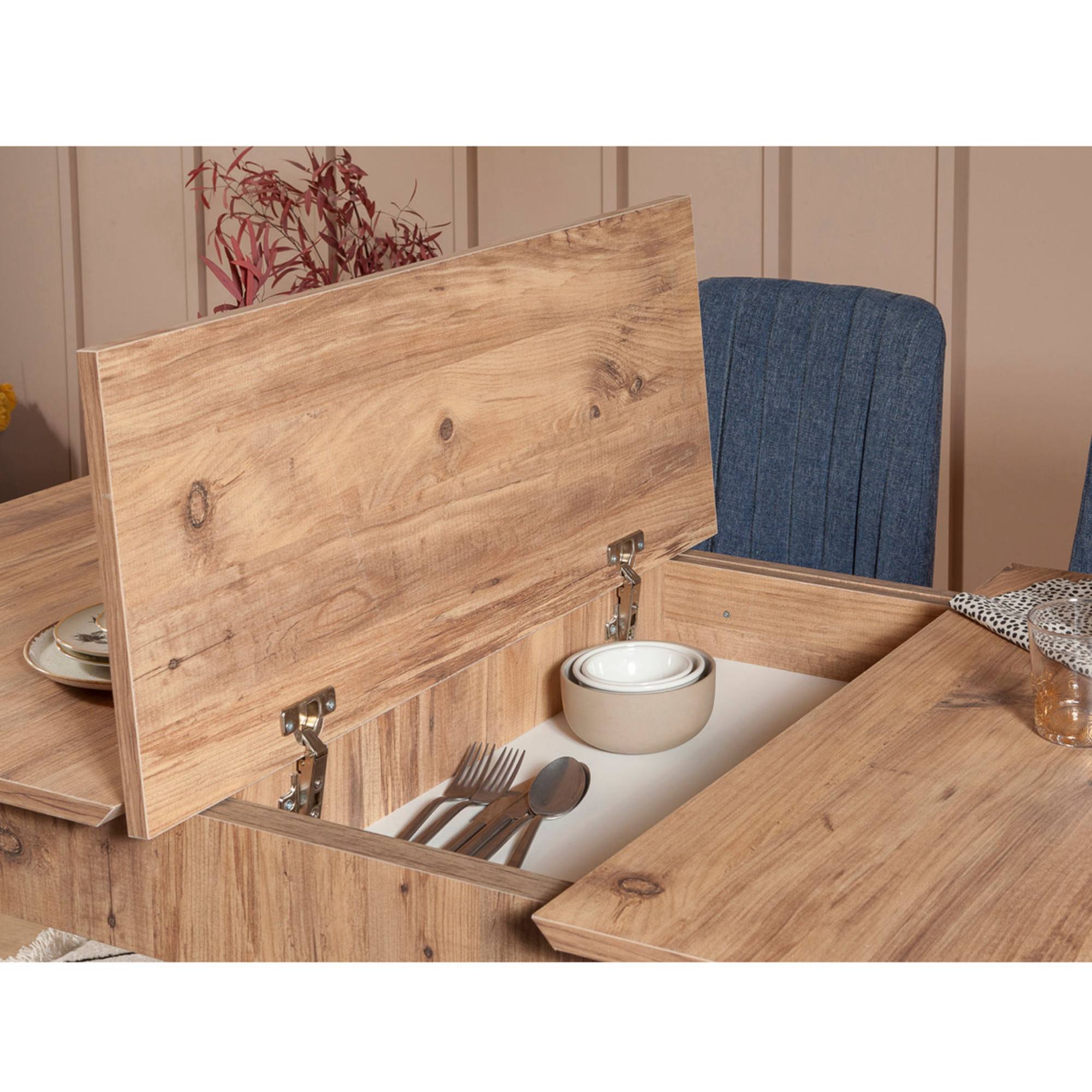 Zostava ponúka praktický úložný priestor, a to nielen pod sedákmi lavíc, ale aj pod hornou doskou stola. Vďaka rozkladacej funkcii je možné šírku stola zväčšiť zo 130 cm na 165 cm.
