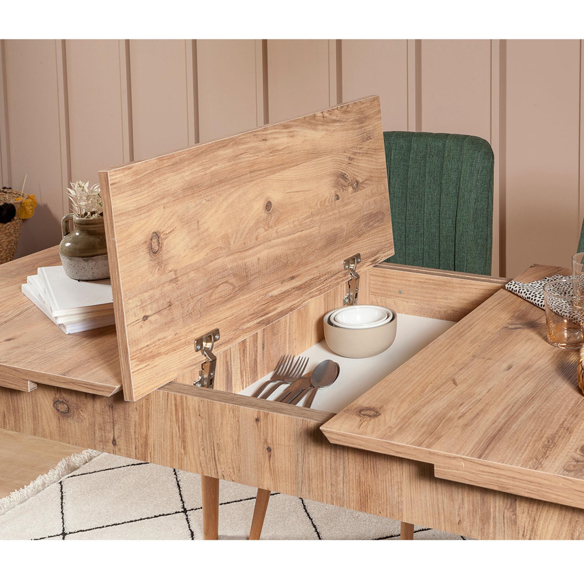 Zostava ponúka praktický úložný priestor, a to nielen pod sedákmi lavíc, ale aj pod hornou doskou stola. Vďaka rozkladacej funkcii je možné šírku stola zväčšiť zo 130 cm na 165 cm.
