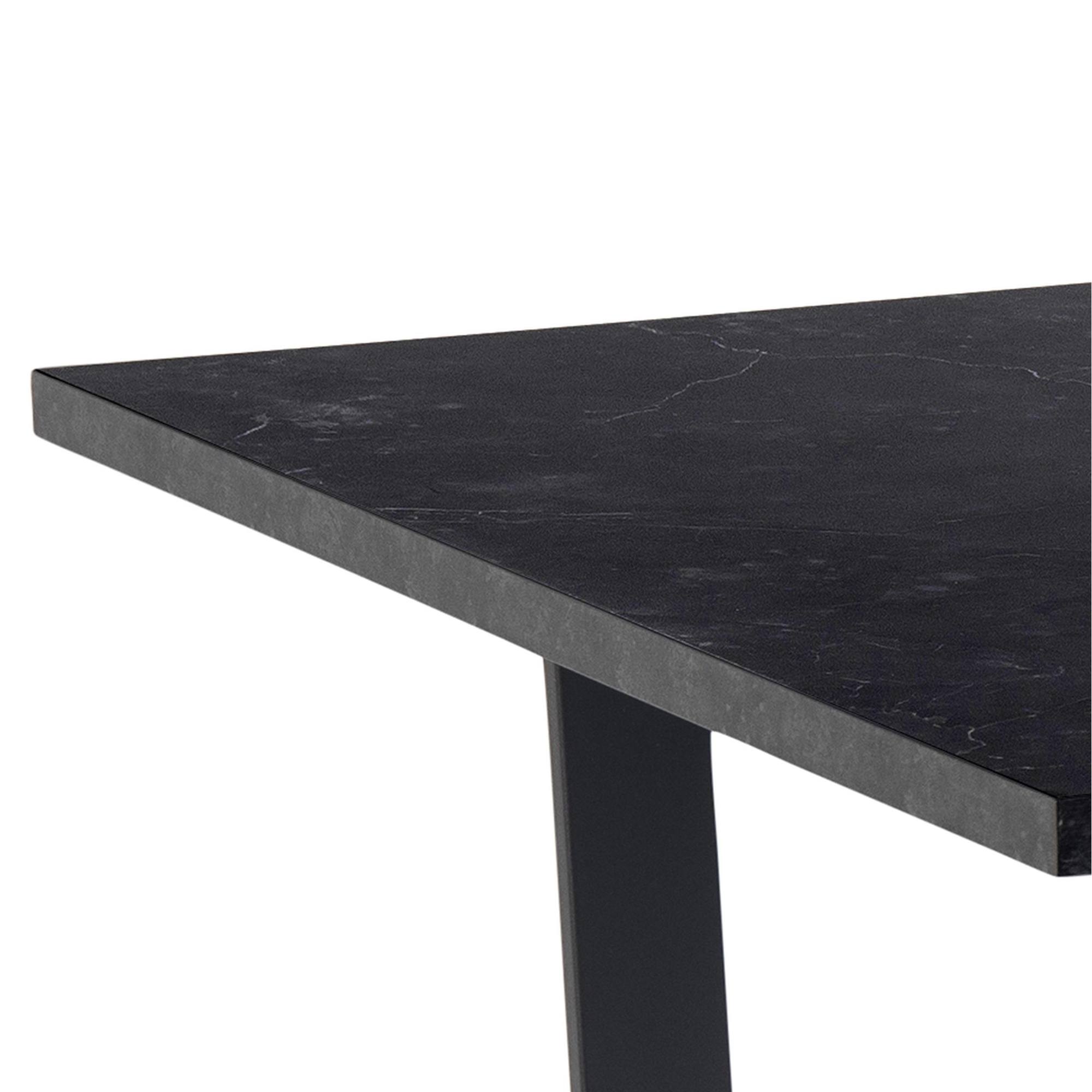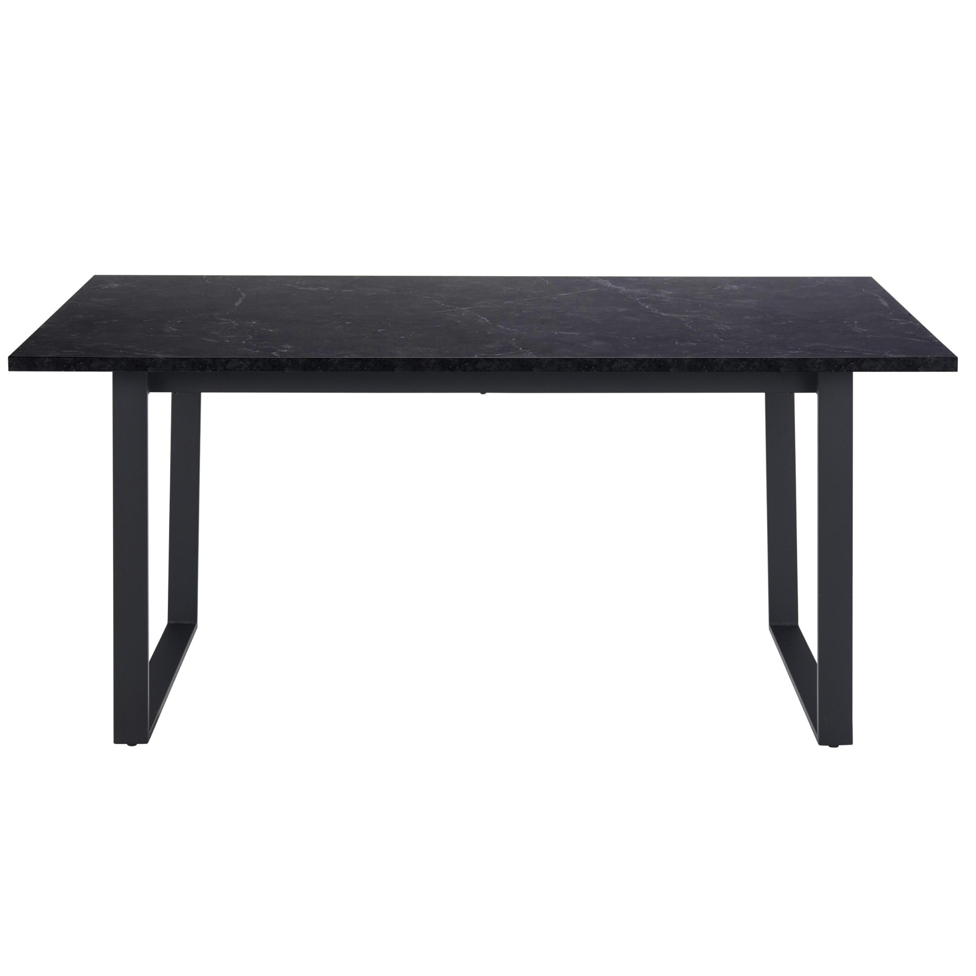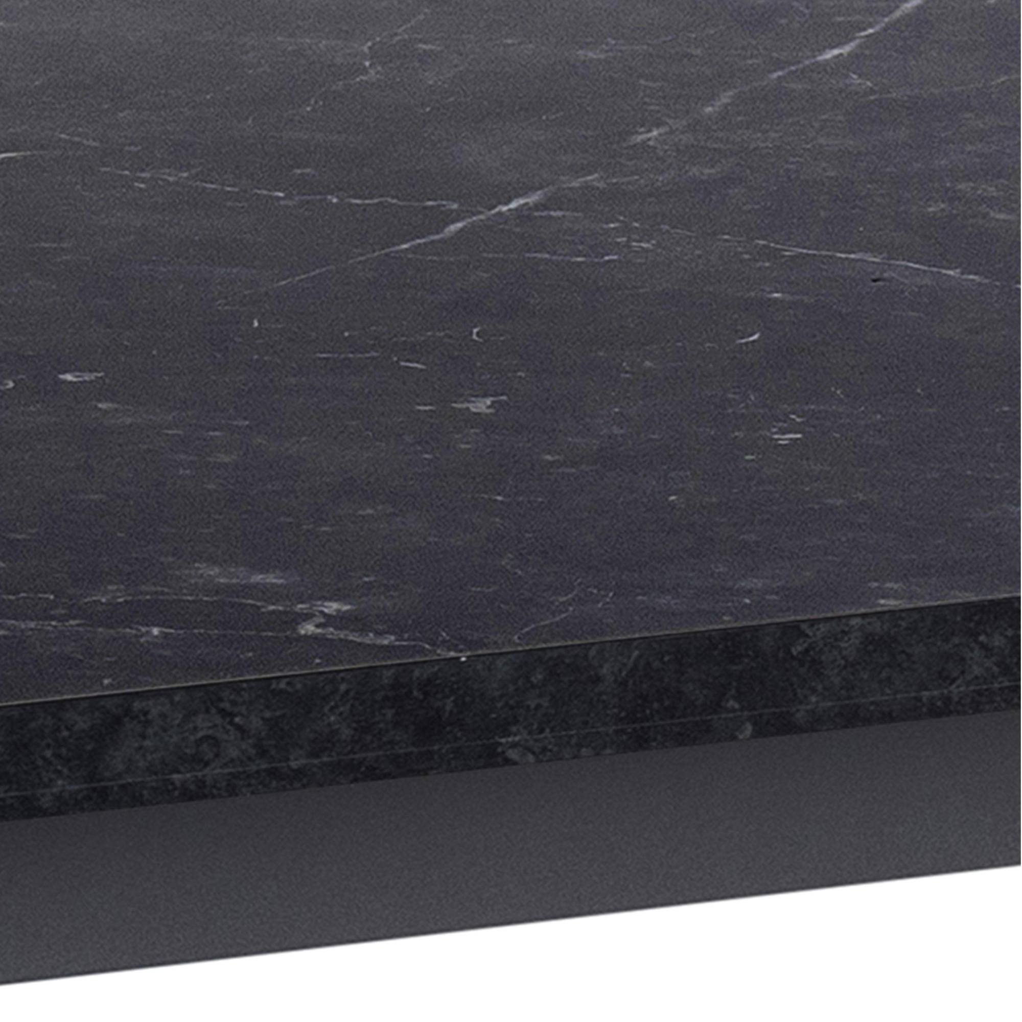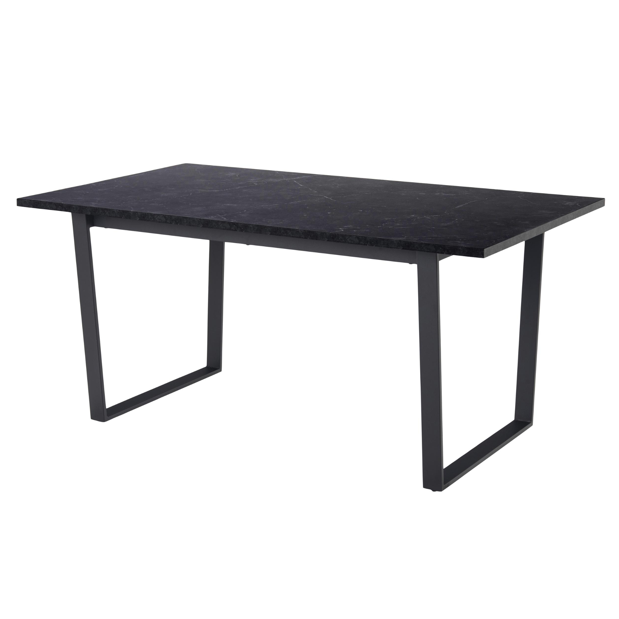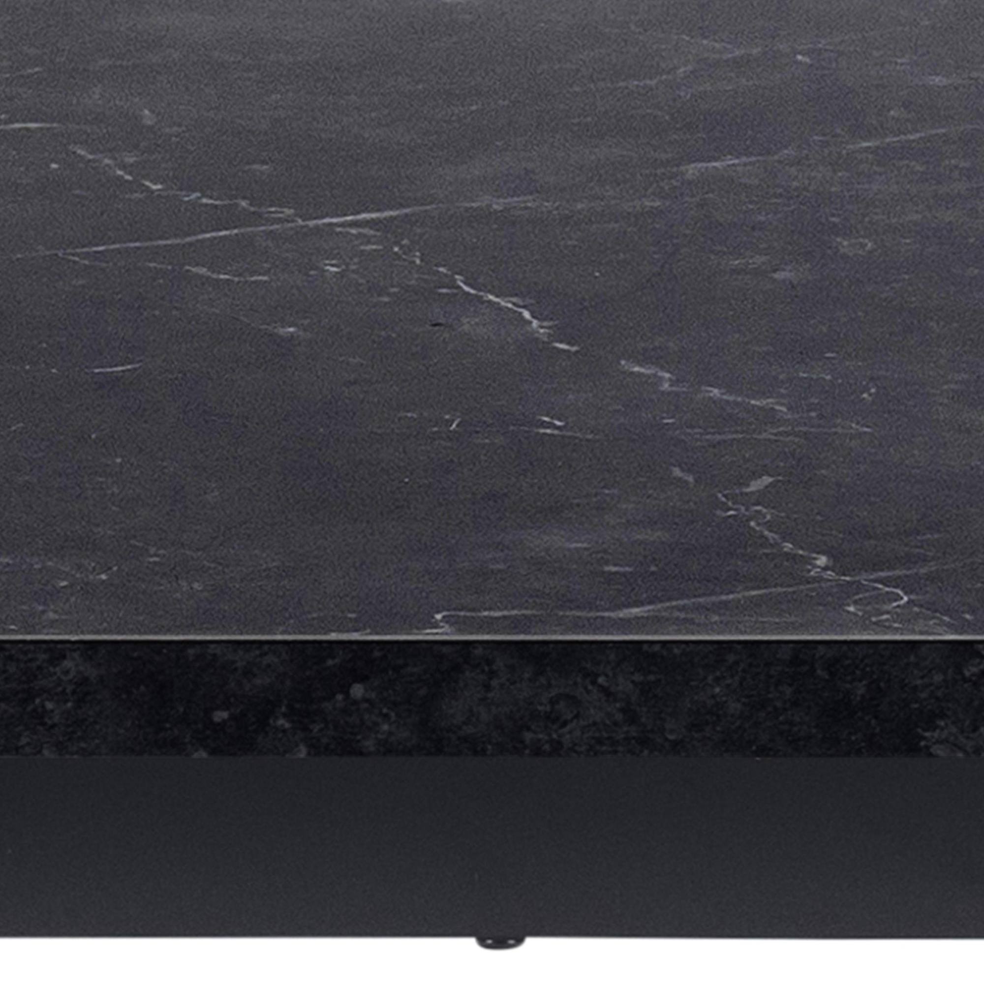 Doska stola so vzhľadom čierneho mramoru obohatí interiér o punc luxusu. Táto doska s hrúbkou 2,5 cm je vyrobená z drevovláknitého materiálu MDF, ktorý sa vyznačuje ľahkou udržiavateľnosťou aj dlhou životnosťou. Maximálnu stabilitu zaisťuje kovová dvojnohá podnož v tvare U v čiernom práškovom laku.