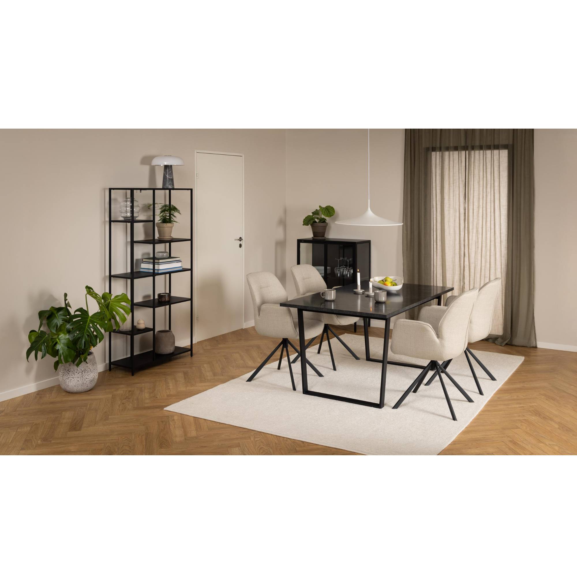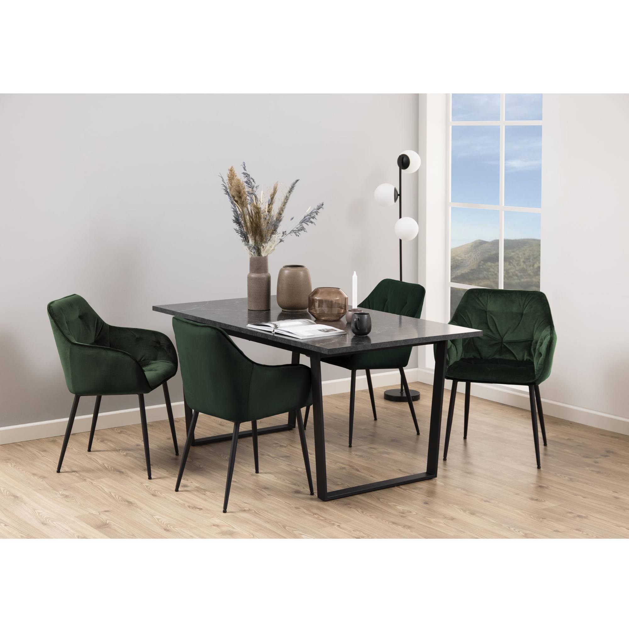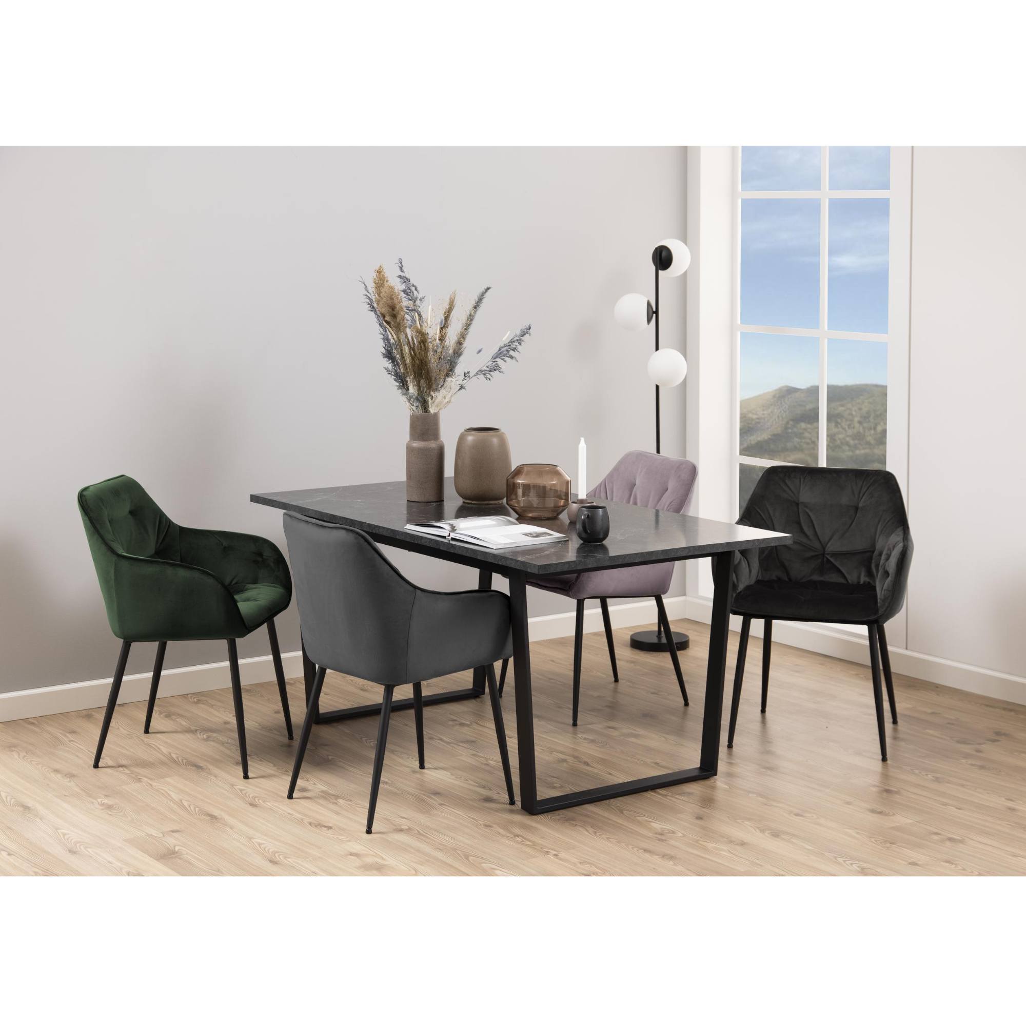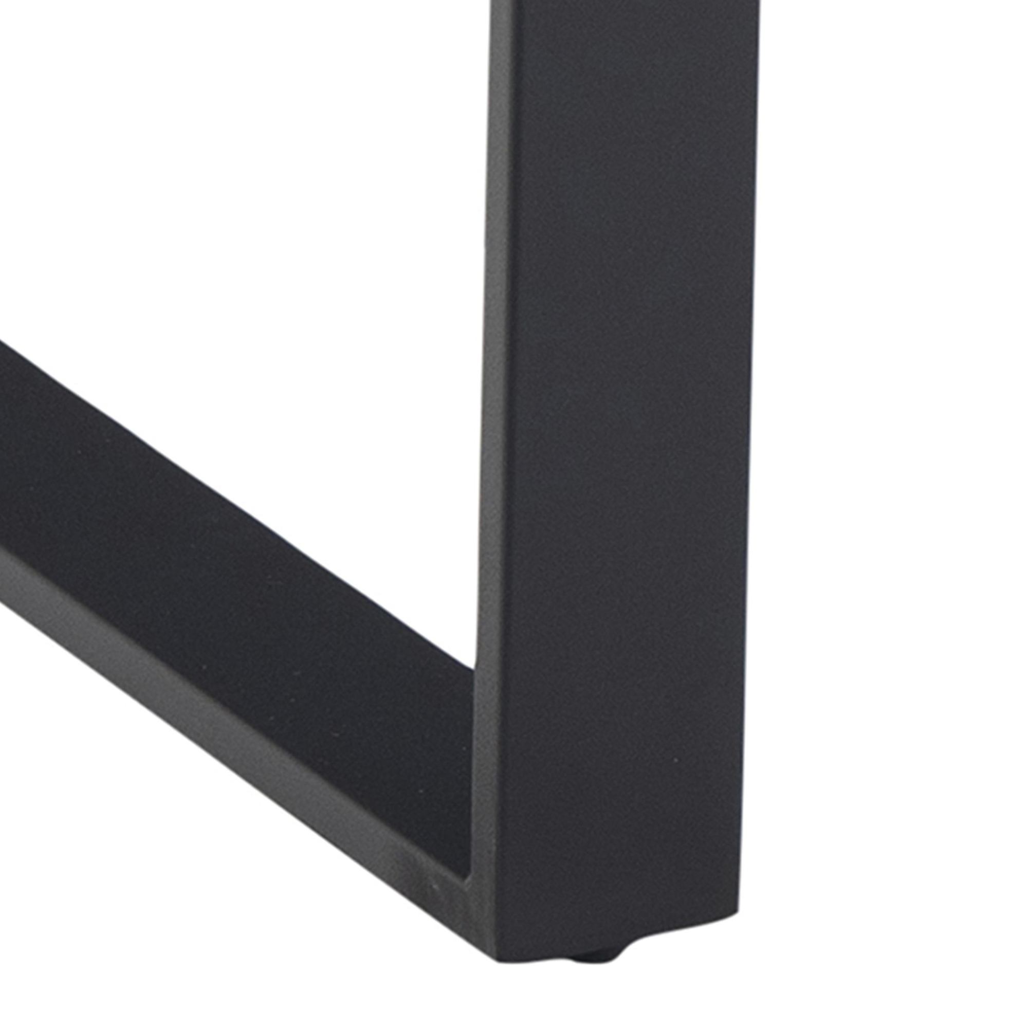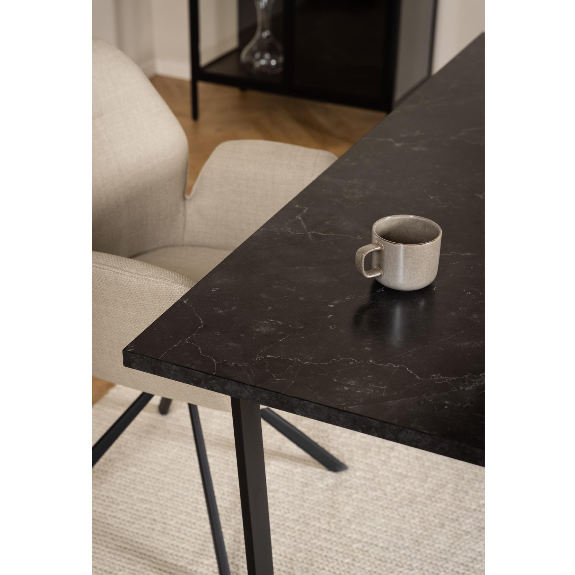 Doska stola so vzhľadom čierneho mramoru obohatí interiér o punc luxusu. Táto doska s hrúbkou 2,5 cm je vyrobená z drevovláknitého materiálu MDF, ktorý sa vyznačuje ľahkou udržiavateľnosťou aj dlhou životnosťou. Maximálnu stabilitu zaisťuje kovová dvojnohá podnož v tvare U v čiernom práškovom laku.