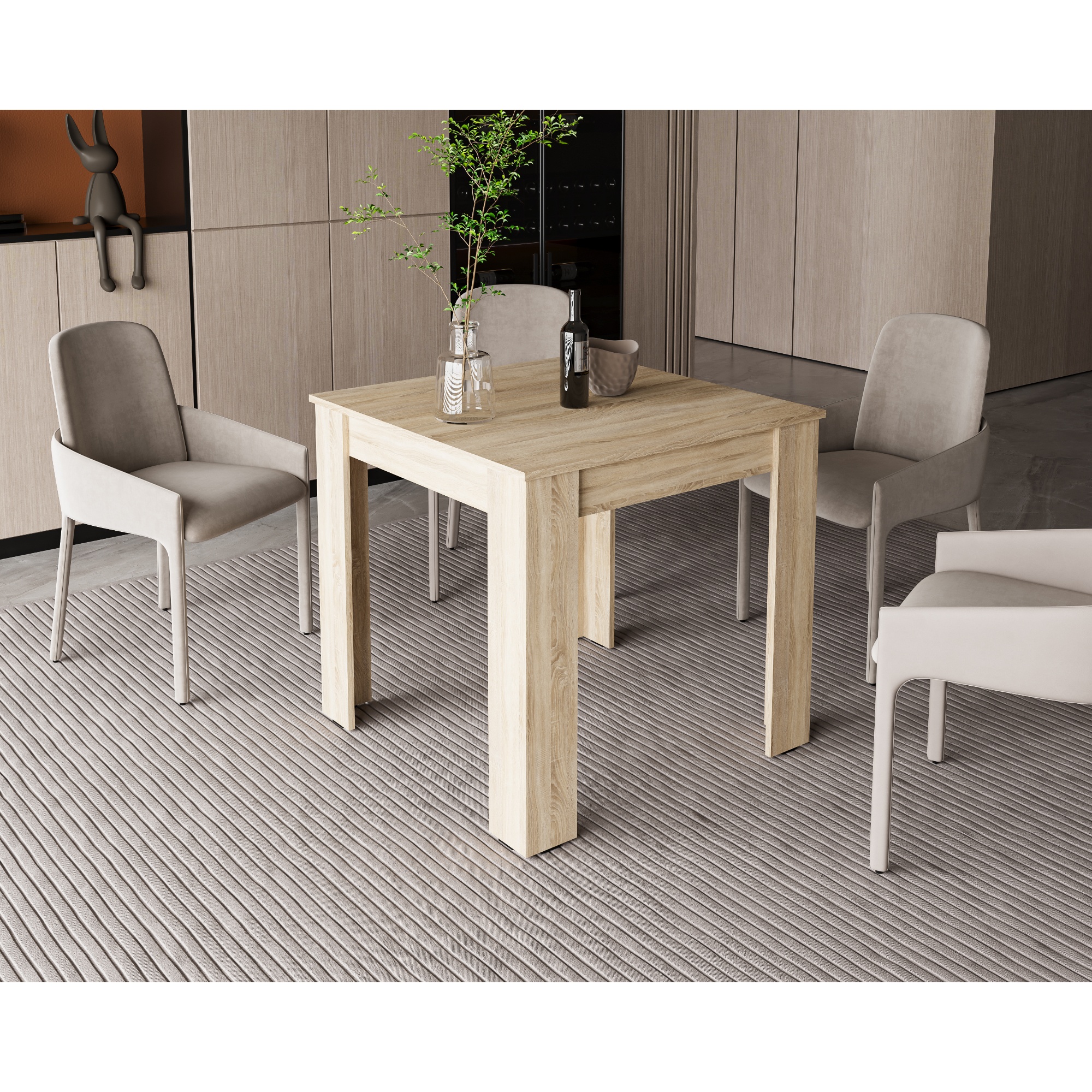 Stôl je vybavený elegantnou hornou doskou v tvare štvorca. Tá je umiestnená na pevnej štvornohej podnoži, ktorá sa stará o stabilitu stola.