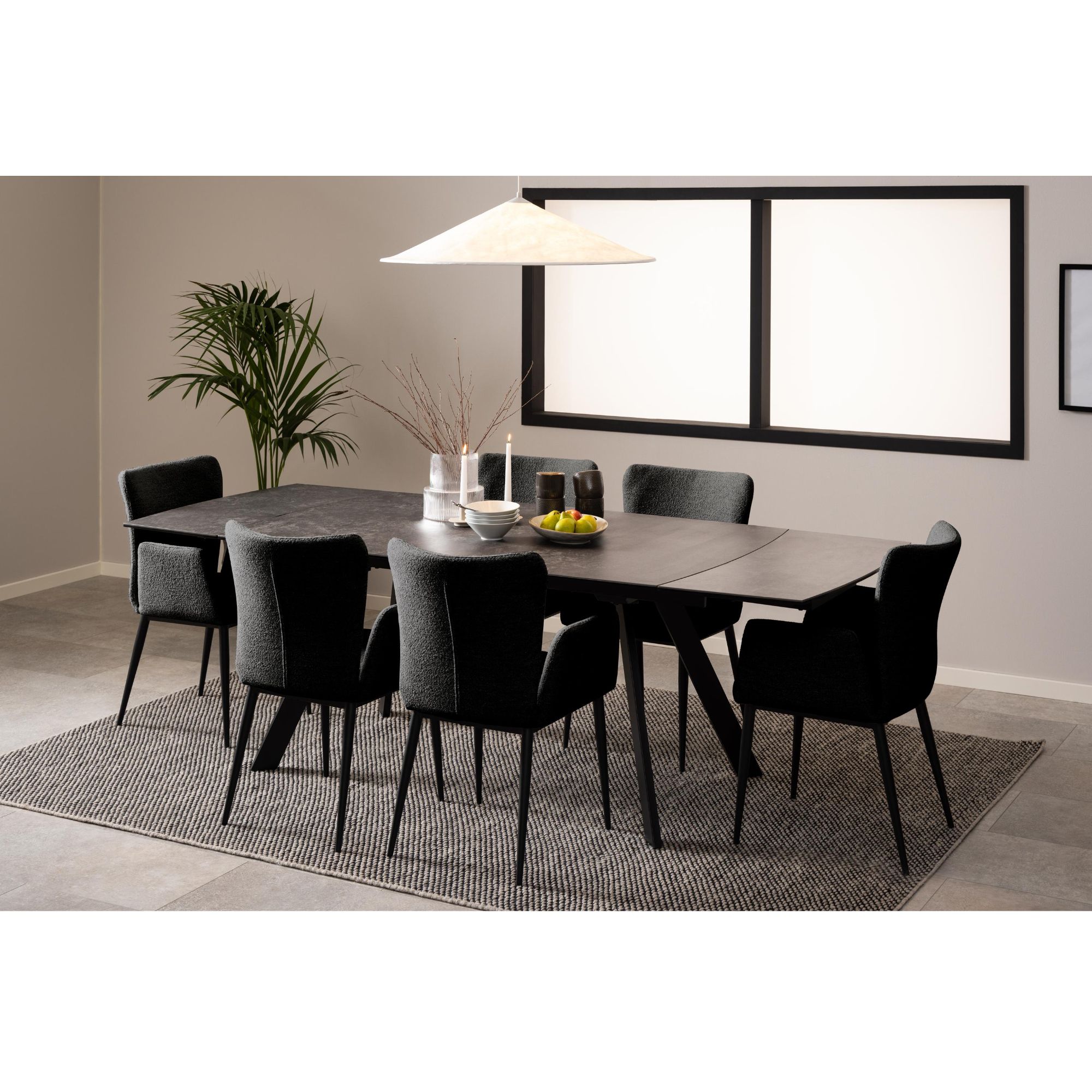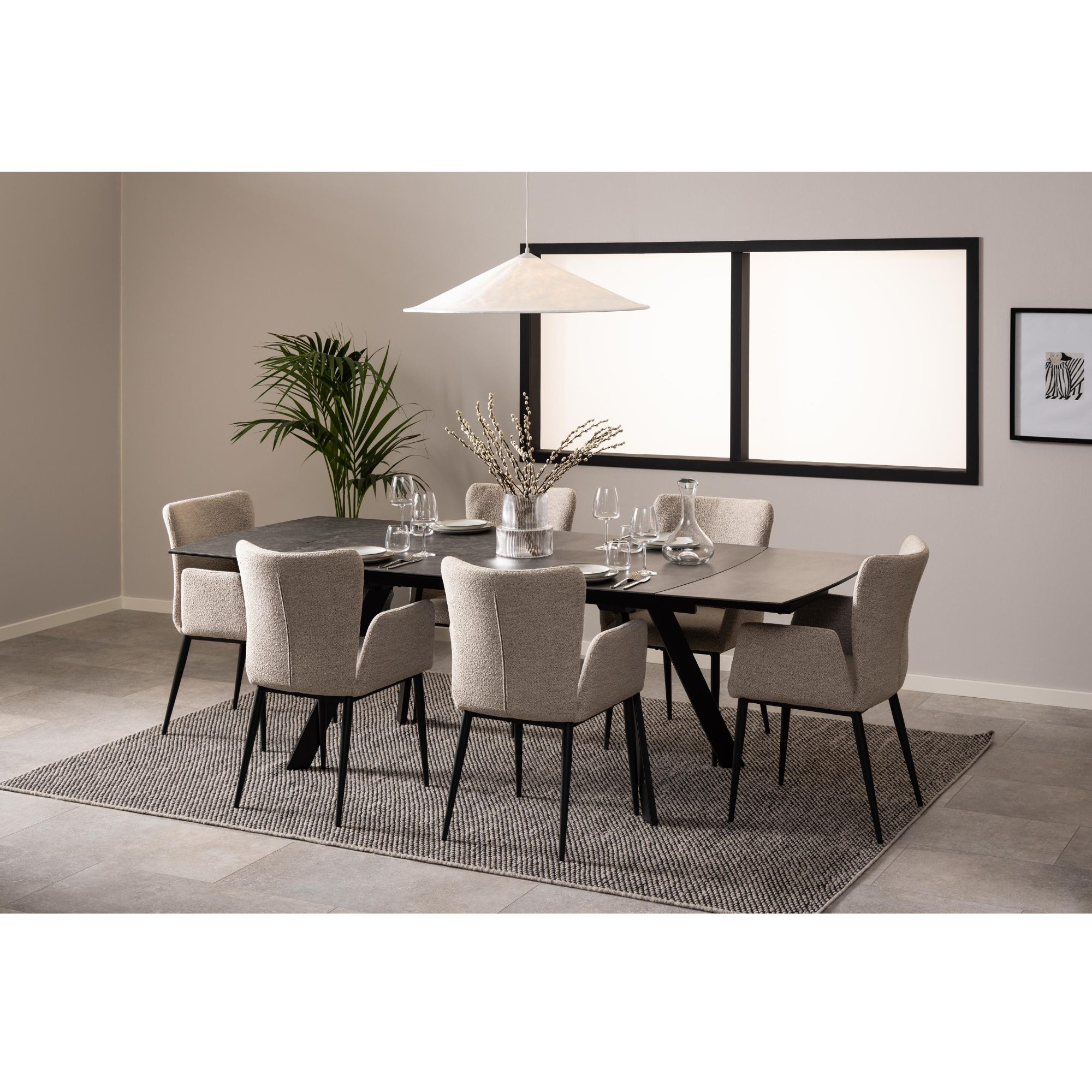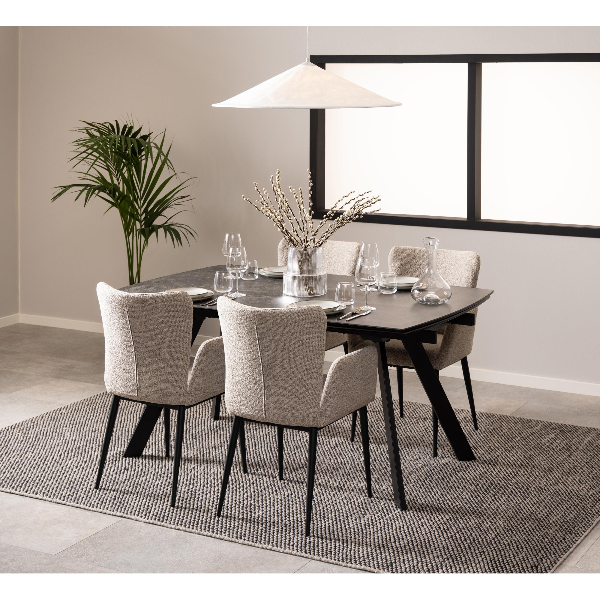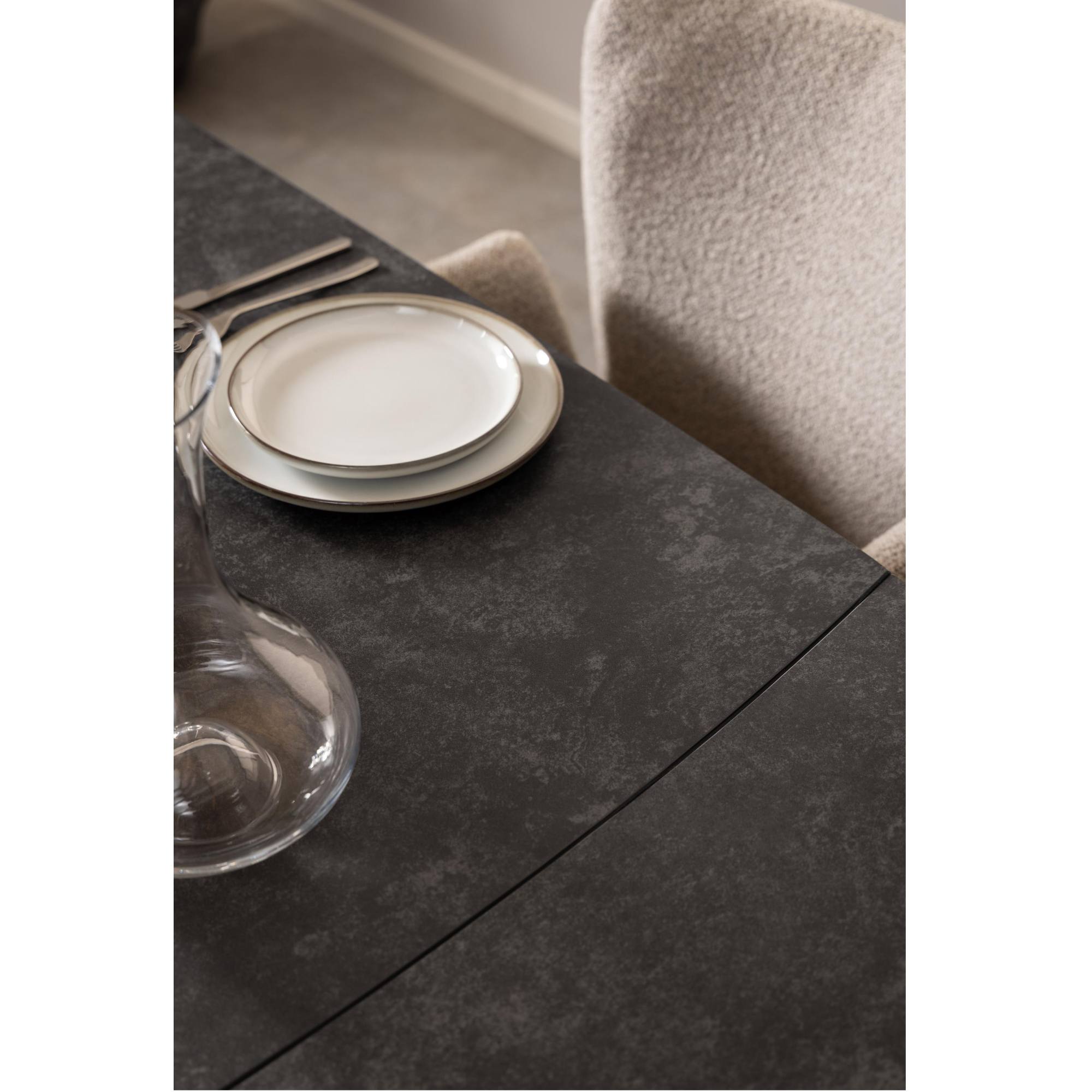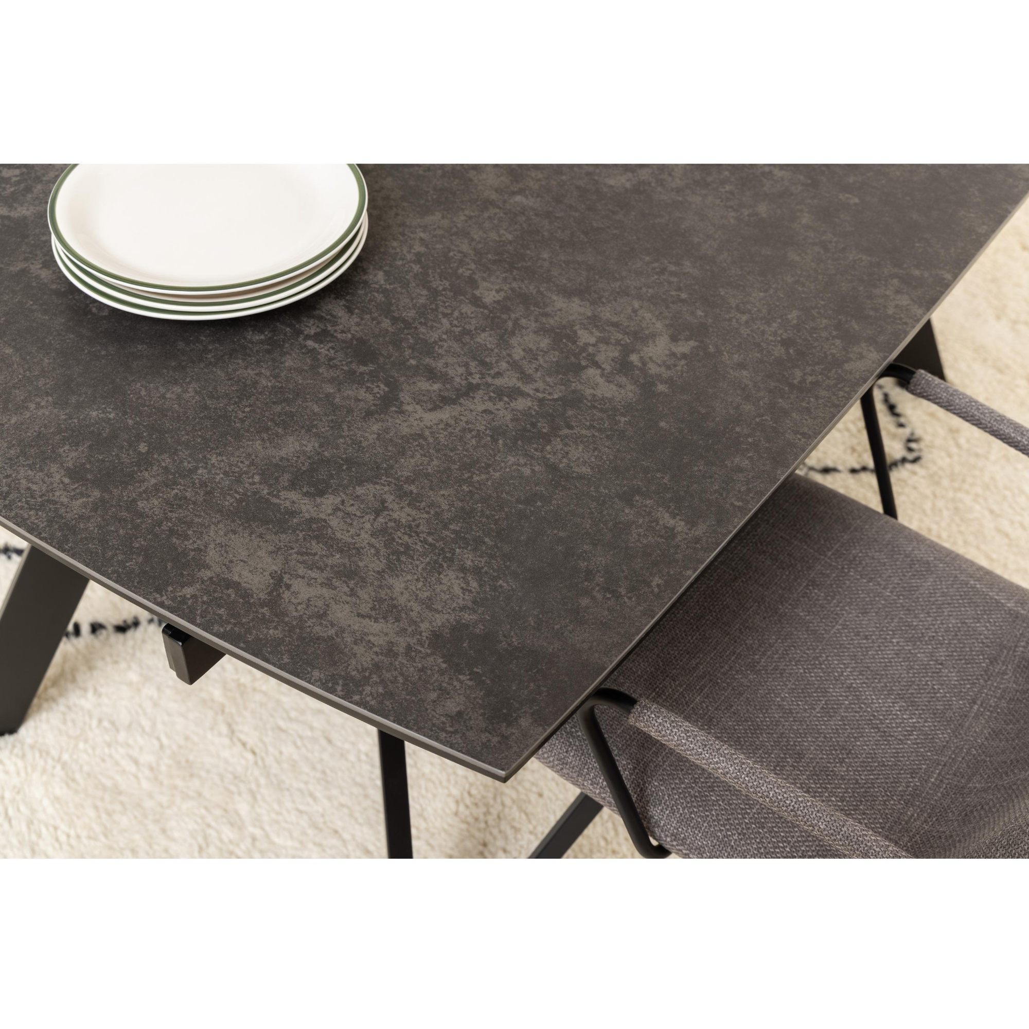 Tento stôl vyniká mimoriadnou stabilitou, za ktorú vďačí pevným kovovým nohám pokrytým matným práškovým lakom. Jeho doska je vyrobená z keramiky a skla, a tak je odolná voči teplu. Keďže je pre tieto materiály charakteristická jednoduchá údržba, starostlivosť o stôl si nebude vyžadovať veľa času ani námahy.