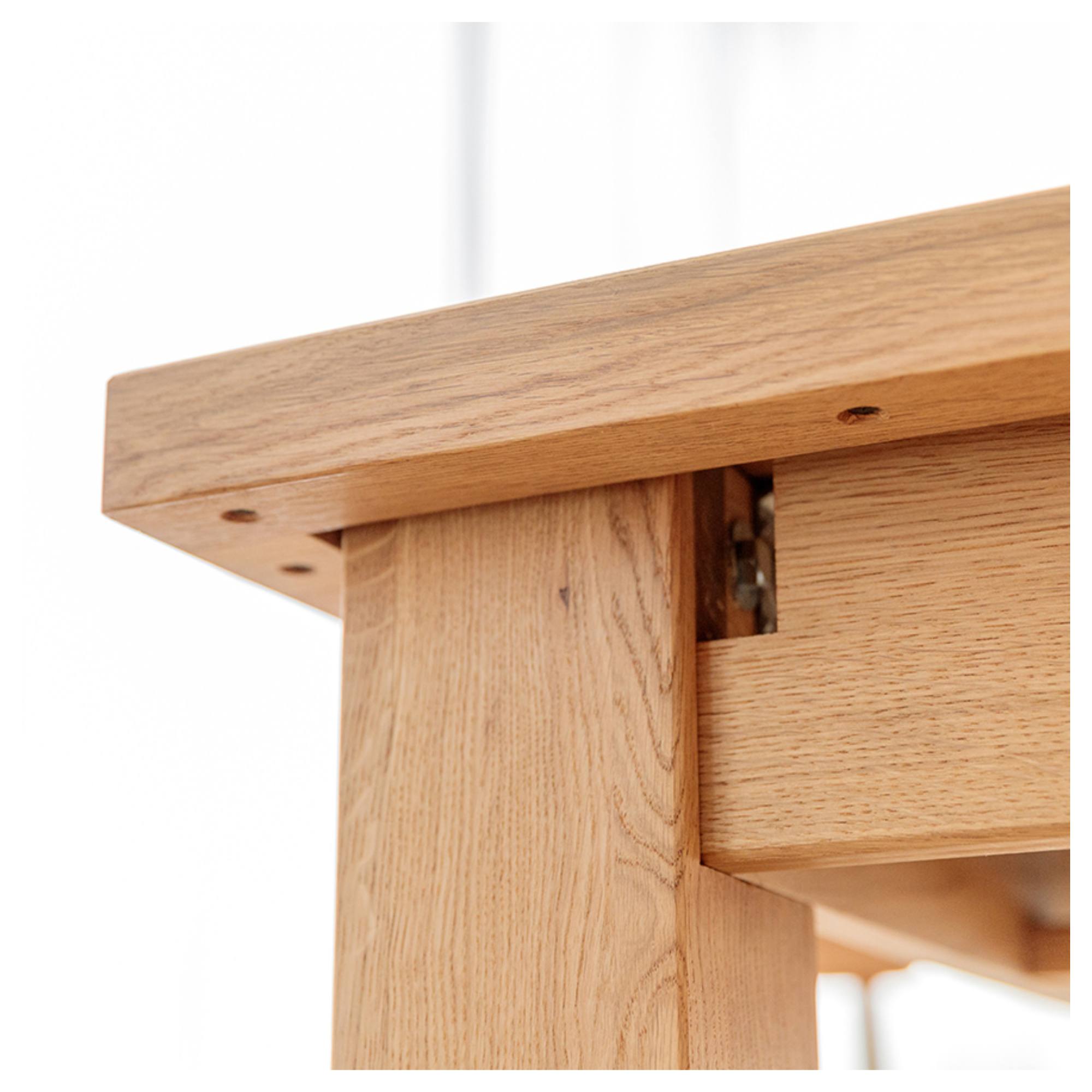 Jeho konštrukcia je vyrobená z masívneho dubového dreva s prirodzenou kresbou, ktorá robí každý kus jedinečným. Jeho olejovaný povrch zaručuje dlhú životnosť, jednoduchú údržbu a umožňuje prípadnú renováciu. Vďaka možnosti rozšírenia dosky o 90 cm môžete naraz usadiť aj väčšiu skupinu a dopriať si príjemne strávený čas s rodinou či priateľmi.