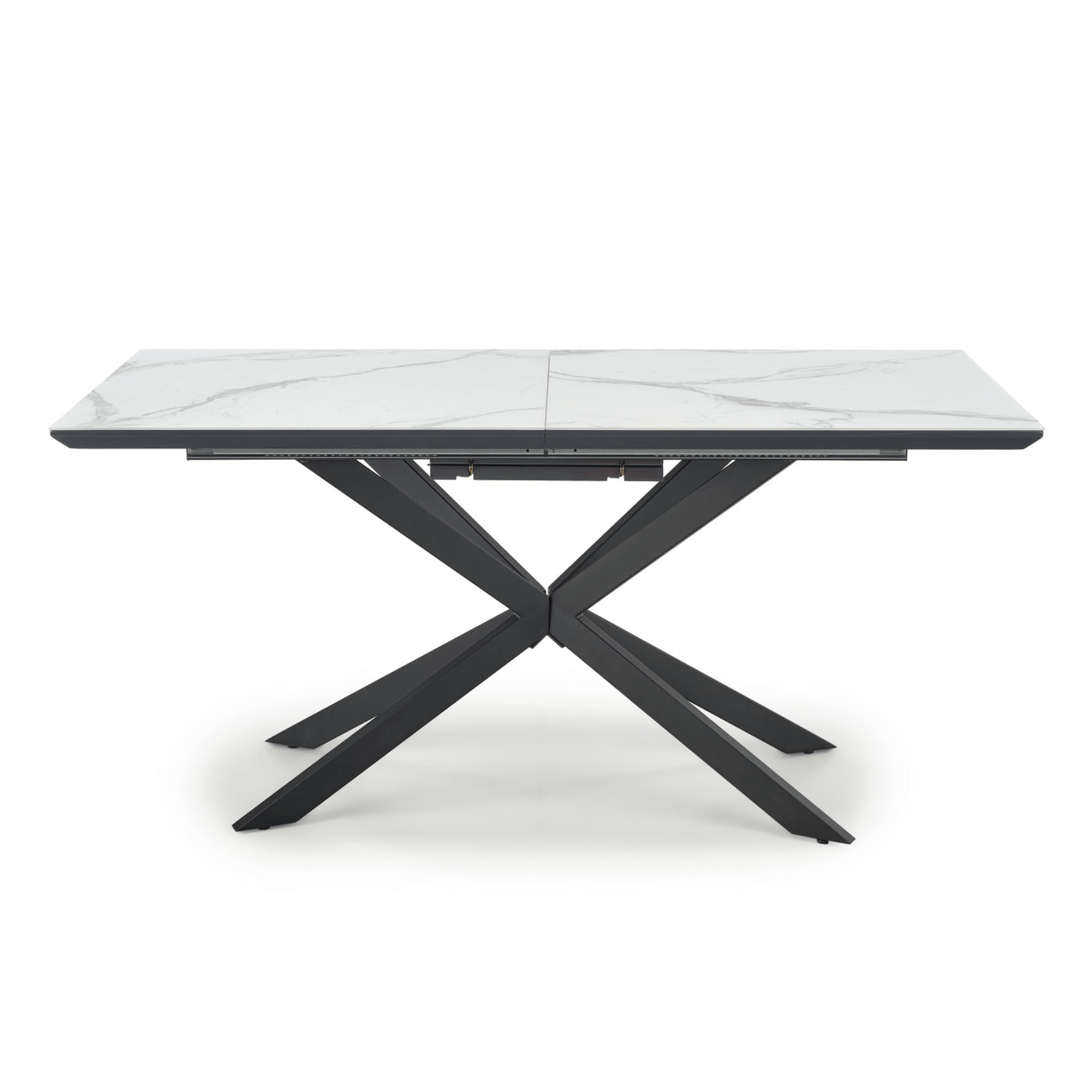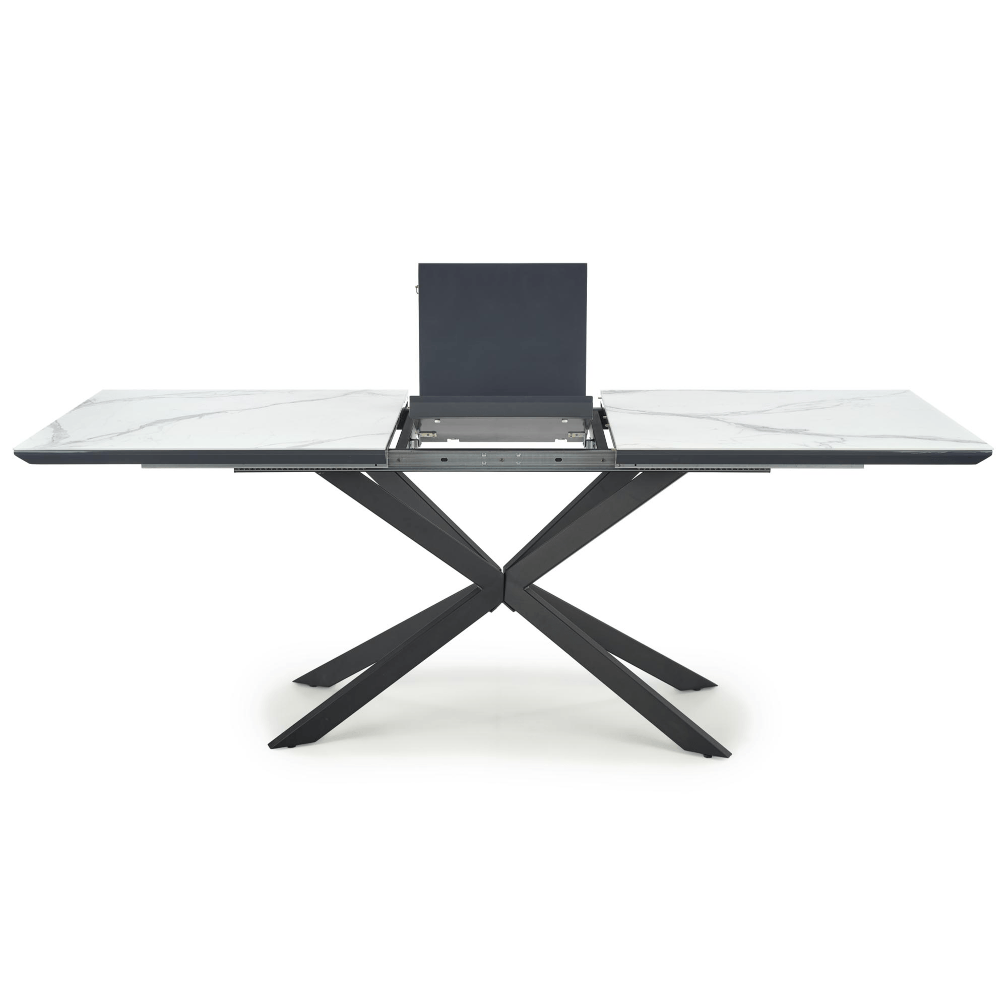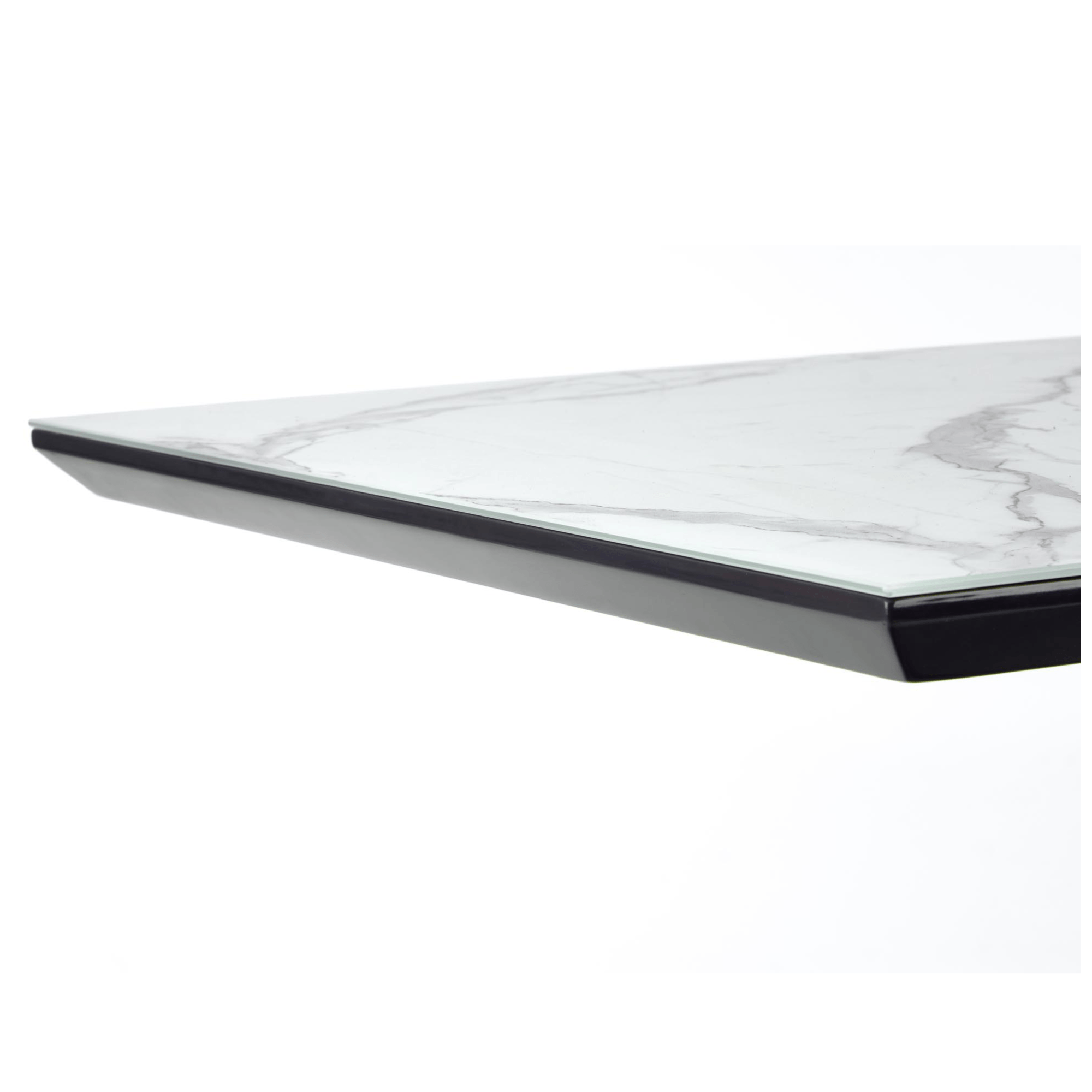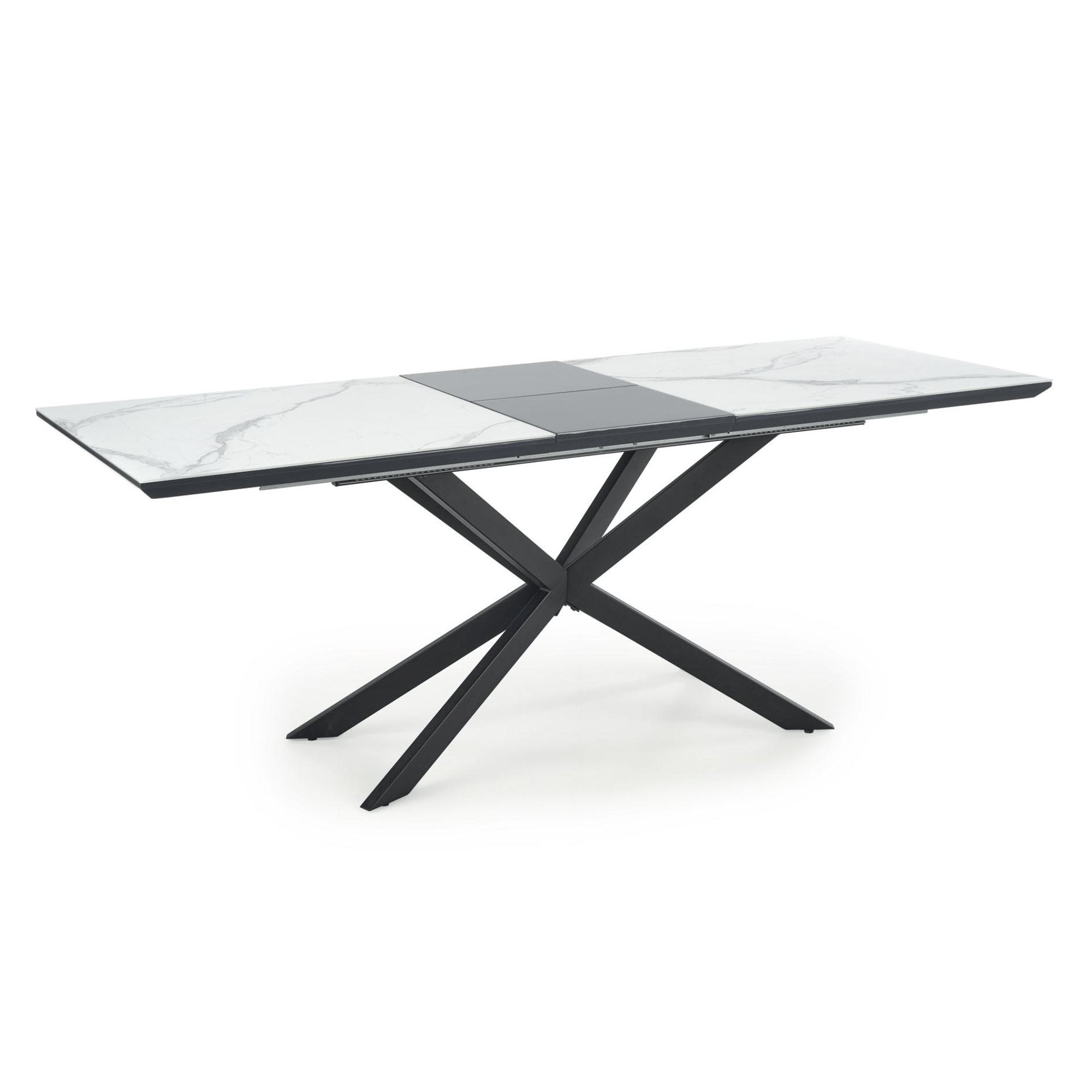 Doska stola je vyrobená v kombinácii drevovláknitého materiálu MDF a keramiky. Ladená je do dekora bieleho mramoru. Maximálnu stabilitu zaisťuje dekoratívna hviezdicová podnož z kovu v čiernom práškovom laku. Komfort stolovania je podporený rozkladacou funkciou na dostatočných 200 cm. Nosnosť je 40 kg.