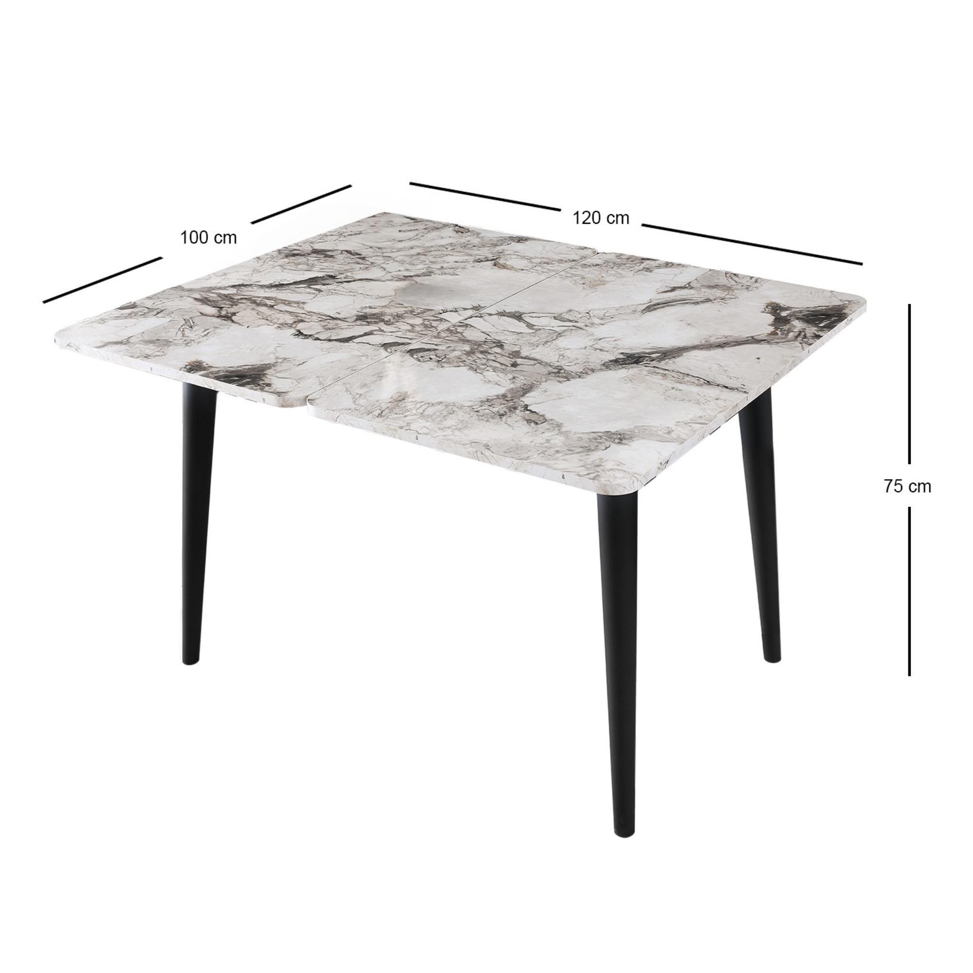 Šírku hornej dosky je možné zväčšiť zo 100 na 120 cm a jej hĺbku zo 60 na 100 cm. Nosnosť jedálenského stola DOLUNAY je 100 kg.