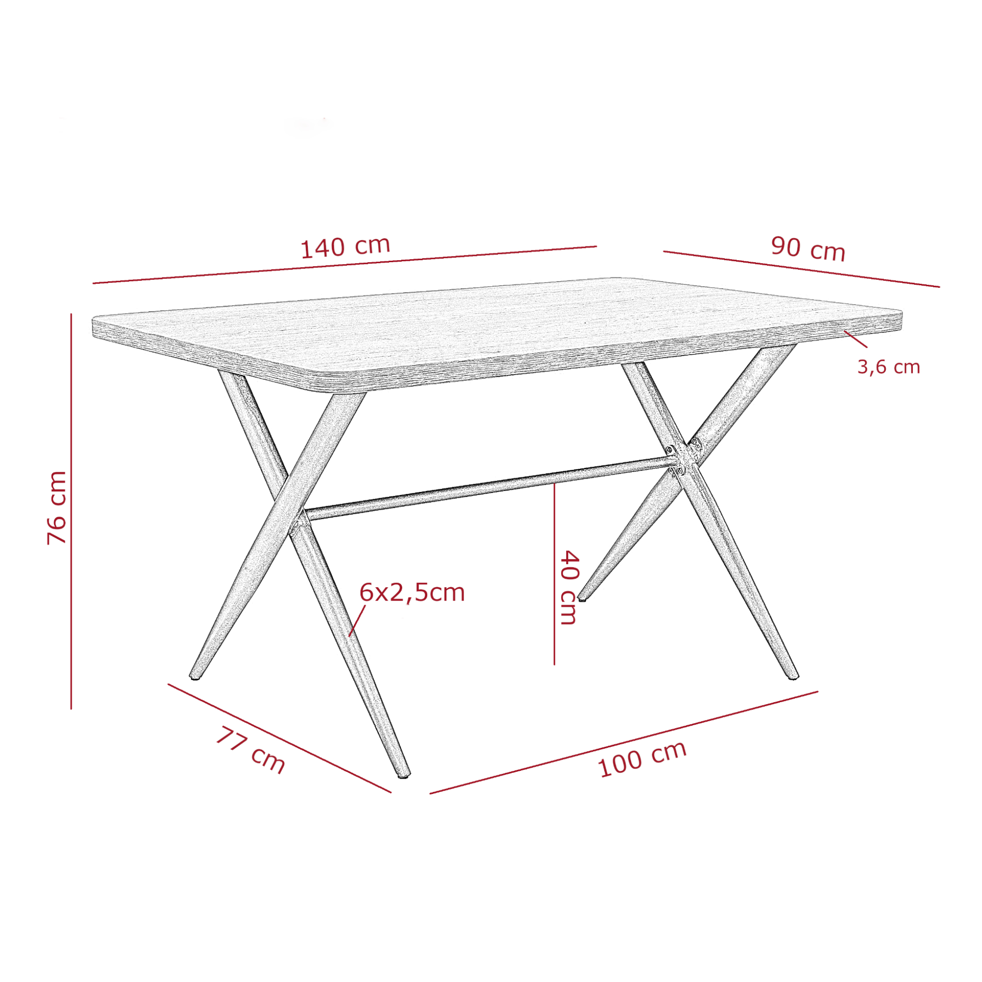 Stôl stojí na pevných a stabilných prekrížených nohách, ktoré sú vyrobené z kovu. Horná doska je vyrobená z laminovaného drevotrieskového materiálu, ktorý je nenáročný na údržbu.