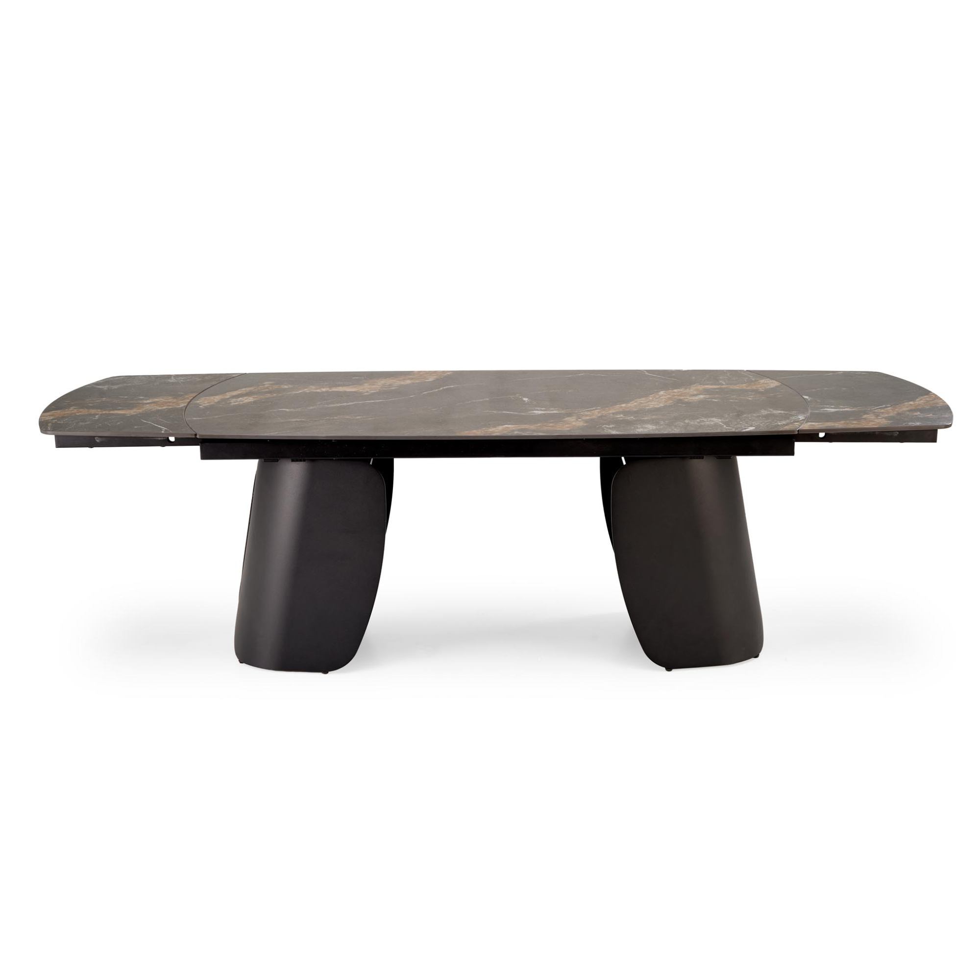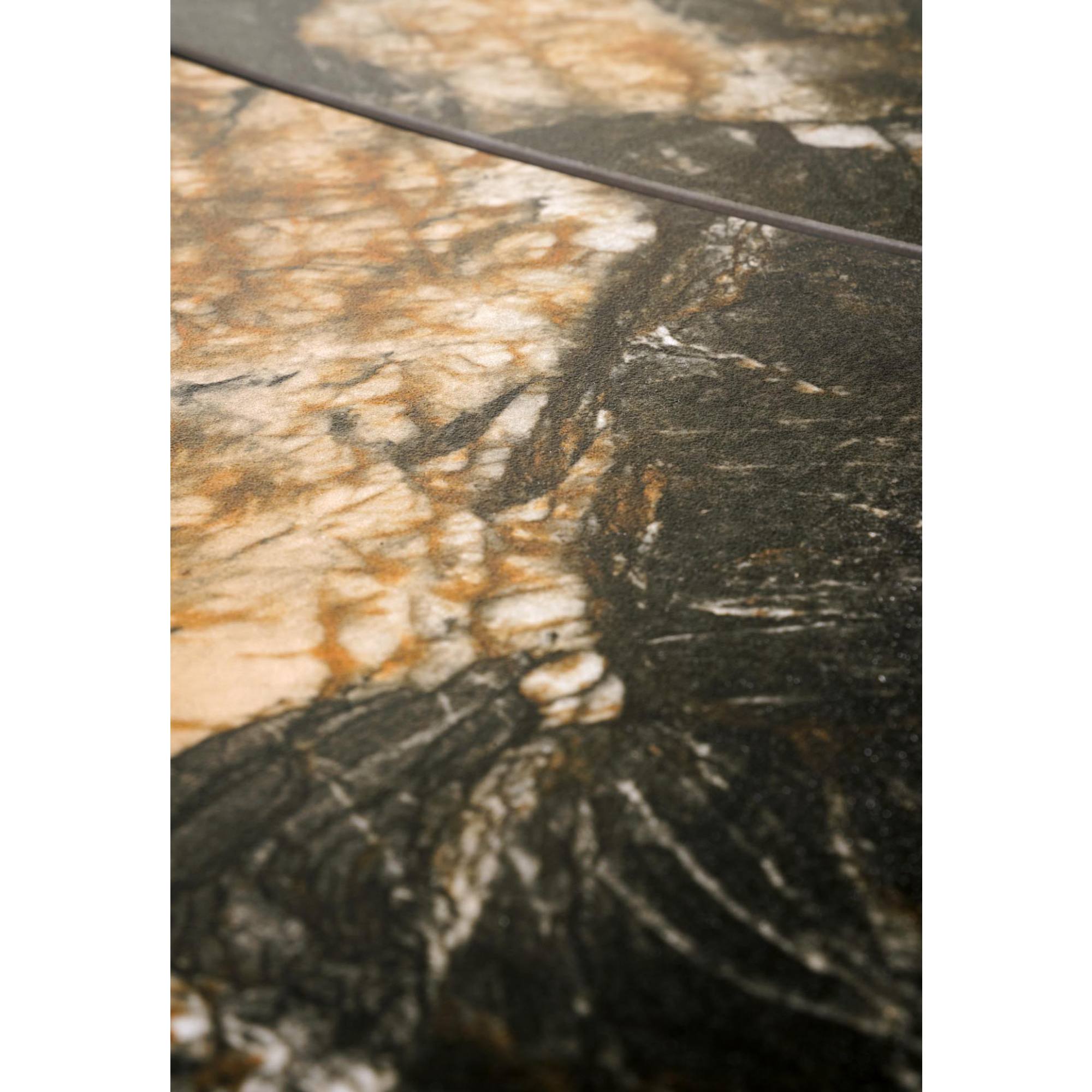 Stôl stojí na pevných nohách, ktoré sú vyrobené z práškovo lakovanej ocele. Nohy dopĺňa horná doska zo **spekaného kameňa zdobená štýlovým dekorom mramoru. Tieto materiály sú nenáročné na údržbu, takže starostlivosť o stôl nebude vyžadovať veľa času.