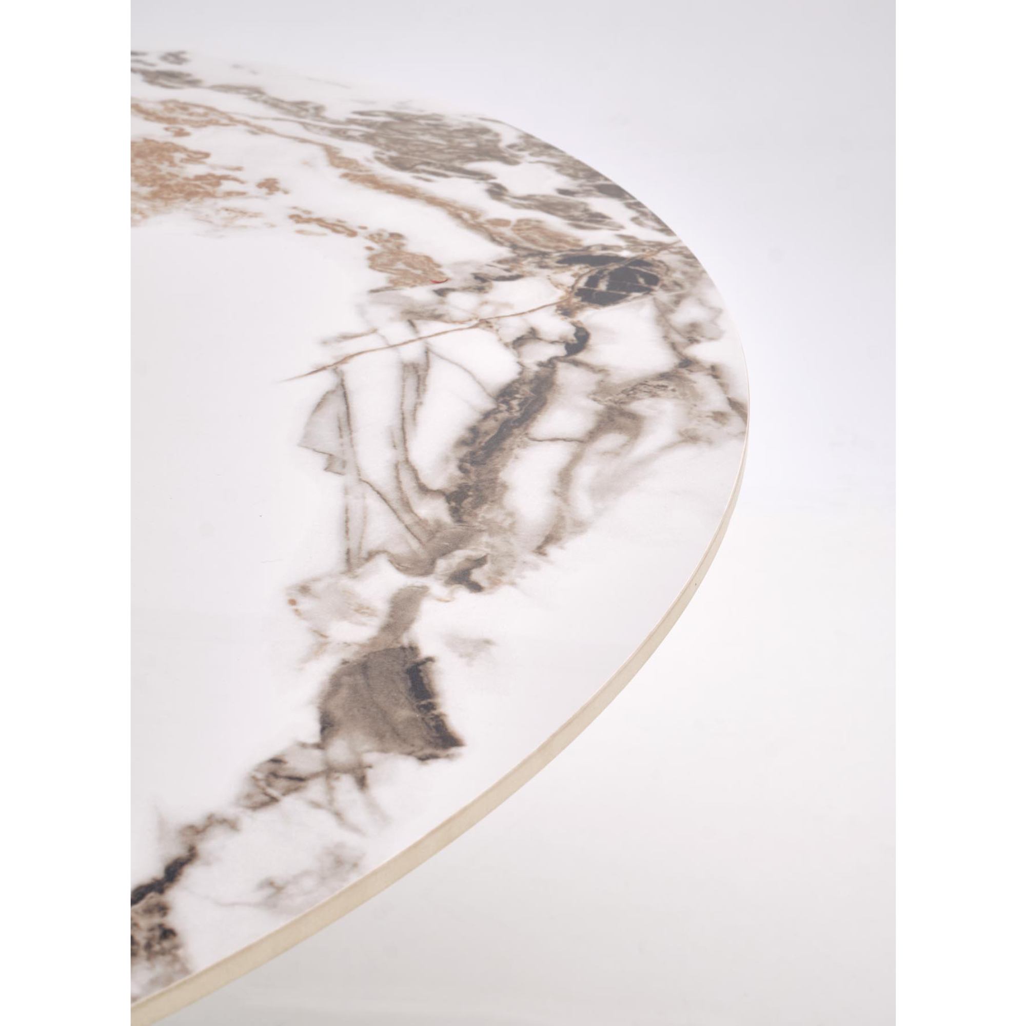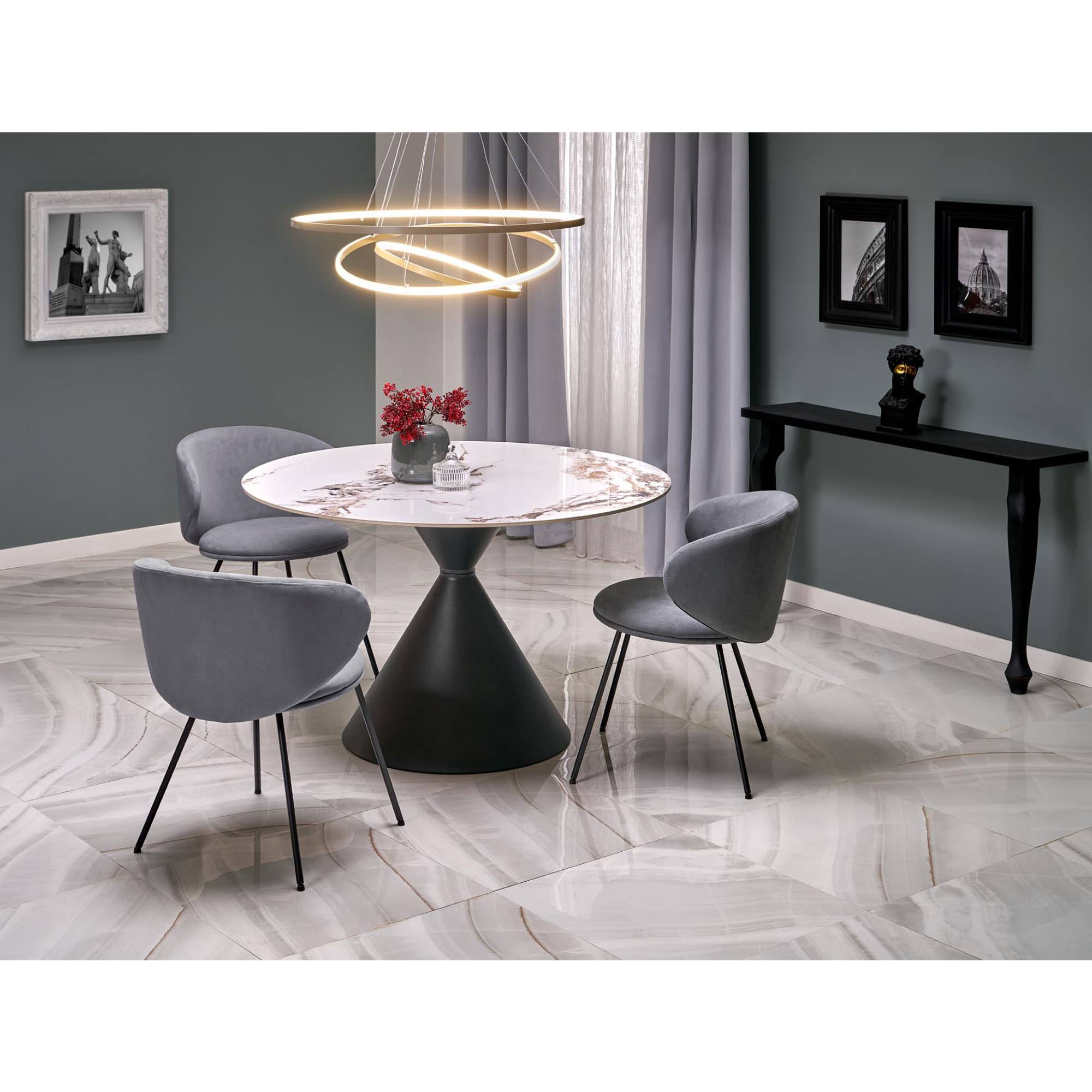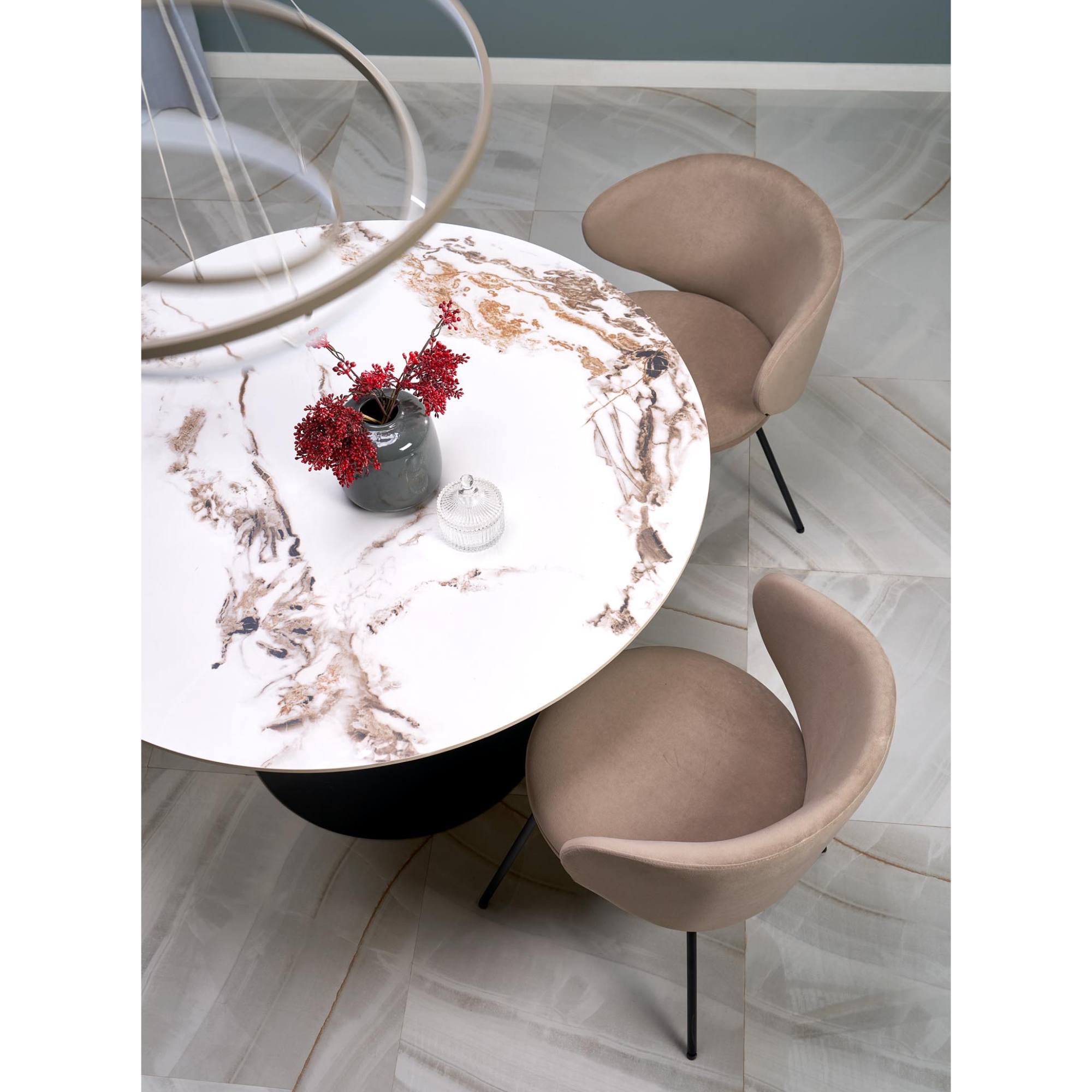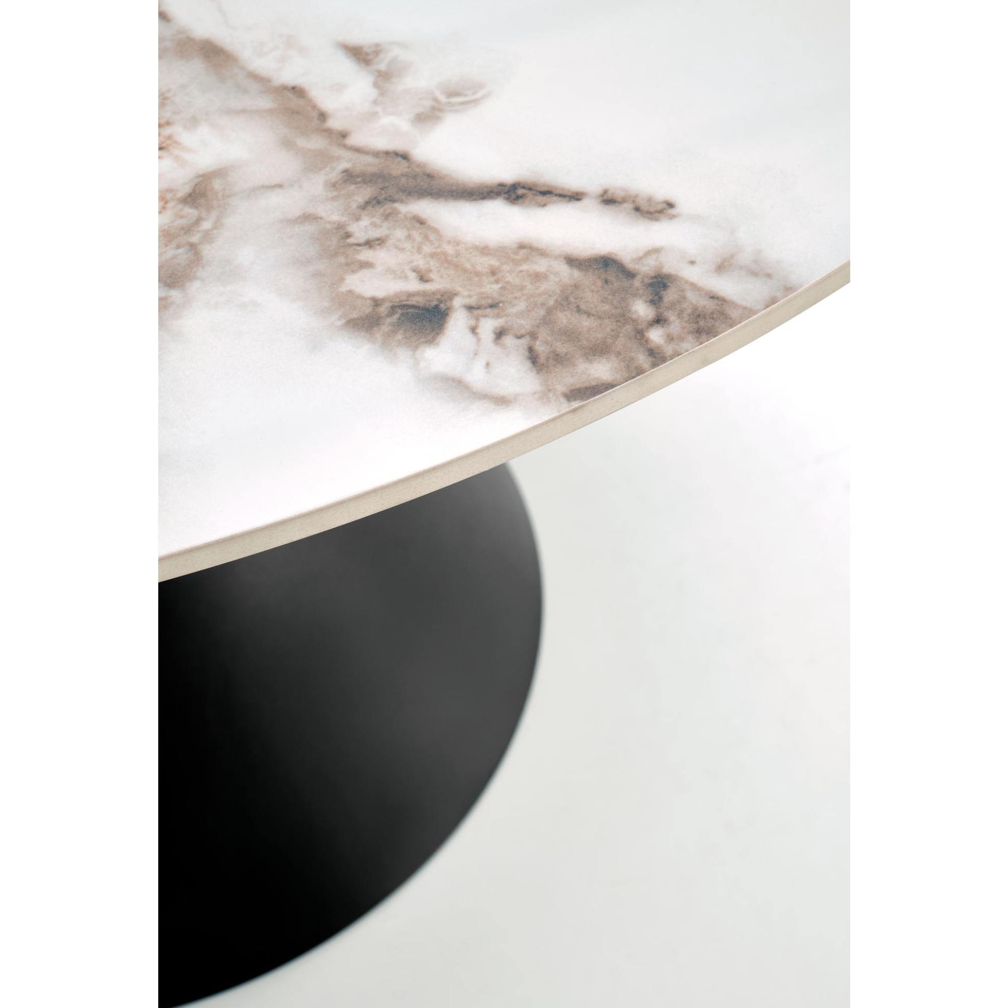 Okrúhla doska stola je vyrobená zo spekaného kameňa a zdobí ju štýlový dekor mramoru. Táto doska je odolná nielen voči poškriabaniu a vlhkosti, ale aj voči vysokým teplotám. Stredová noha je z ocele a jej povrch je opatrený práškovým nástrekom.