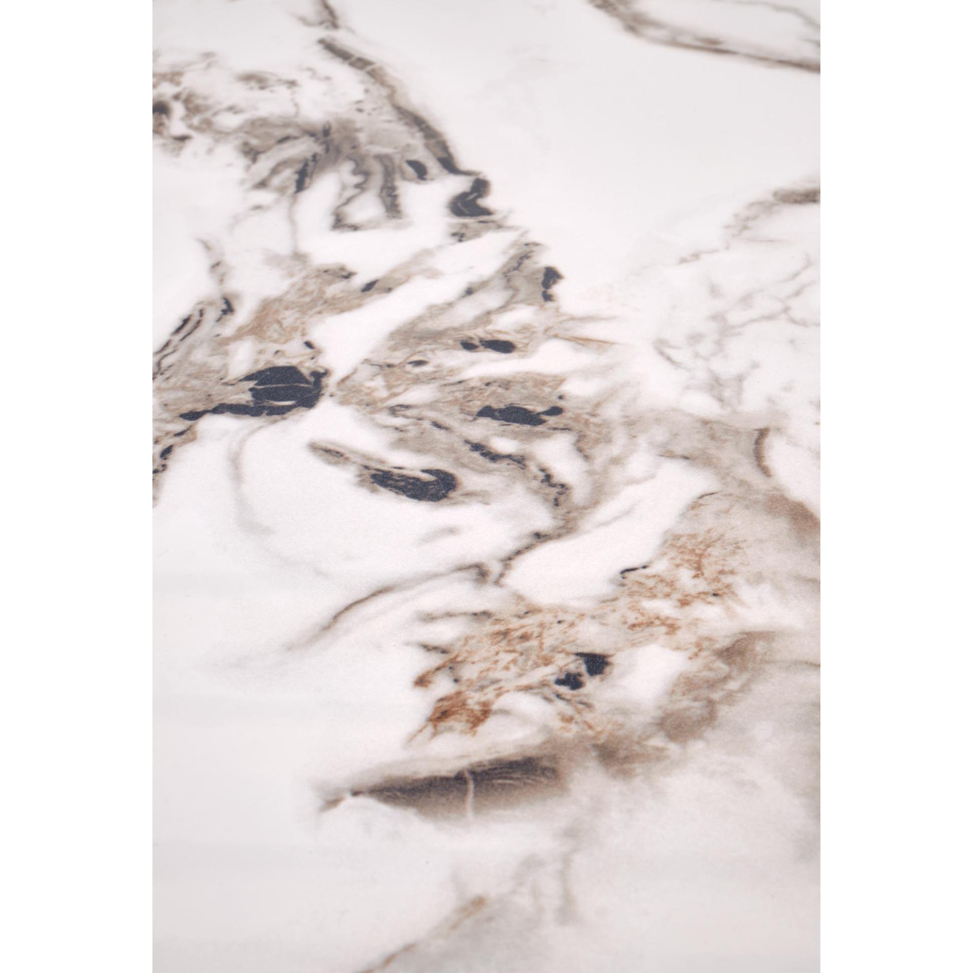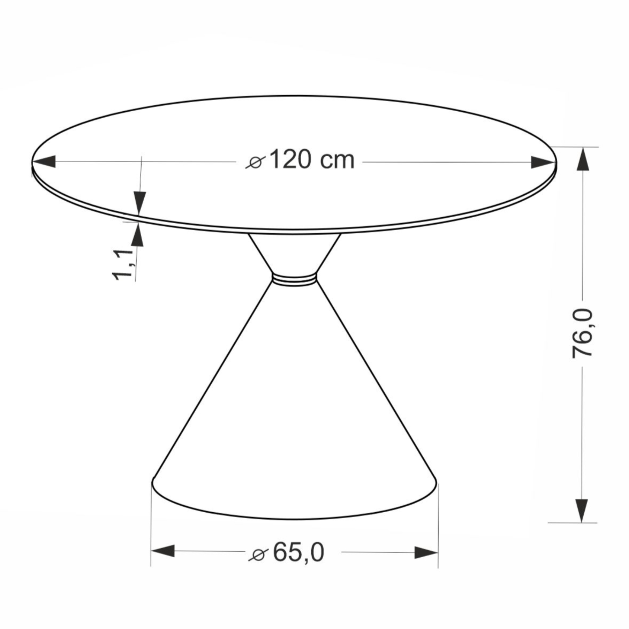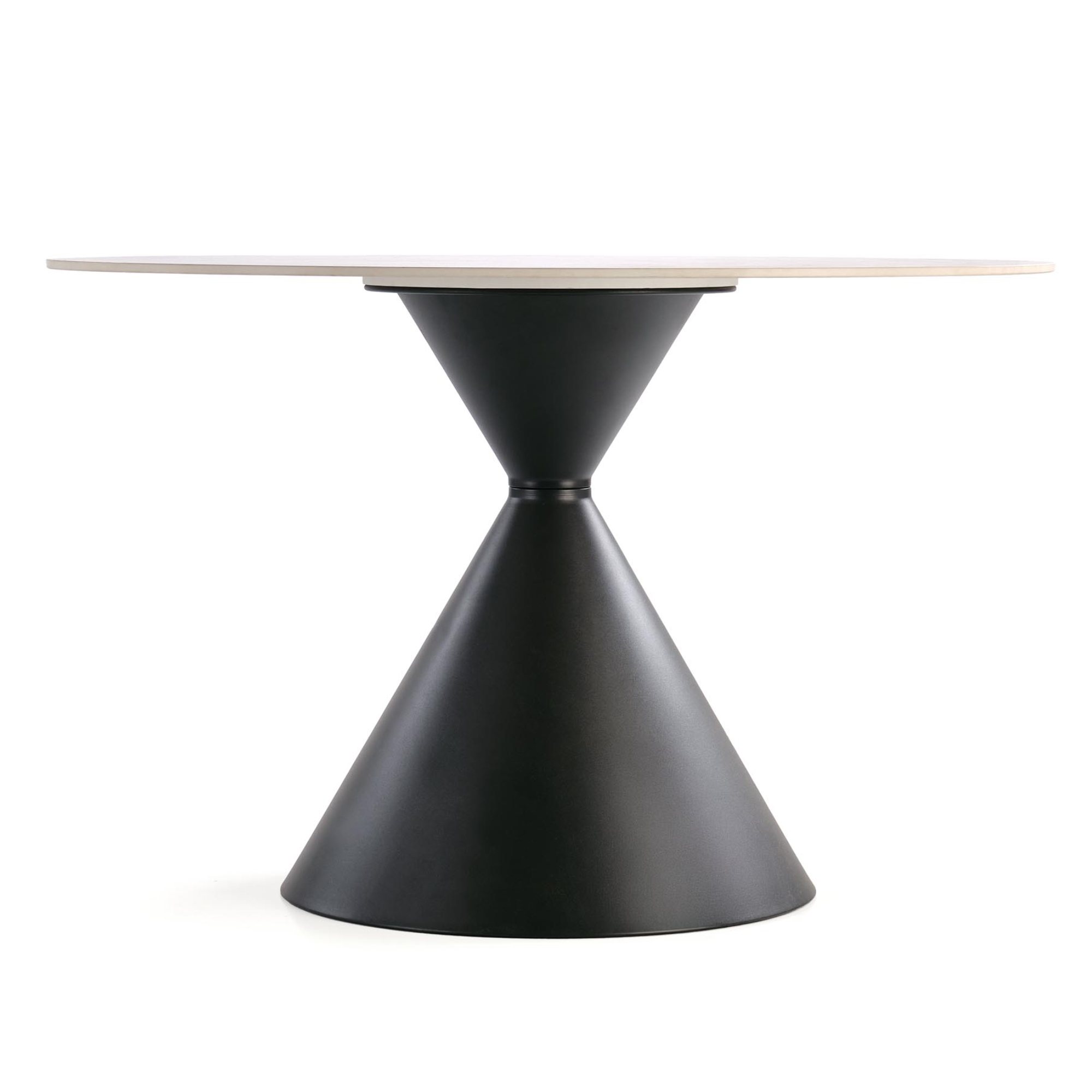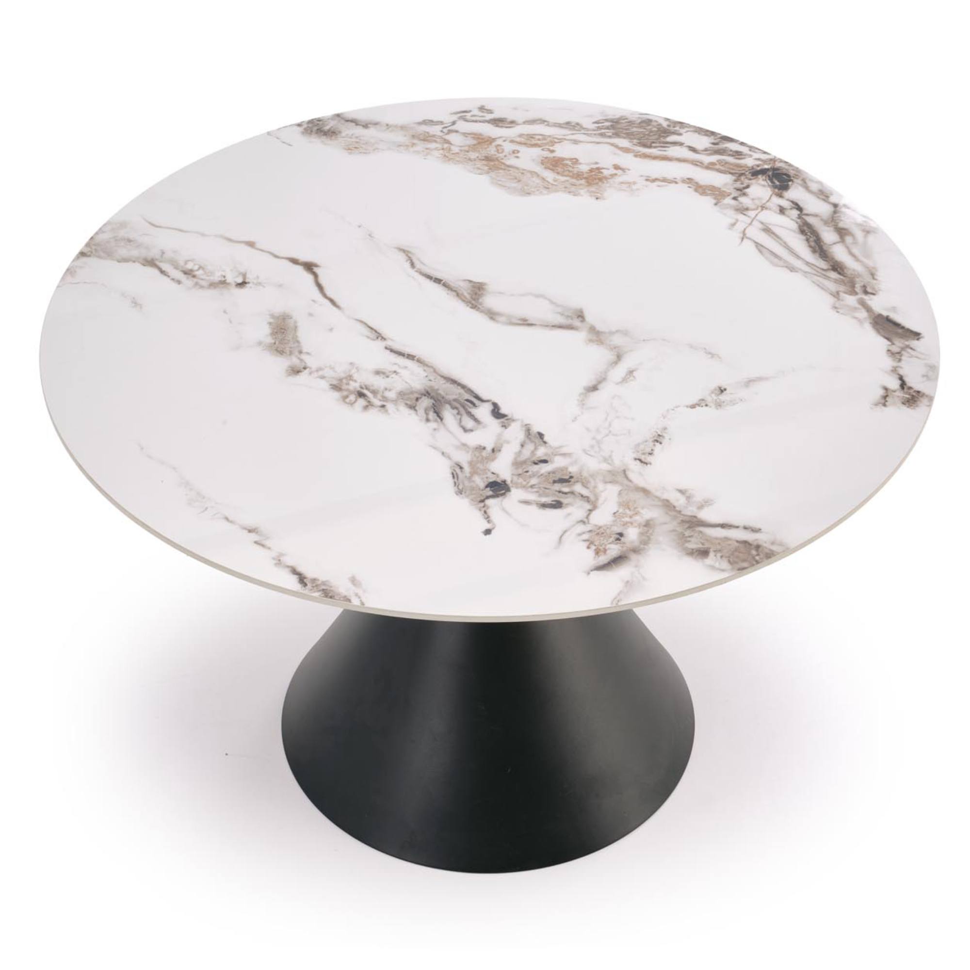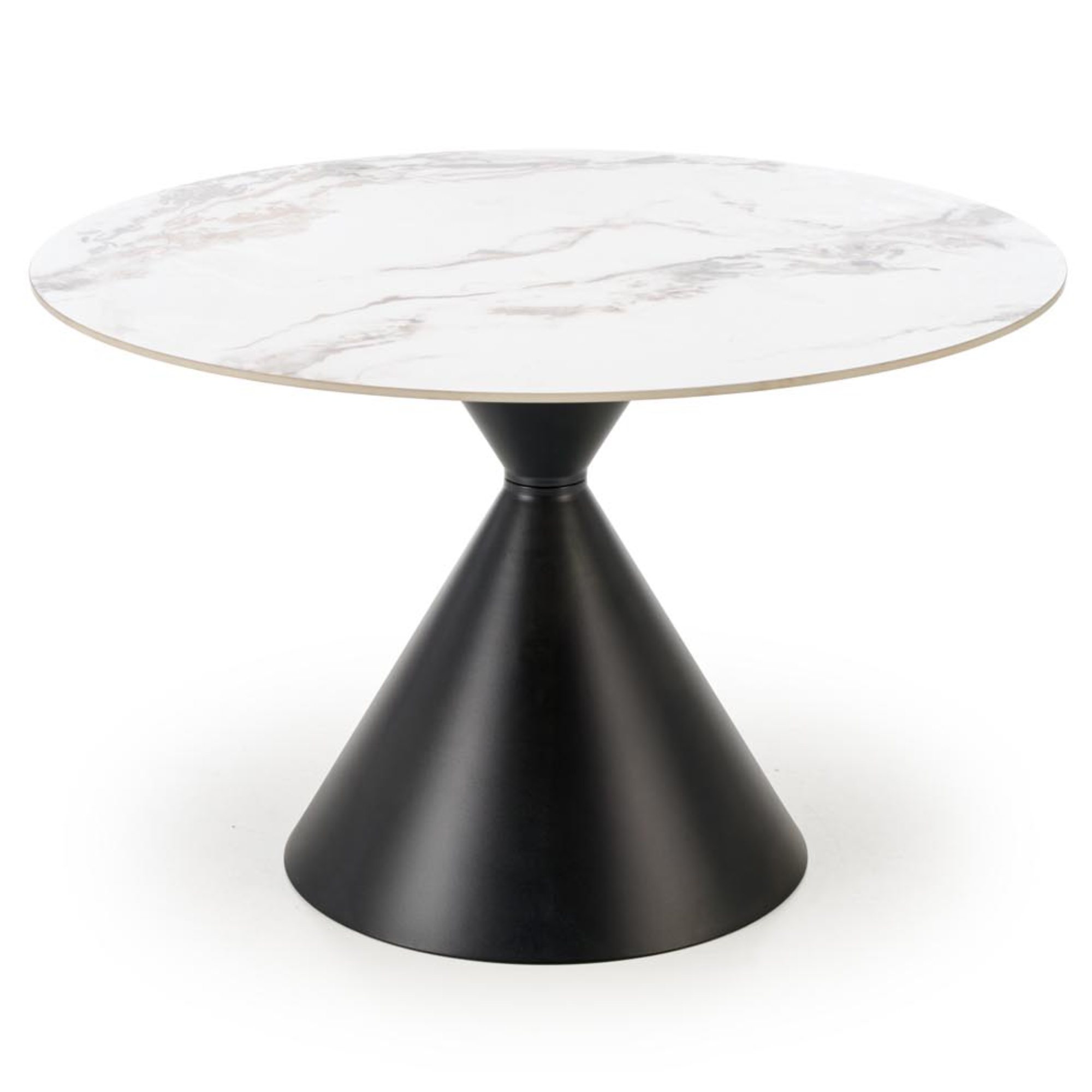 Okrúhla doska stola je vyrobená zo spekaného kameňa a zdobí ju štýlový dekor mramoru. Táto doska je odolná nielen voči poškriabaniu a vlhkosti, ale aj voči vysokým teplotám. Stredová noha je z ocele a jej povrch je opatrený práškovým nástrekom.