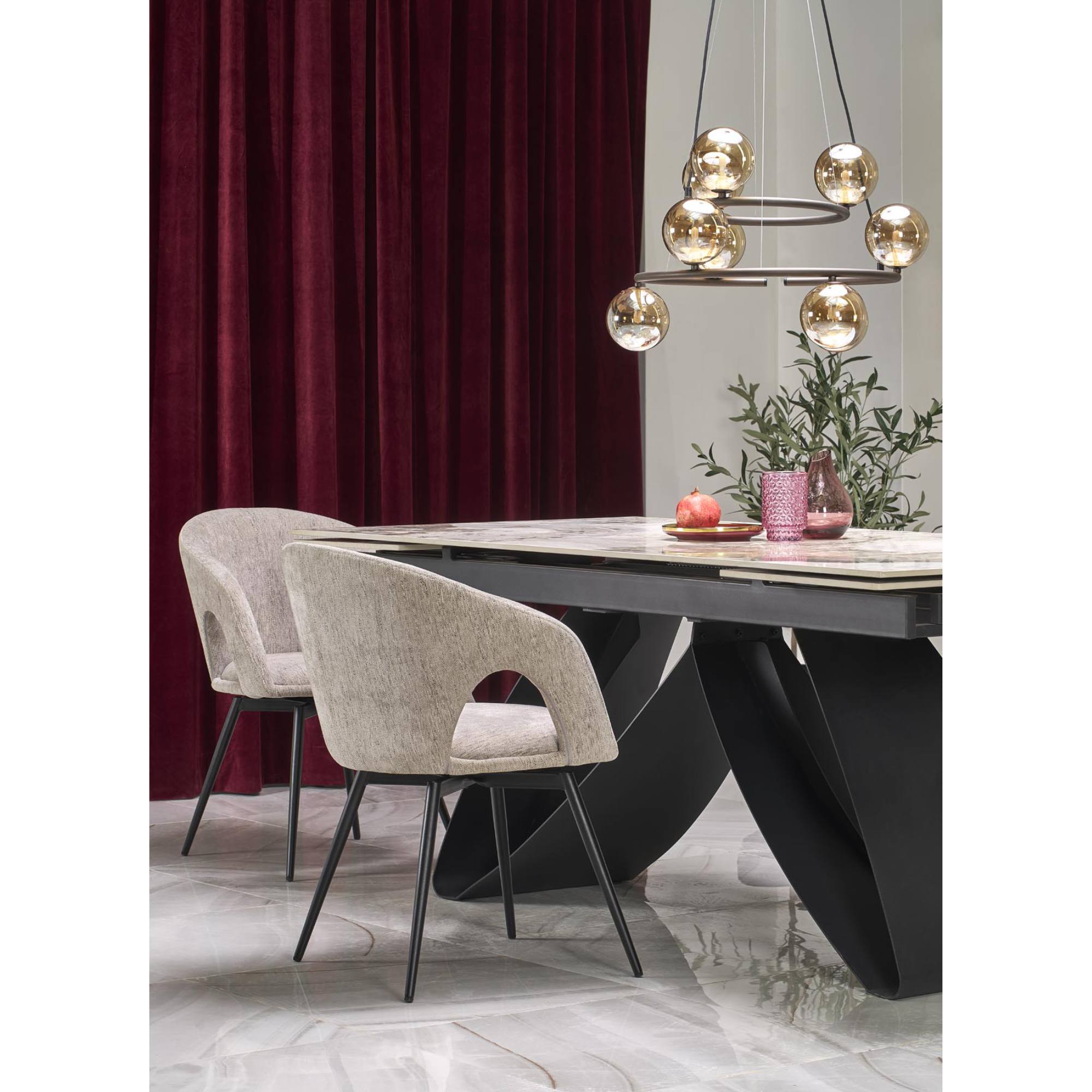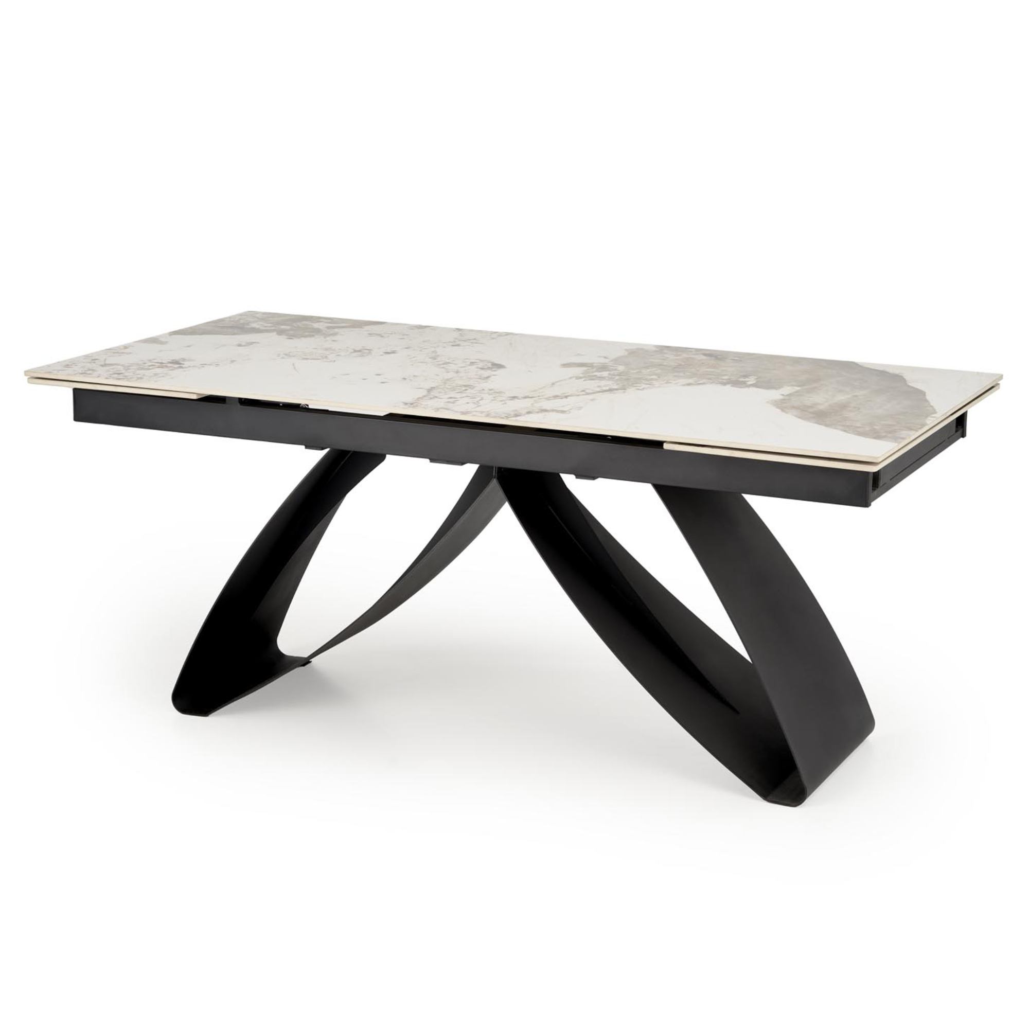 Pevná a stabilná konštrukcia stola je vyrobená z kovu a jej povrch je pokrytý práškovým nástrekom. Doska je zo spekaného kameňa.