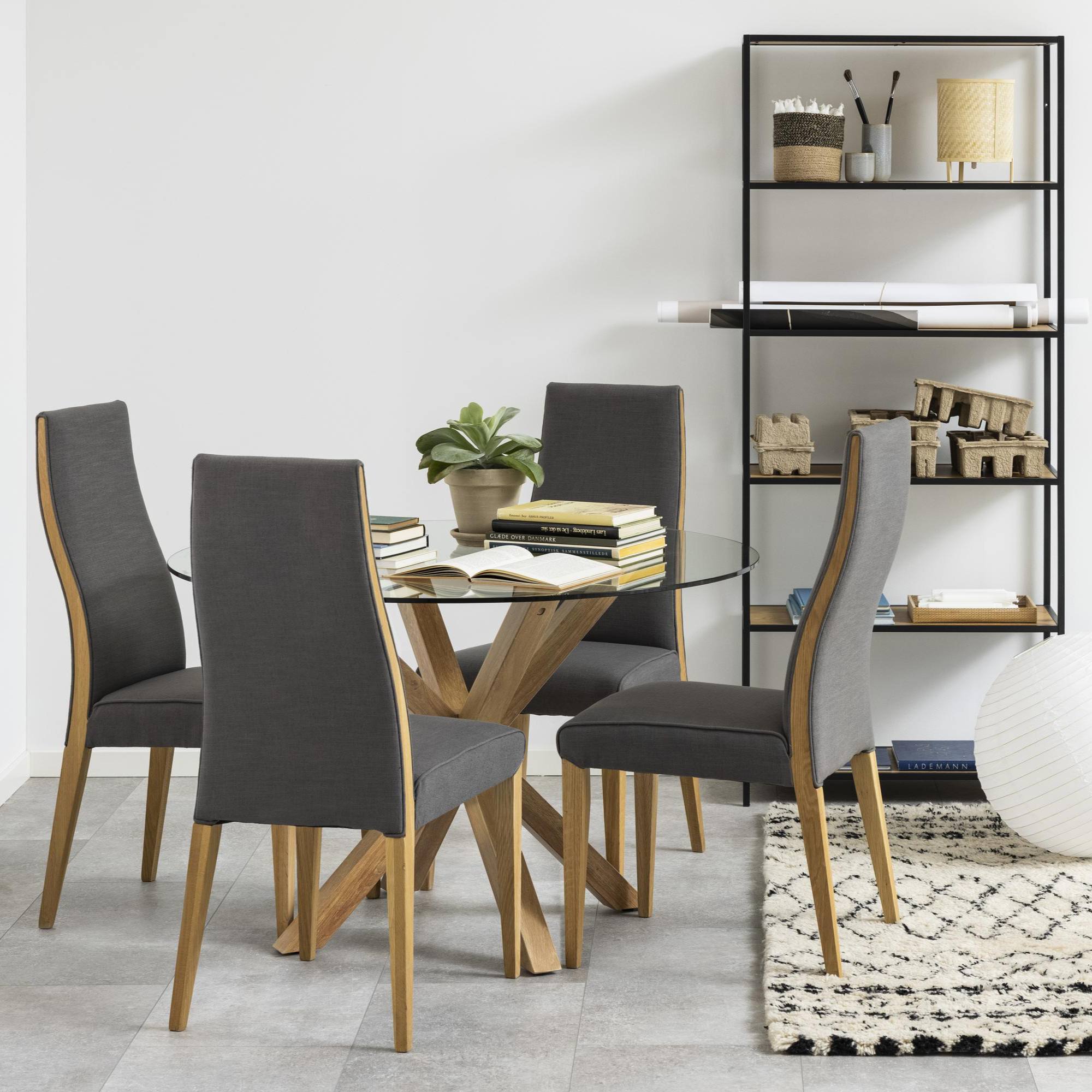 Stôl disponuje pevnými kovovými nohami pokrytými fóliou ozdobenou dekorom duba, ktoré sú zárukou jeho stability. Jeho doska je vyrobená z kvalitného tvrdeného skla.