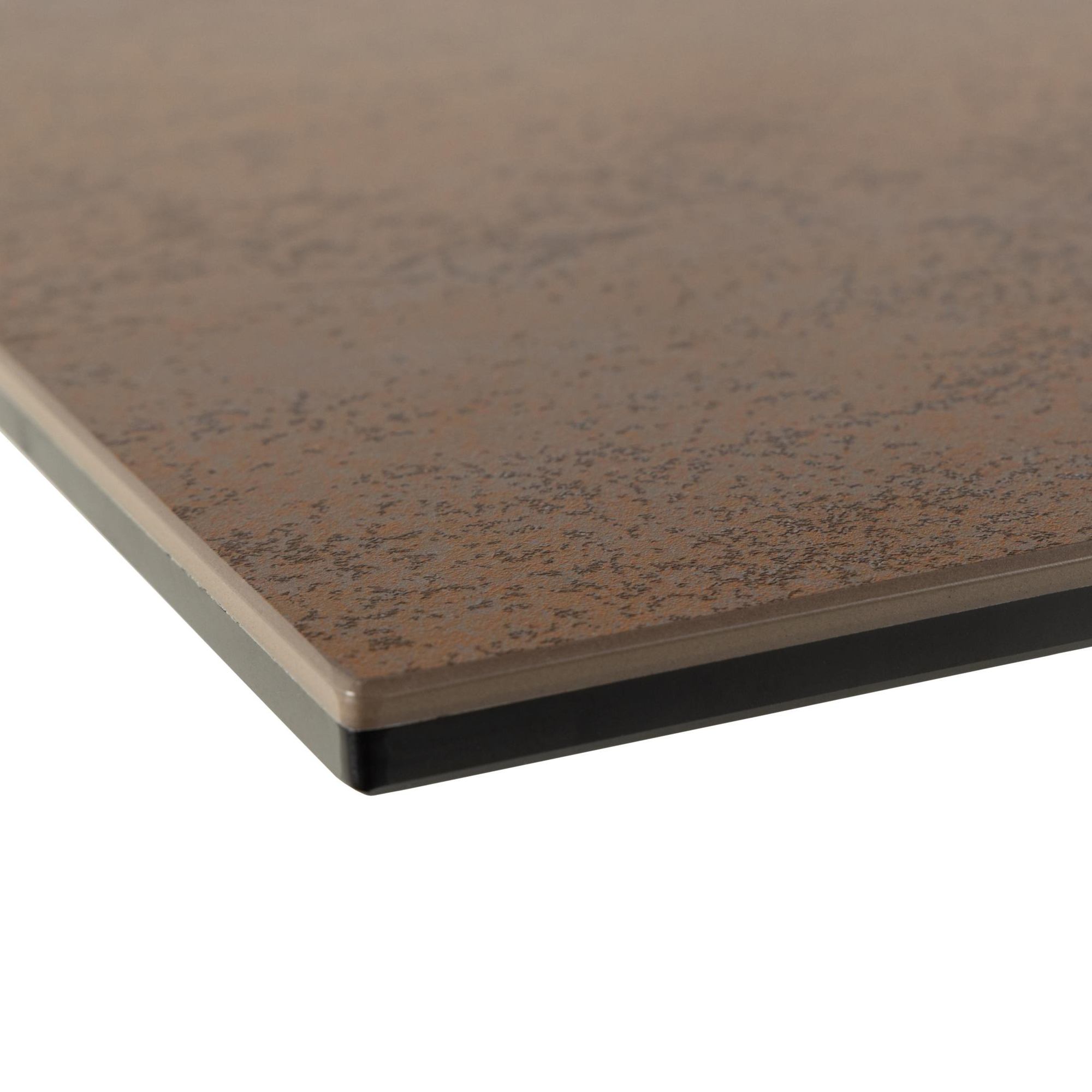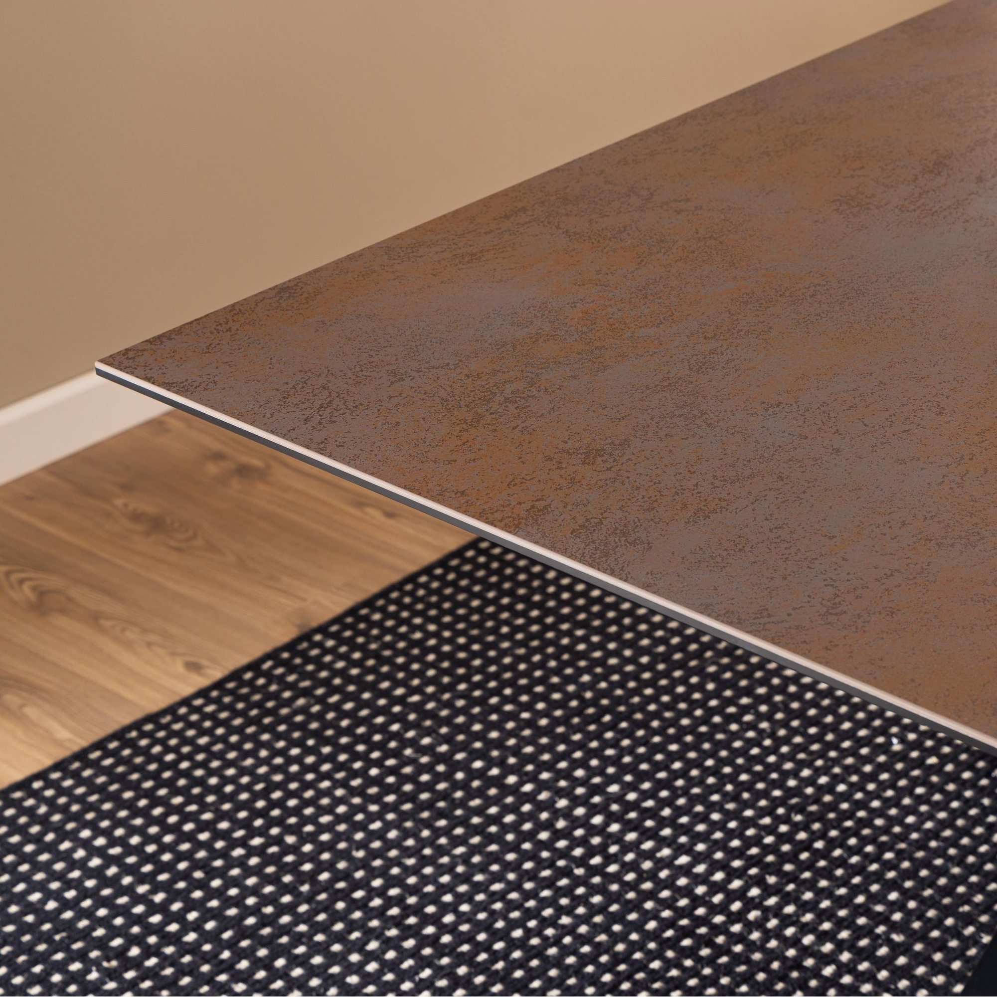 Stôl disponuje pevnými kovovými nohami pokrytými matným lakom, ktoré sú zárukou jeho stability. Jeho doska je vyrobená z keramiky a je odolná voči teplu. Tieto materiály sú nenáročné na údržbu, a tak starostlivosť o stôl bez problémov zvládnete.