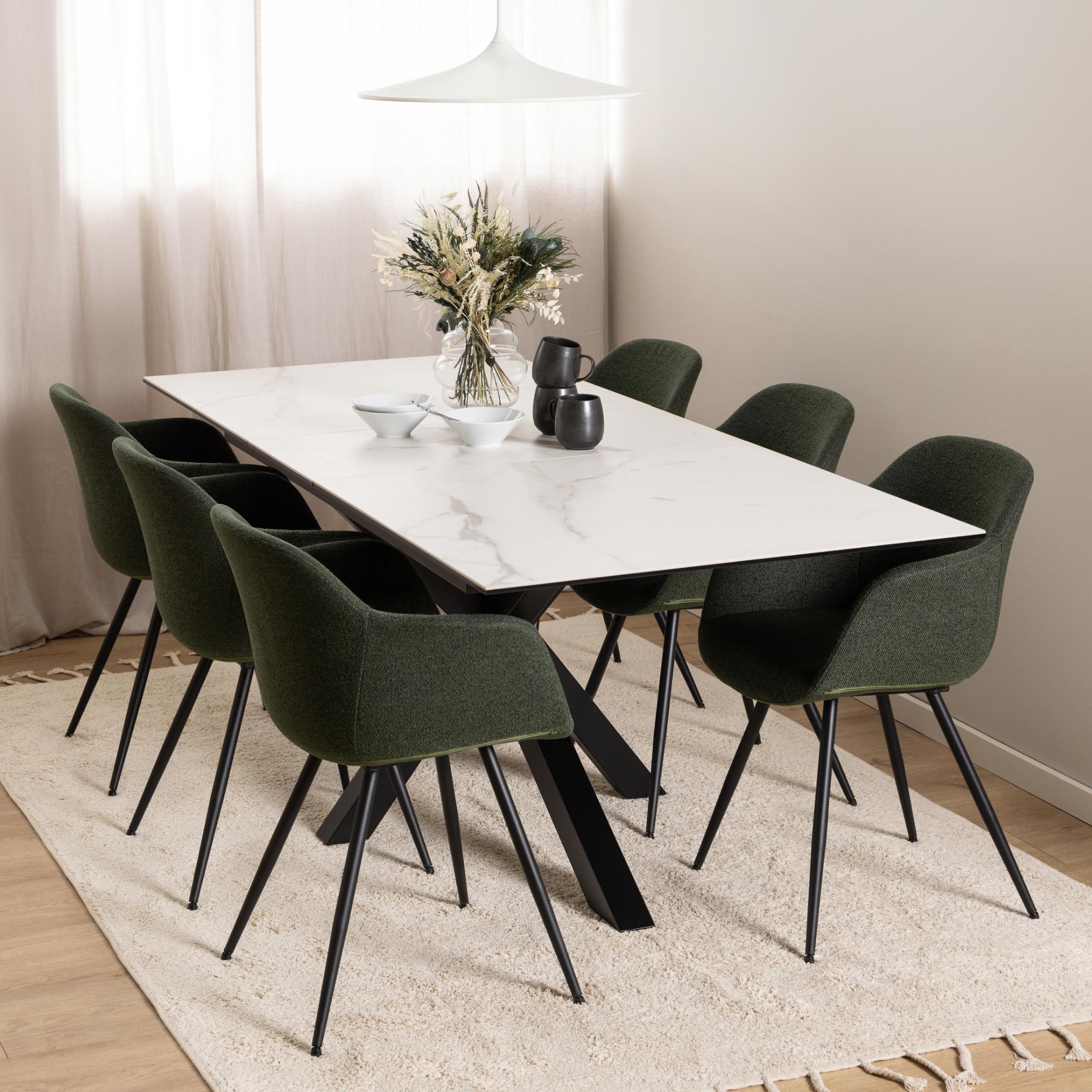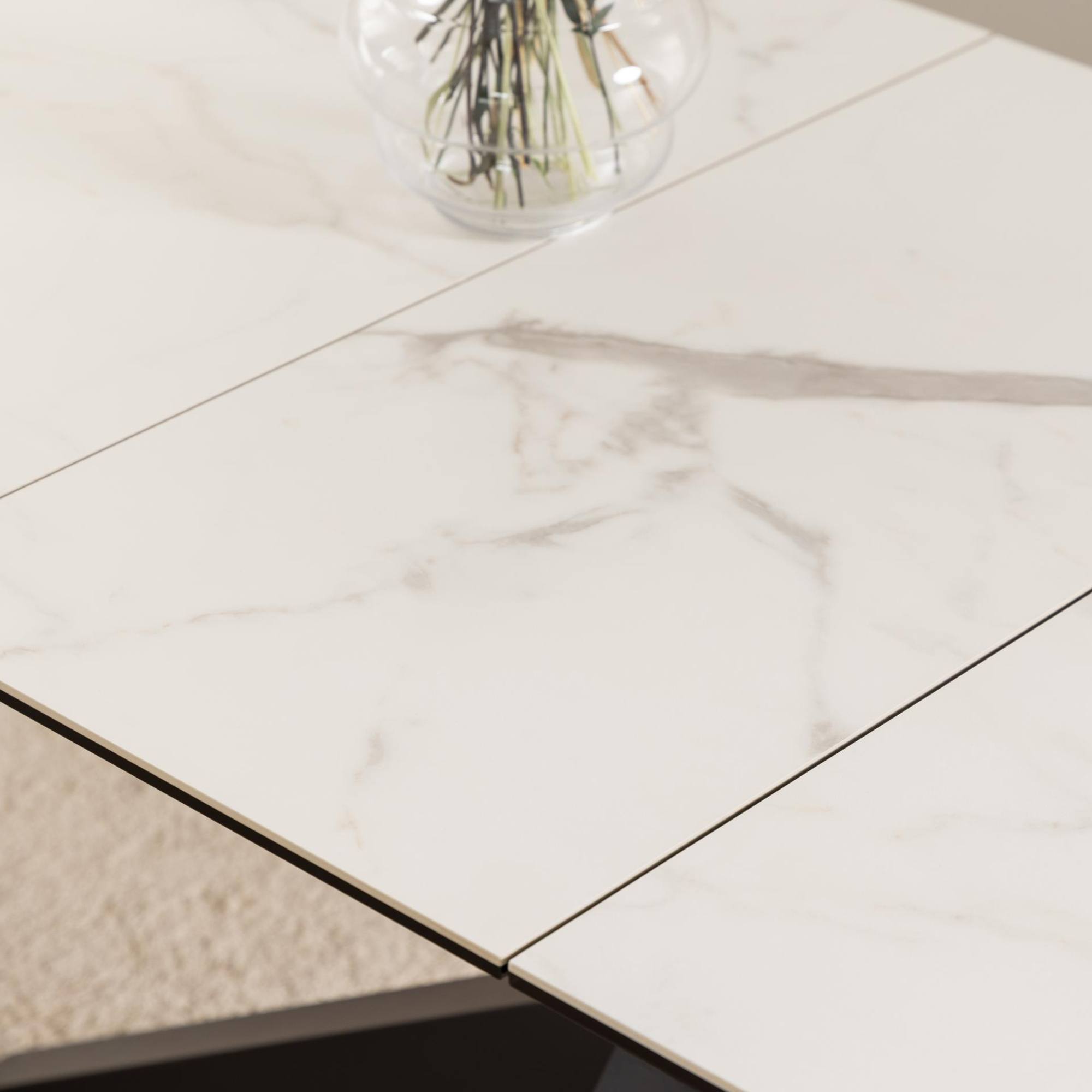 Stôl disponuje pevnými kovovými nohami pokrytými matným lakom, ktoré sú zárukou jeho stability. Jeho doska je vyrobená z keramiky a je odolná voči teplu. Tieto materiály sú nenáročné na údržbu, a tak starostlivosť o stôl bez problémov zvládnete.
