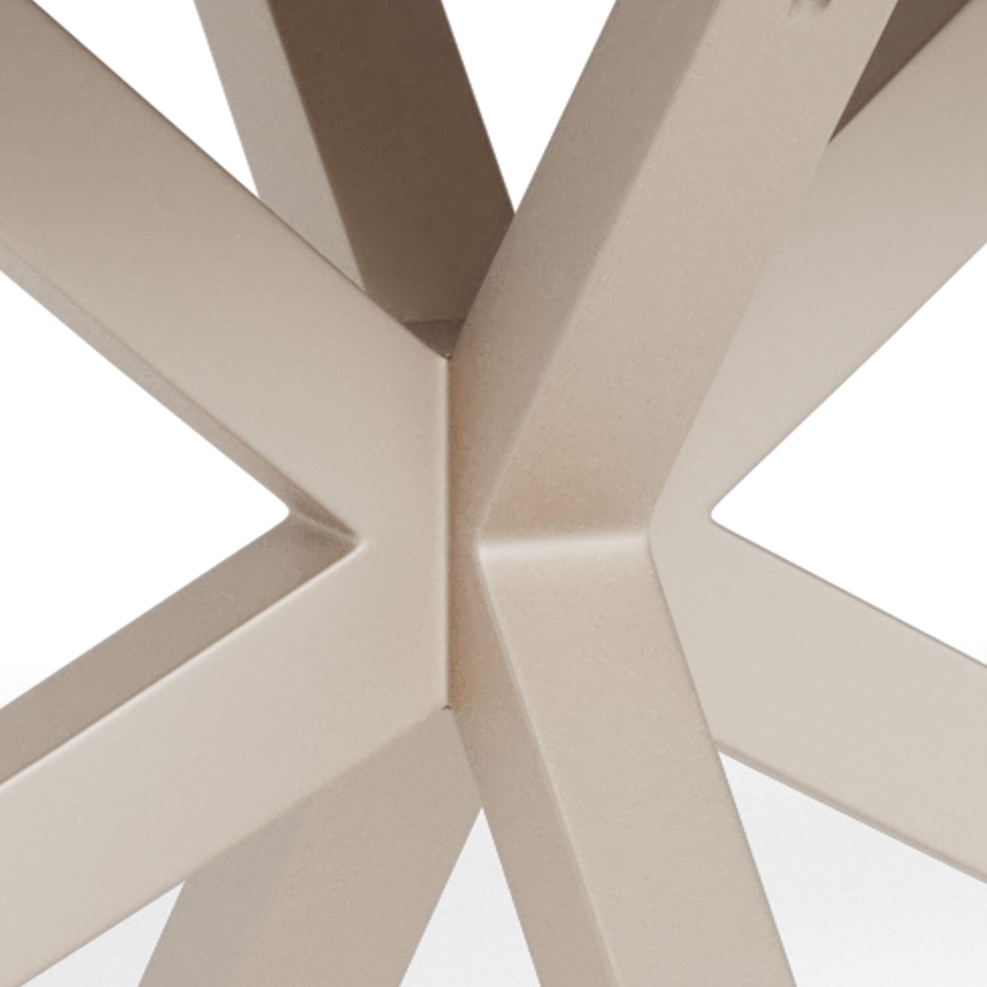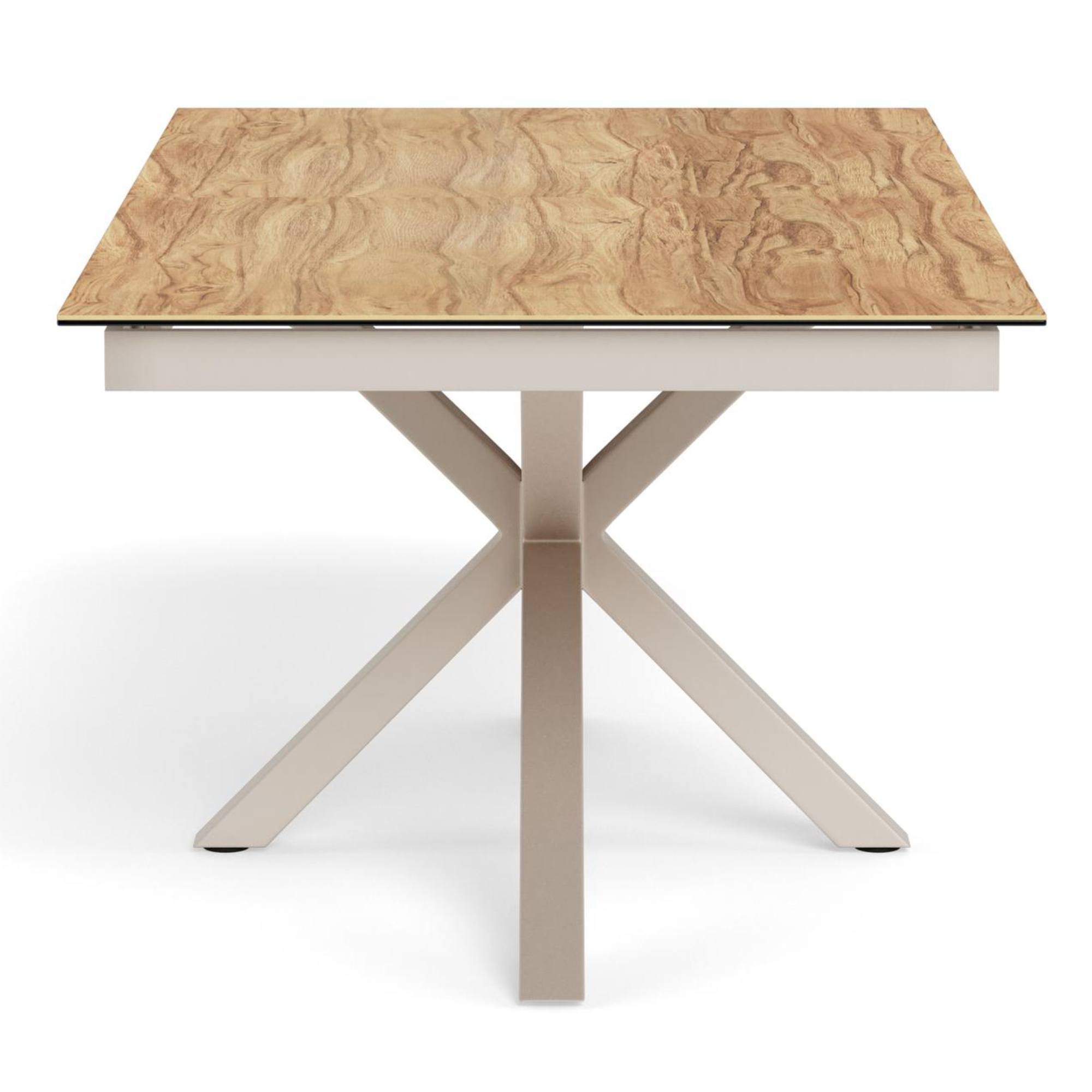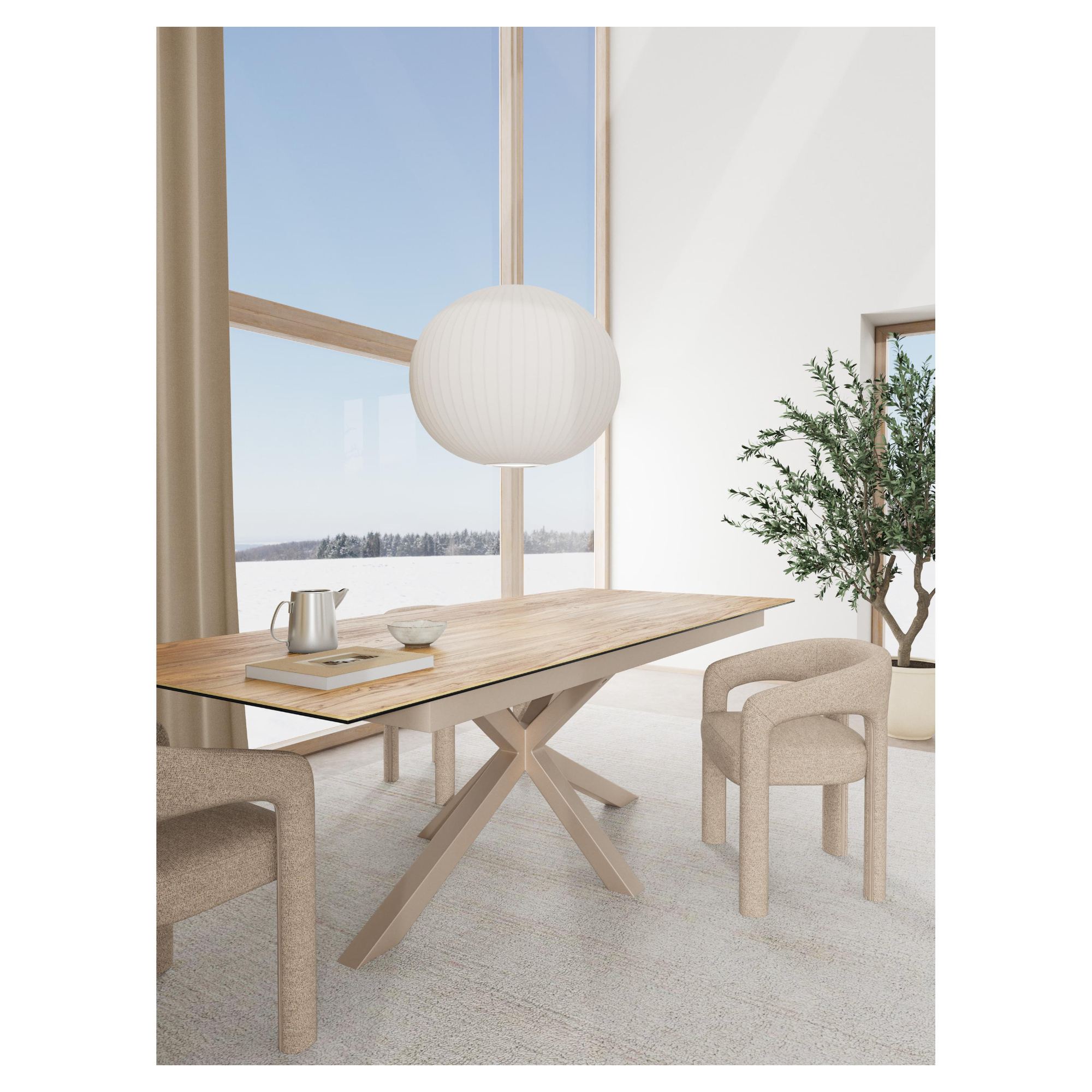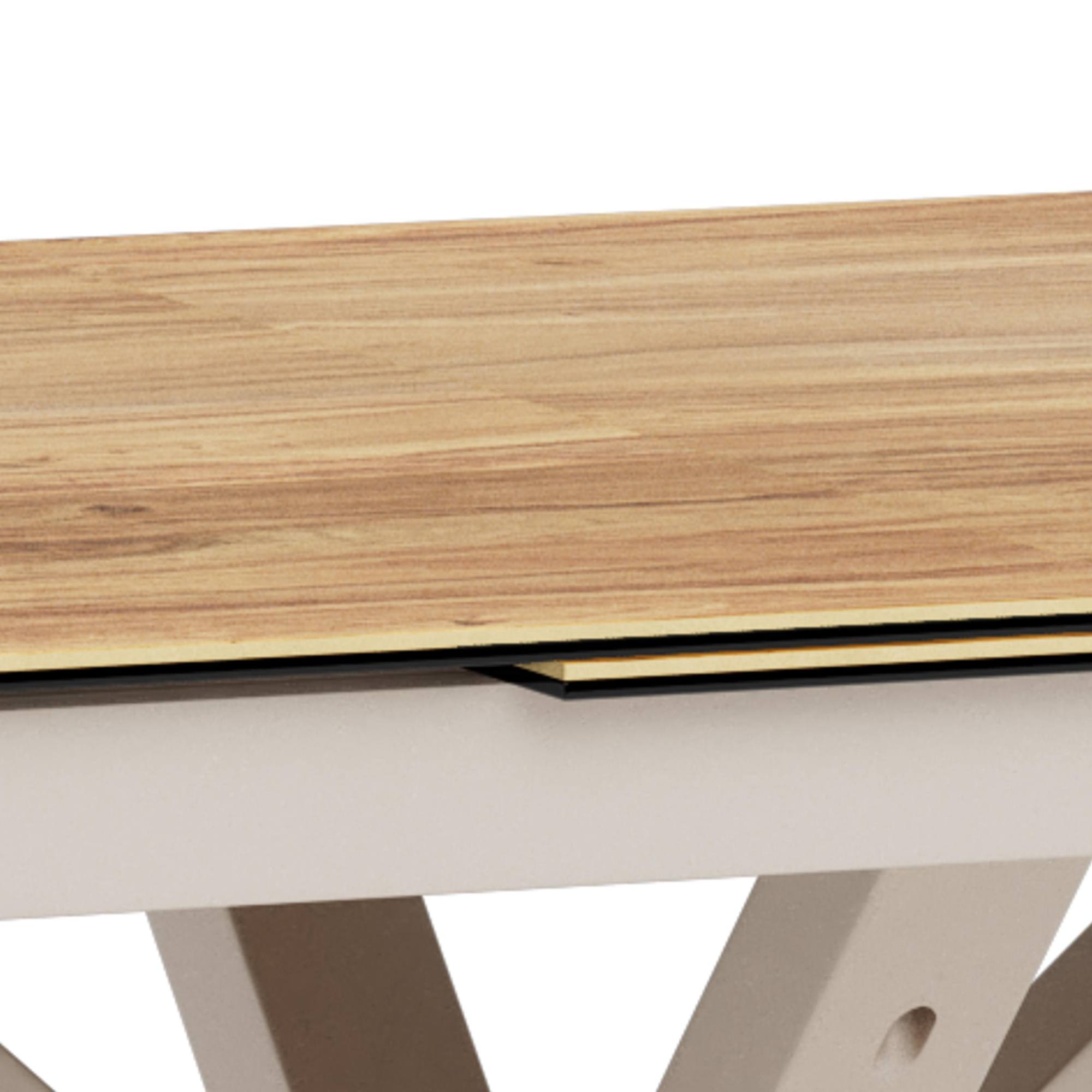 Stabilné prekrížené nohy, na ktorých tento stôl stojí, sú vyrobené z ocele a ich povrch je opatrený práškovým nástrekom. Horná doska je z kombinácie kvalitnej keramiky a skla odolnej voči teplu a poškriabaniu.