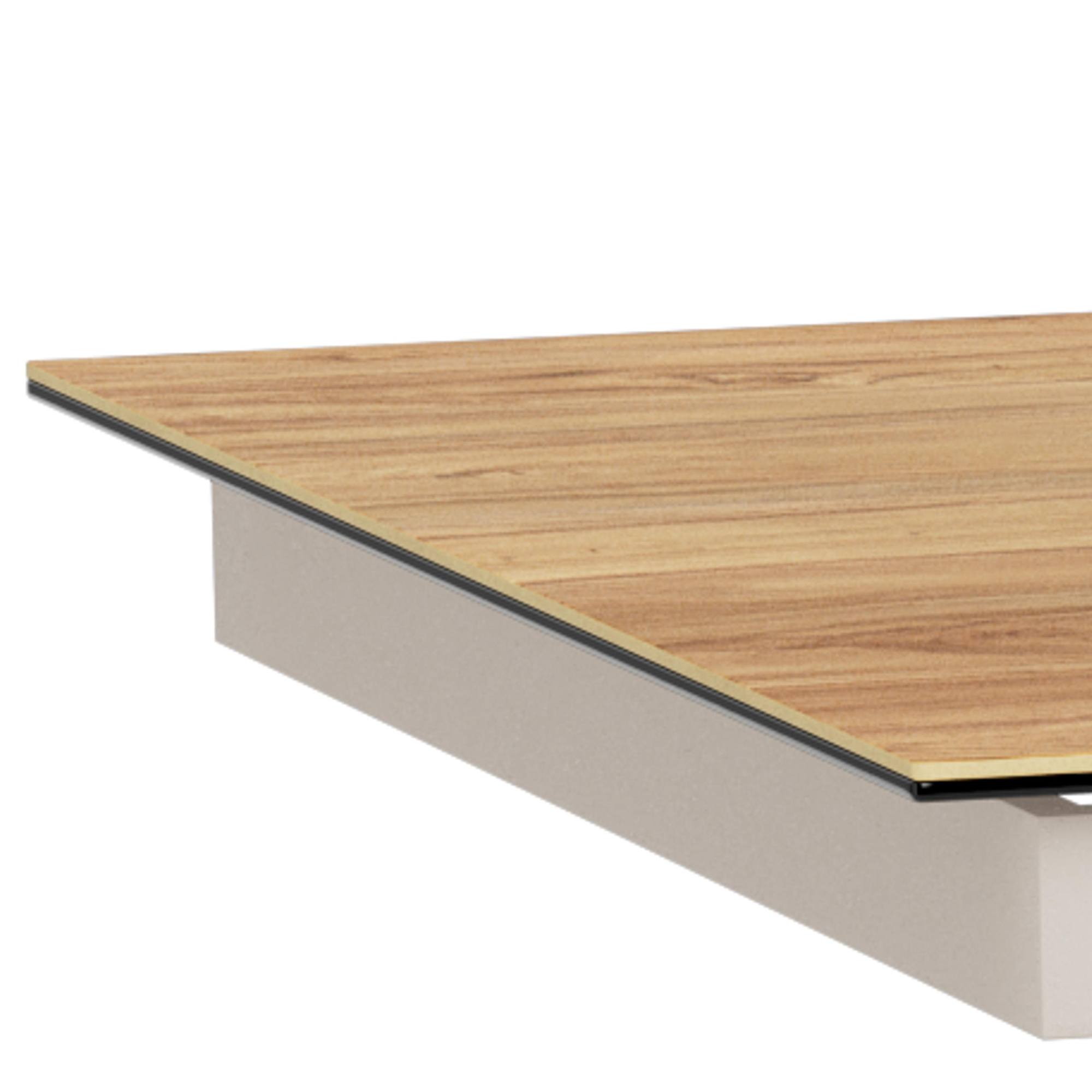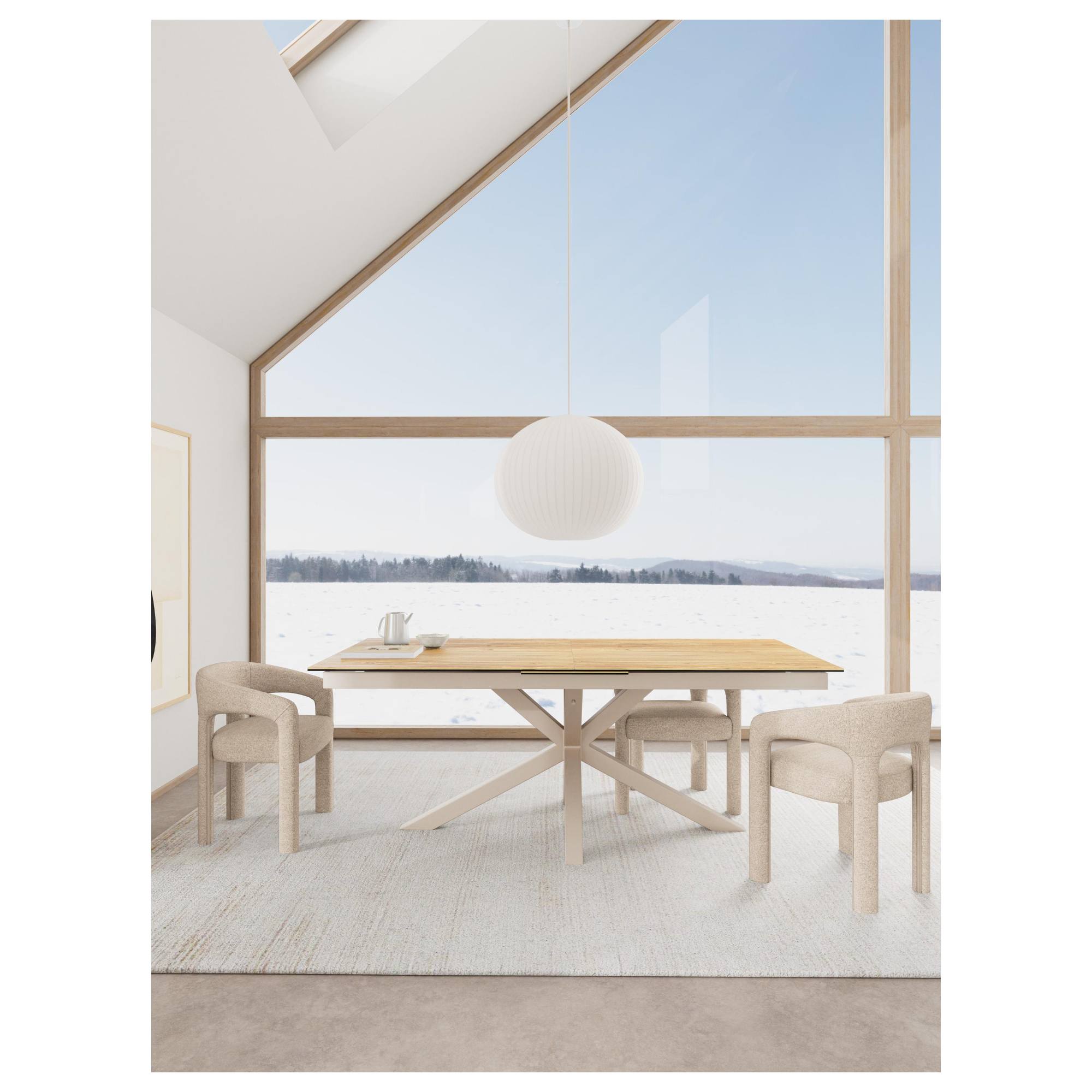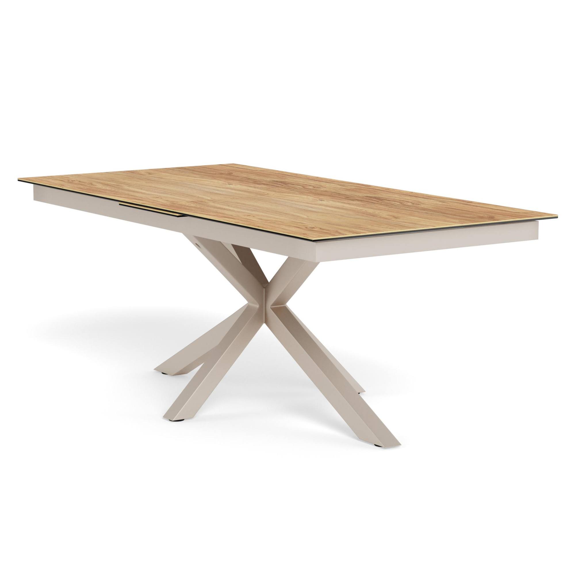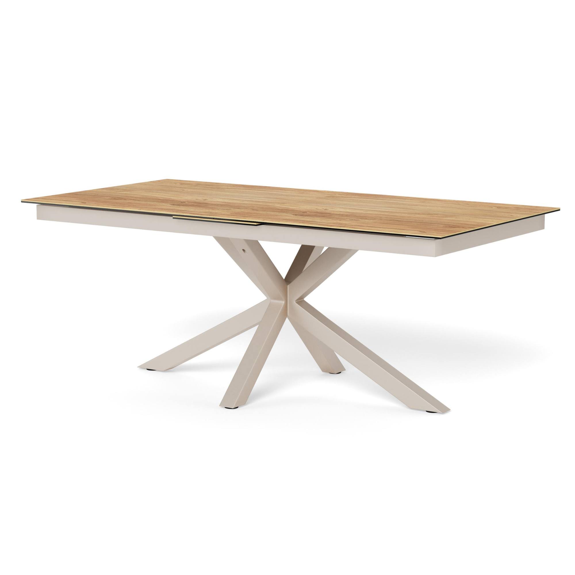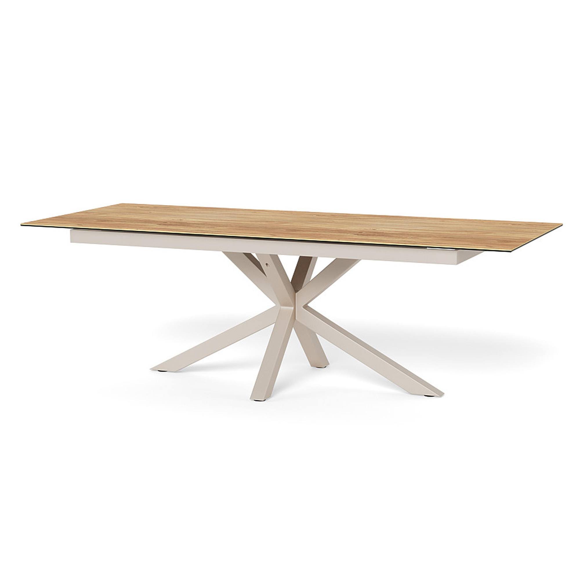 Stabilné prekrížené nohy, na ktorých tento stôl stojí, sú vyrobené z ocele a ich povrch je opatrený práškovým nástrekom. Horná doska je z kombinácie kvalitnej keramiky a skla odolnej voči teplu a poškriabaniu.