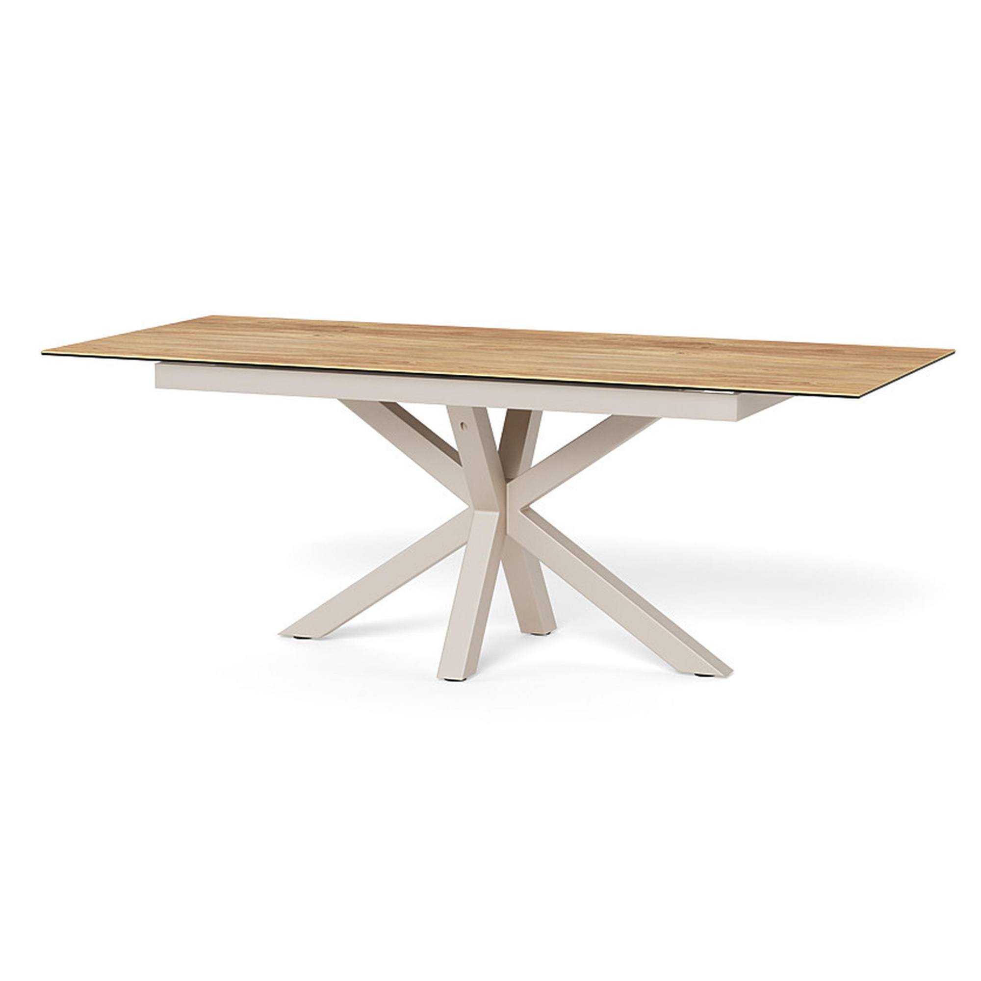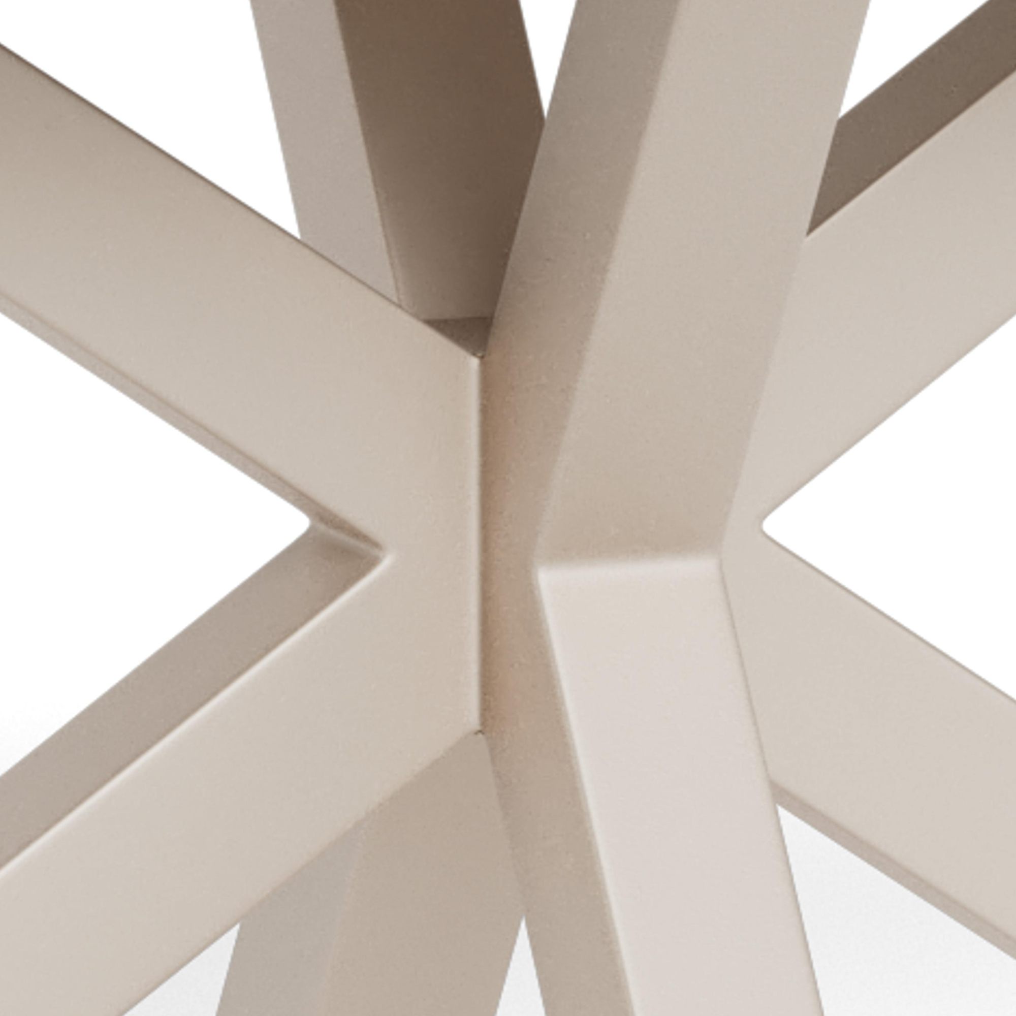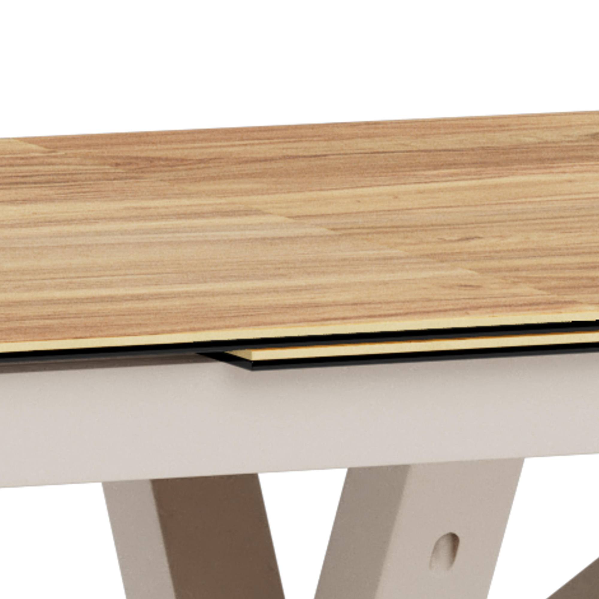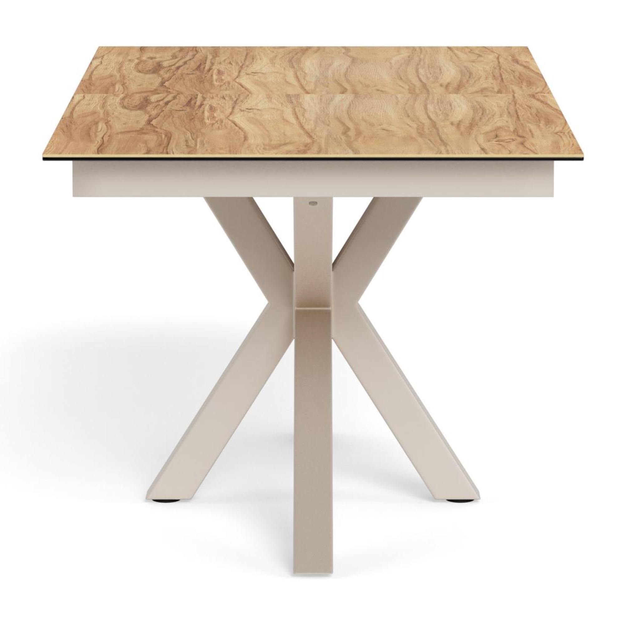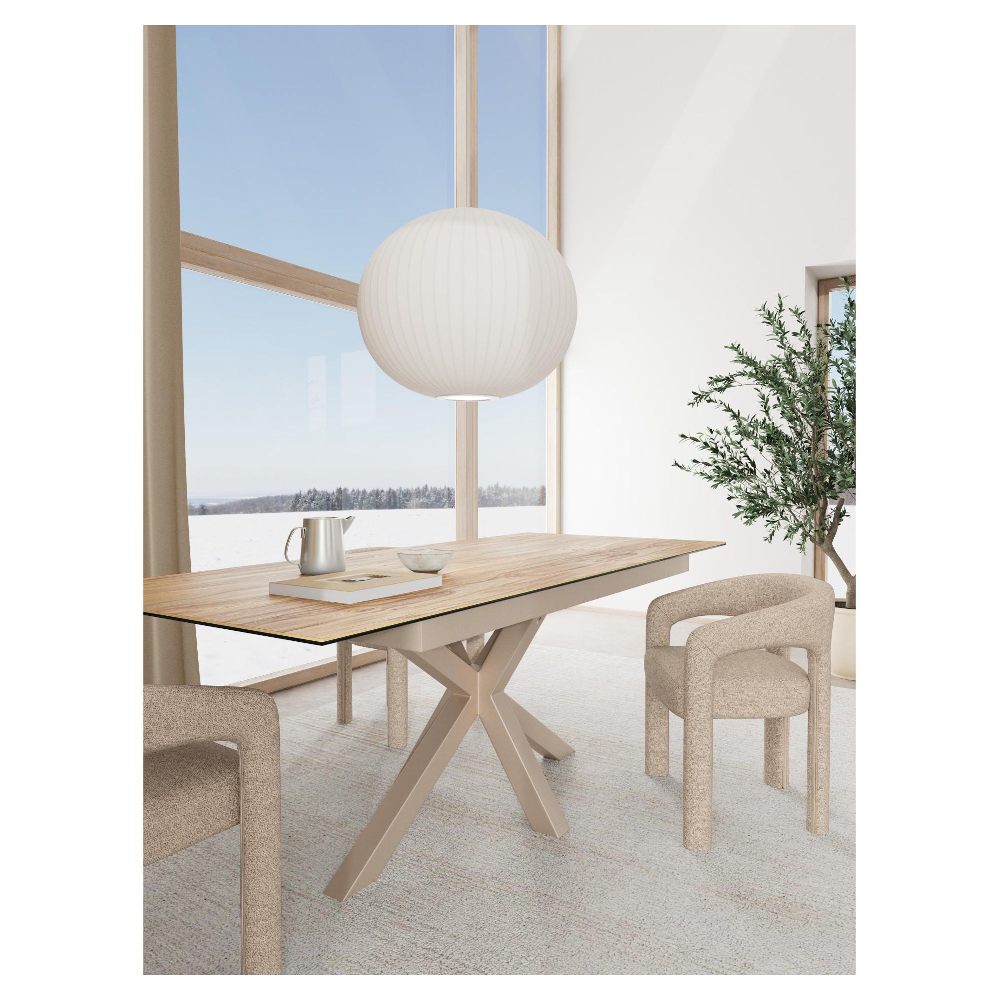 Stabilné prekrížené nohy, na ktorých tento stôl stojí, sú vyrobené z ocele a ich povrch je opatrený práškovým nástrekom. Horná doska je z kombinácie kvalitnej keramiky a skla odolnej voči teplu a poškriabaniu.