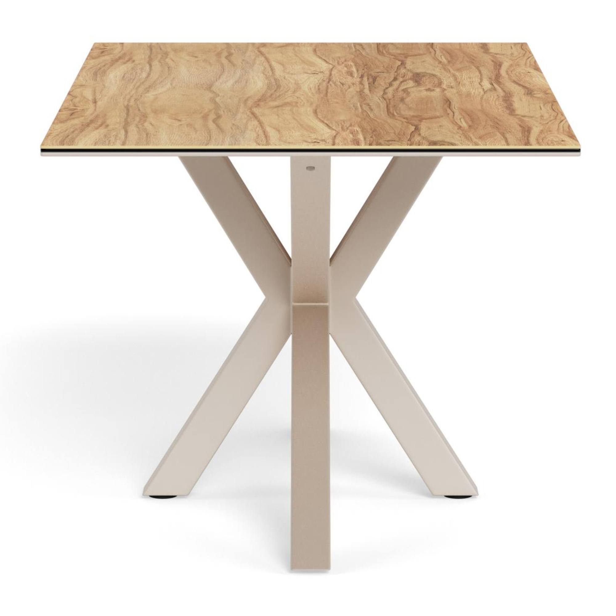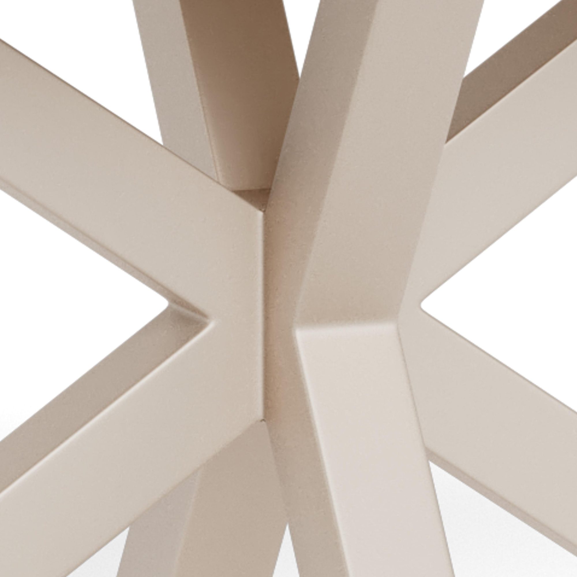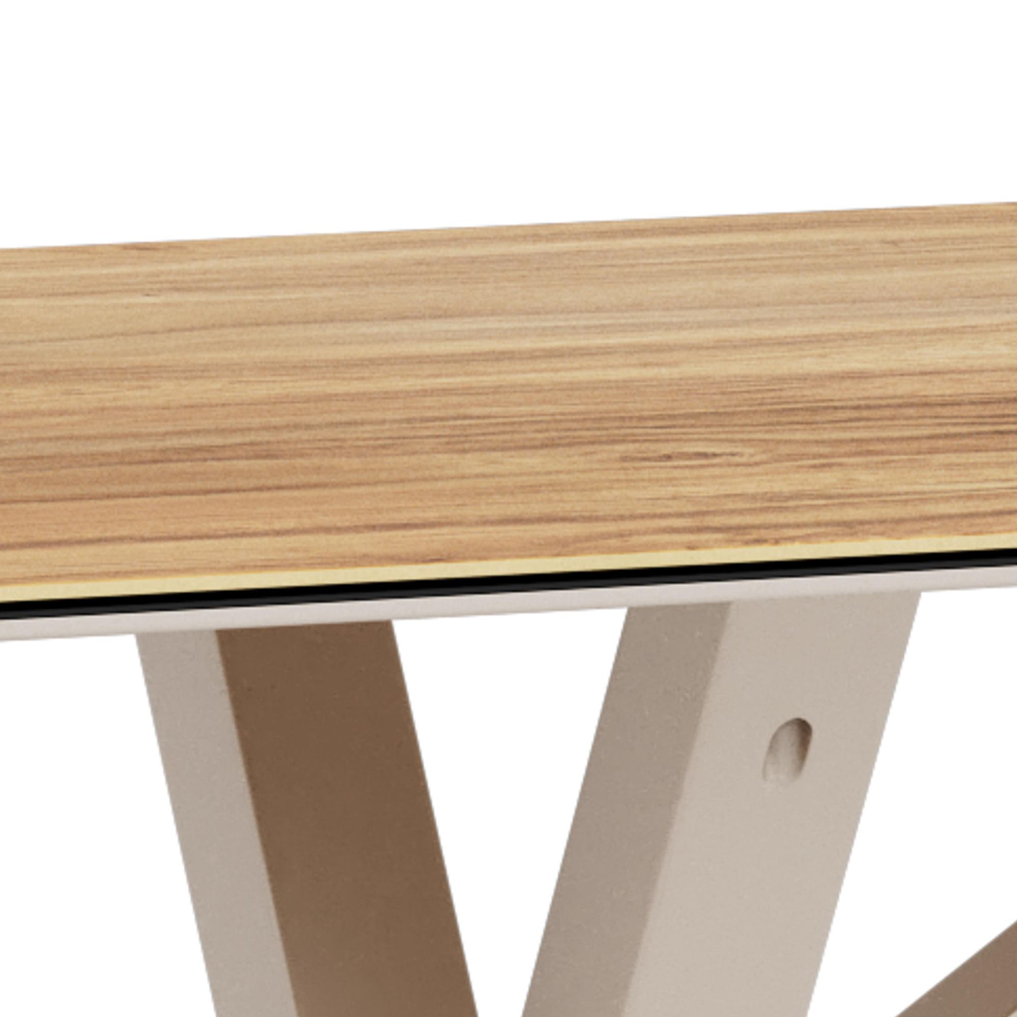 Stabilné prekrížené nohy, na ktorých tento stôl stojí, sú vyrobené z ocele a ich povrch je opatrený práškovým nástrekom. Horná doska je z kombinácie kvalitnej keramiky a skla odolnej voči teplu a poškriabaniu.
