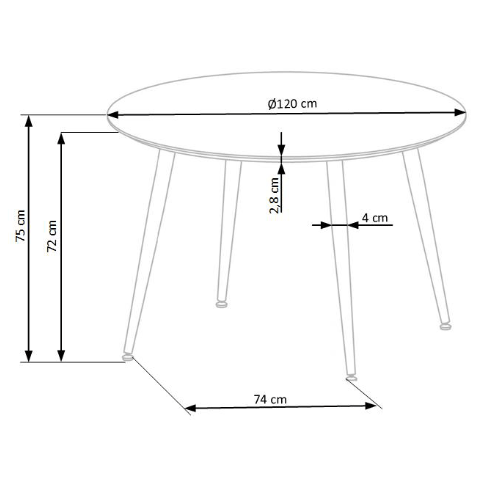 Kruhová doska je vyrobená z lakovaného drevovláknitého materiálu MDF. Maximálnu stabilitu zaisťuje štvorica kovových nôh zakončených obrubou zlatej farby. Nohy zároveň disponujú klzákmi, ktoré eliminujú riziko poškodenia podlahy. Nosnosť jedálenského stola IMBUS činí 30 kg.