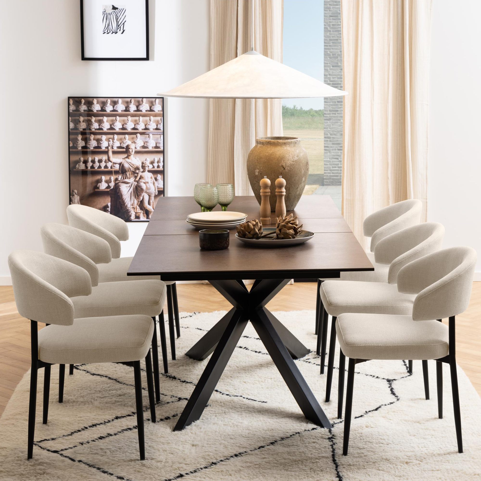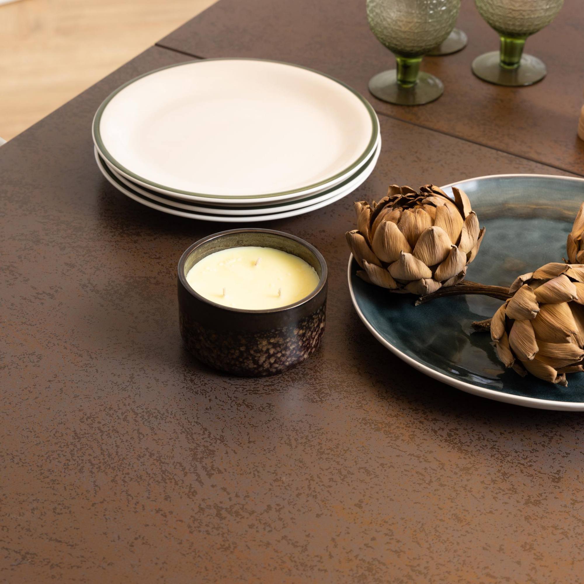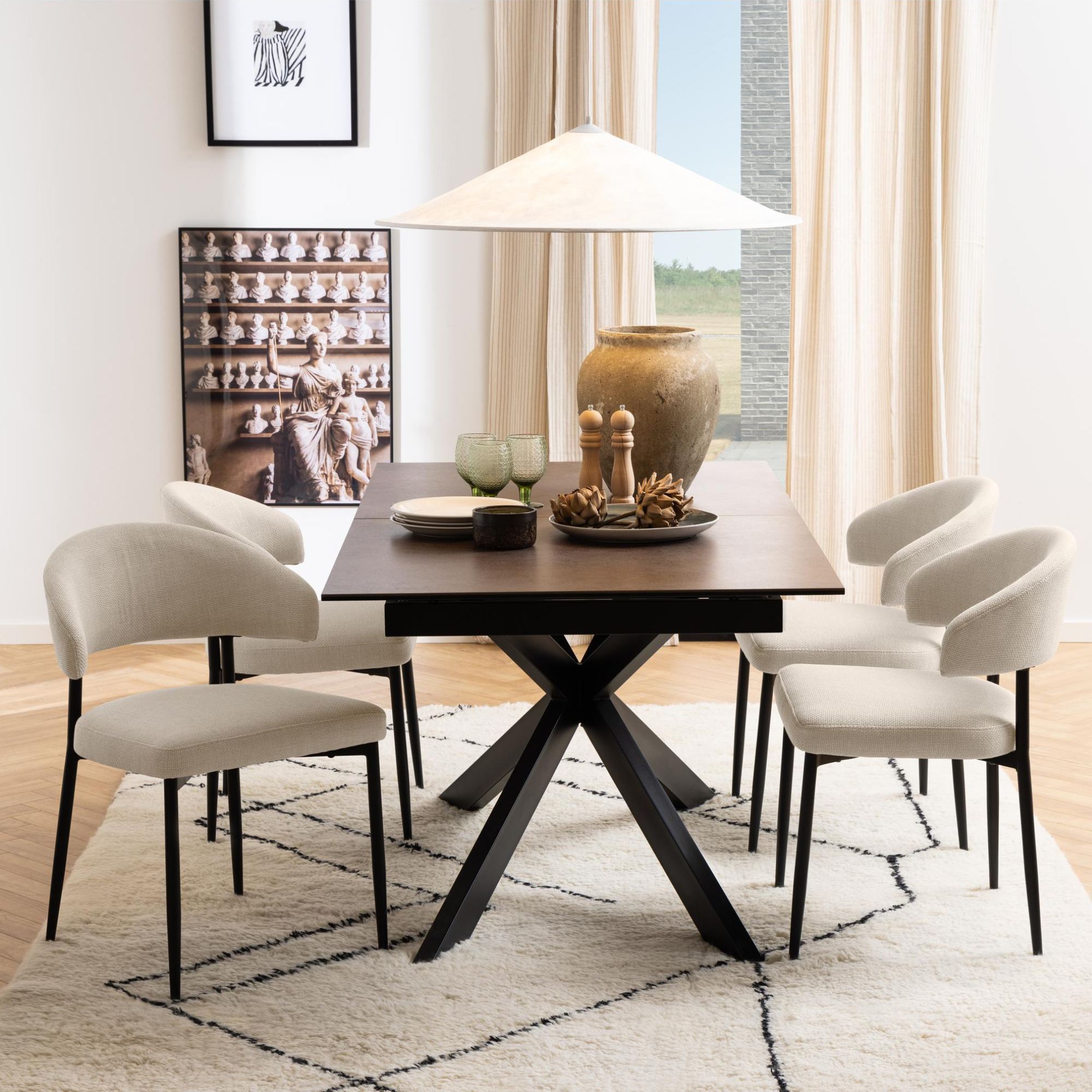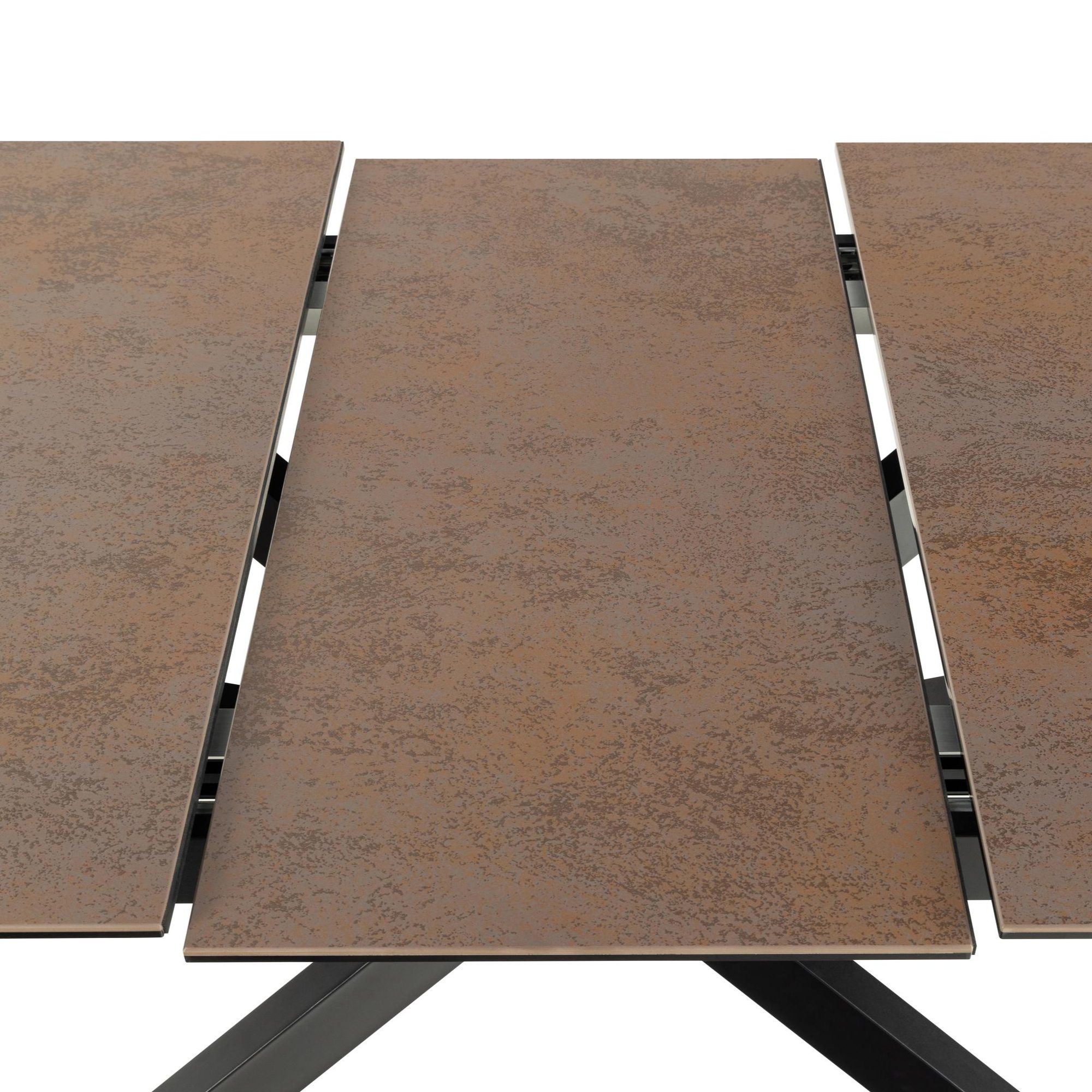 Tento stôl vyniká mimoriadnou stabilitou, za ktorú vďačí pevným kovovým nohám pokrytým matným lakom. Jeho doska je vyrobená z keramiky, a tak je odolná voči teplu. Pretože je pre tieto materiály charakteristická ľahká udržiavateľnosť, nebude starostlivosť o stôl vyžadovať veľa času ani námahy.