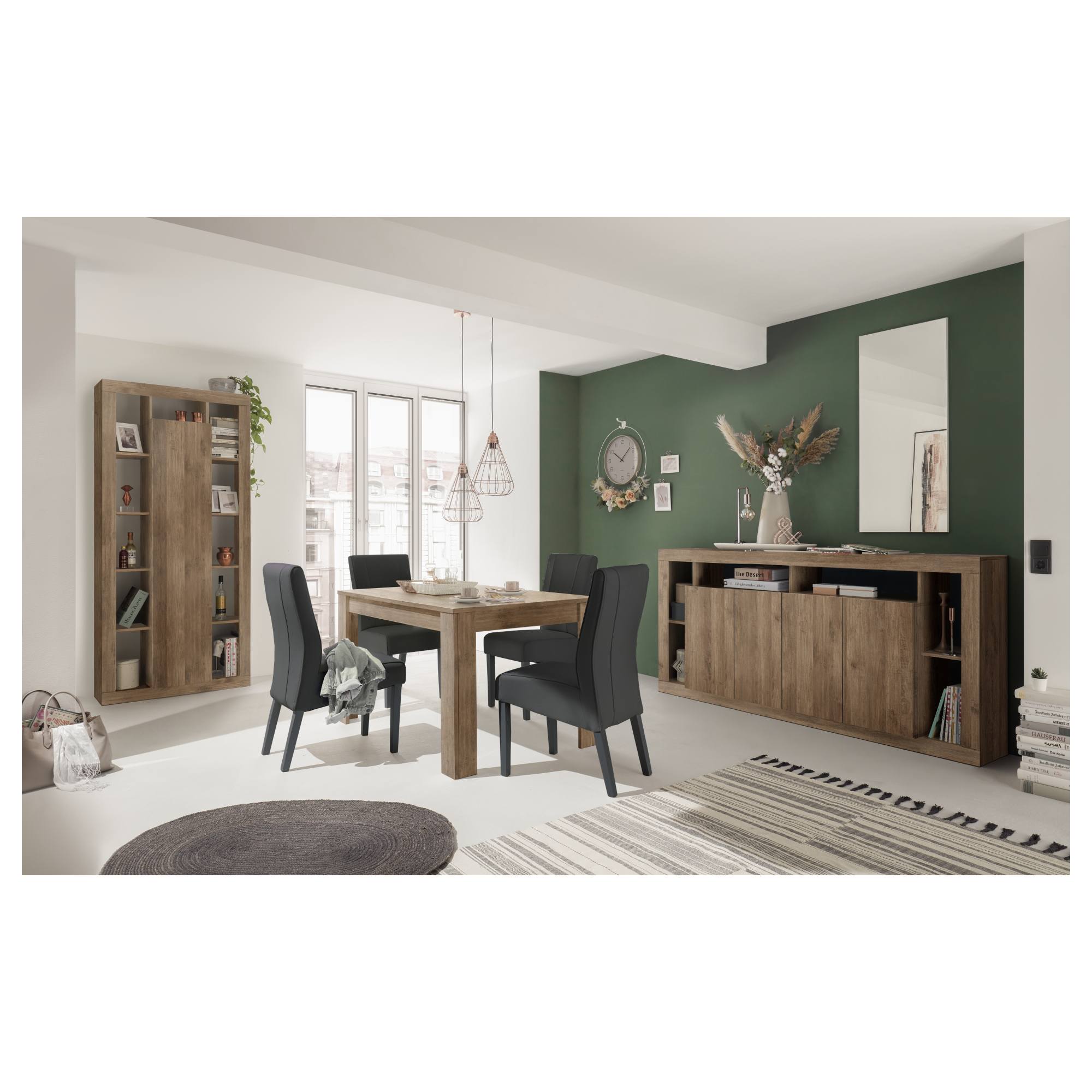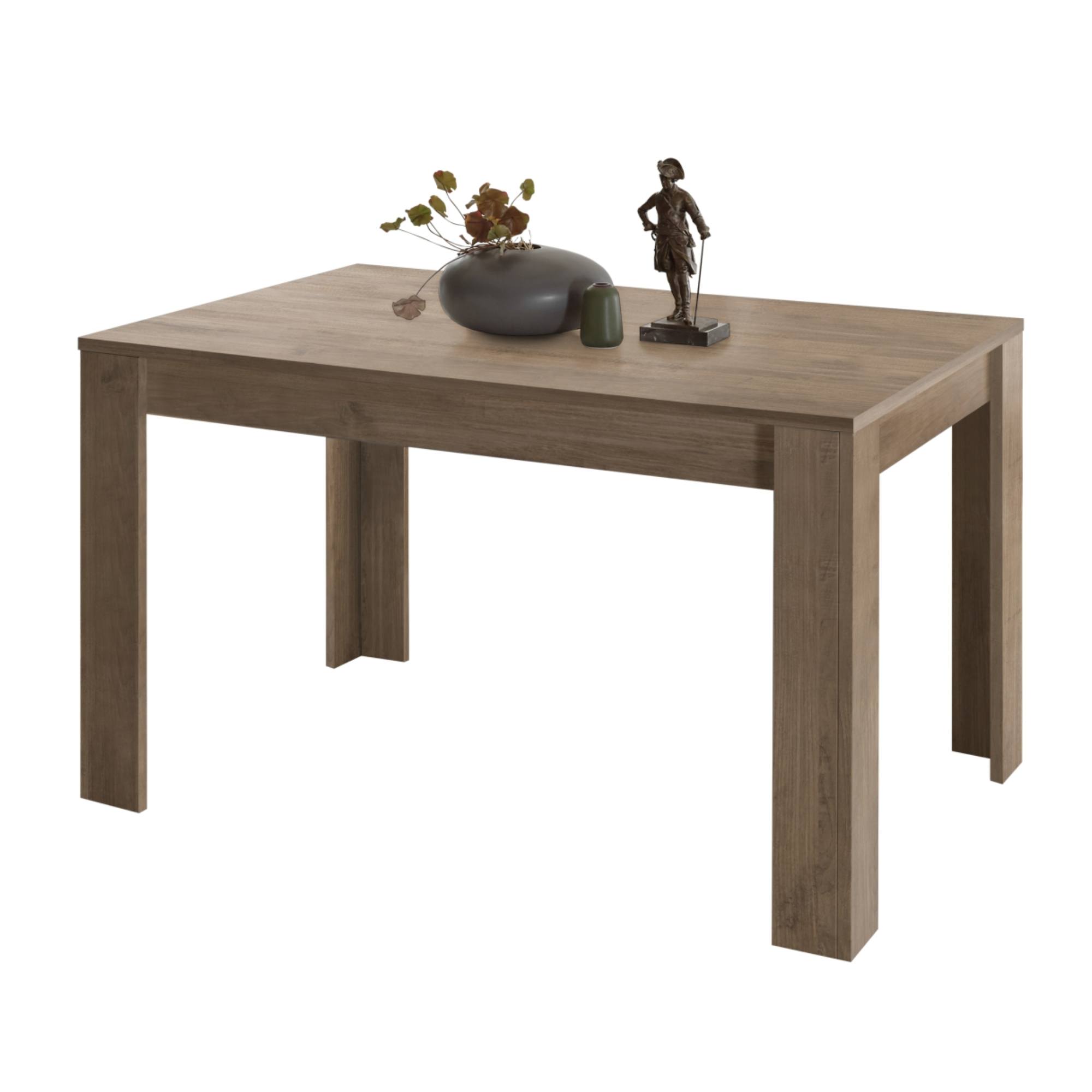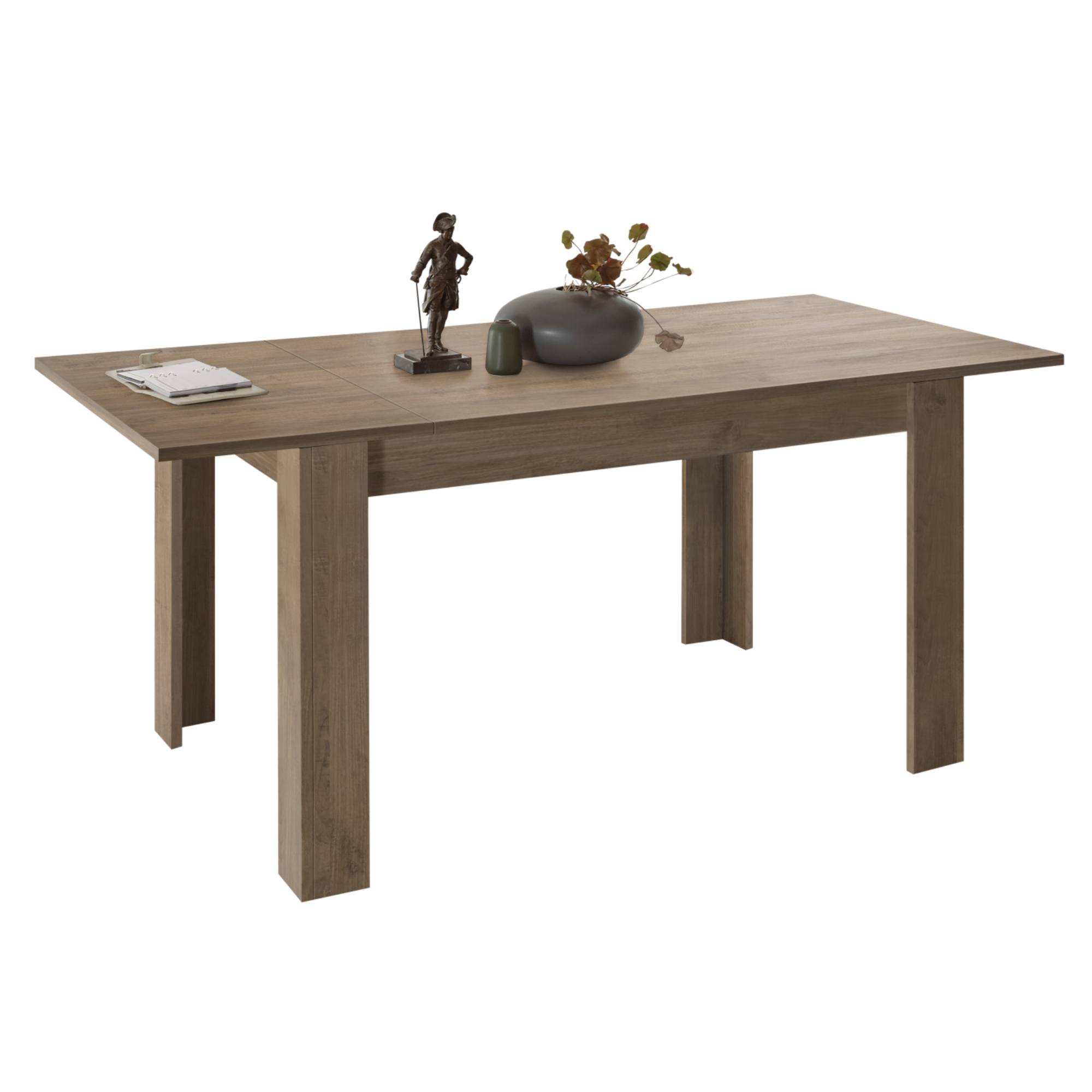 Vyrobený je z laminovaného dreveného materiálu, ktorý sa vyznačuje ľahkou udržiavateľnosťou aj dlhou životnosťou. Ladený je do dekora duba tmavého s decentnou kresbou dreva. Maximálnu stabilitu majú na starosť štyri robustné nohy. Komfort stolovania navyšuje rozkladaciu funkciu na 185 cm.
