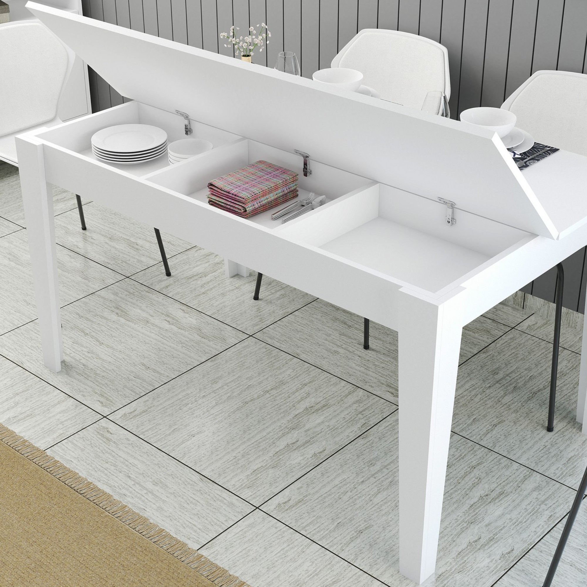 Pod hornou doskou sa nachádza praktický úložný priestor, do ktorého môžete schovať nielen jedálenské potreby.