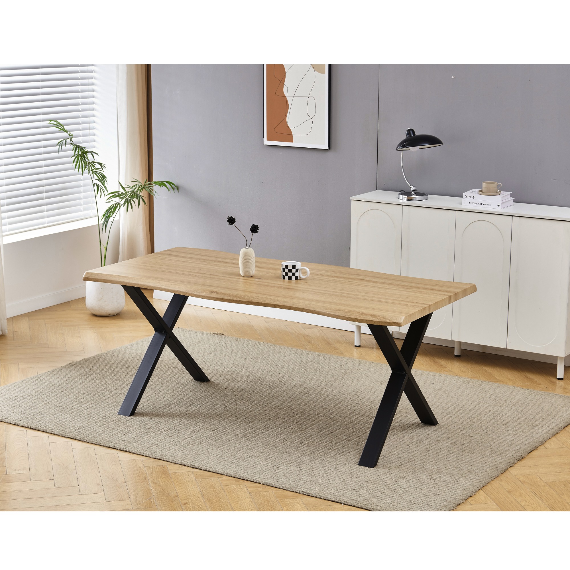 Stabilné prekrížené nohy tohto stola sú vyrobené z kovu. Priestranná horná doska je z drevovláknitej dosky MDF.