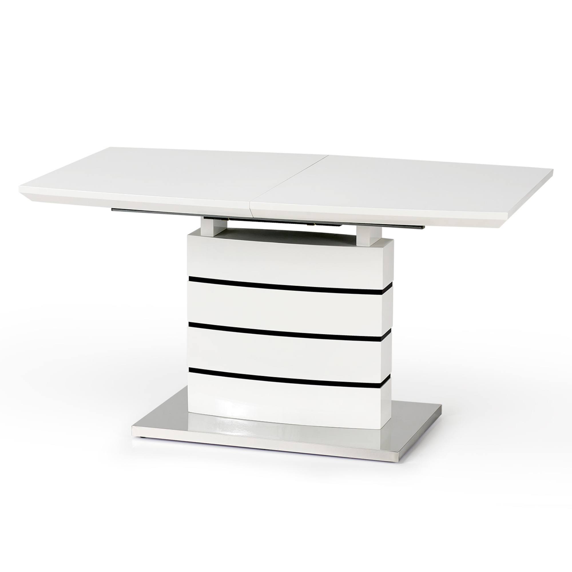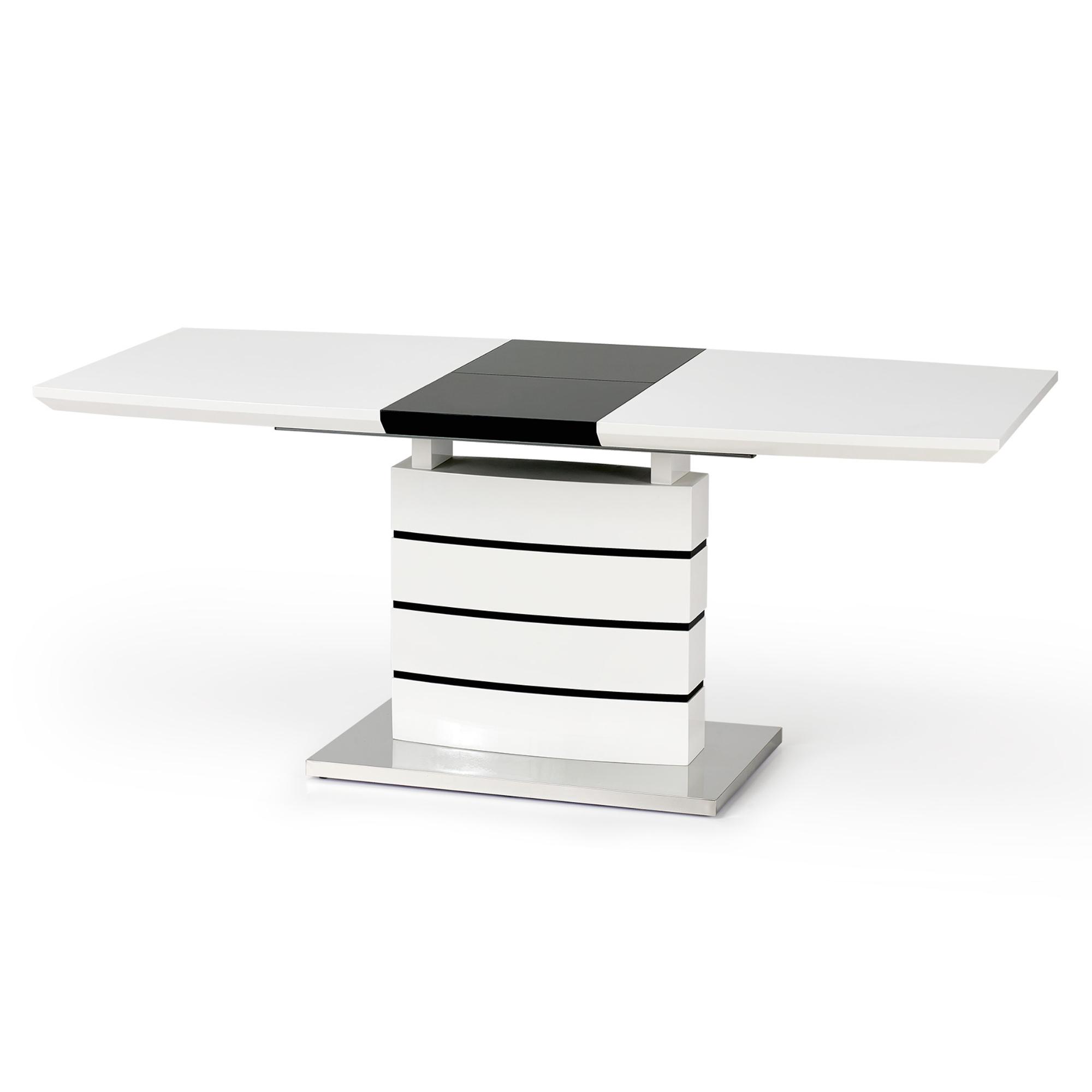 Vyrobený je z lakovaného drevovláknitého materiálu MDF, ktorý sa vyznačuje ľahkou udržiavateľnosťou a dlhou životnosťou. Maximálnu stabilitu zaisťuje robustná stredová noha s horizontálnymi dekoratívnymi pruhmi v kontrastnom čiernom odtieni. Komfort stolovania navyšuje rozkladacia funkcia na dostatočných 180 cm, k stolu sa tak pohodlne usadí až osem osôb.