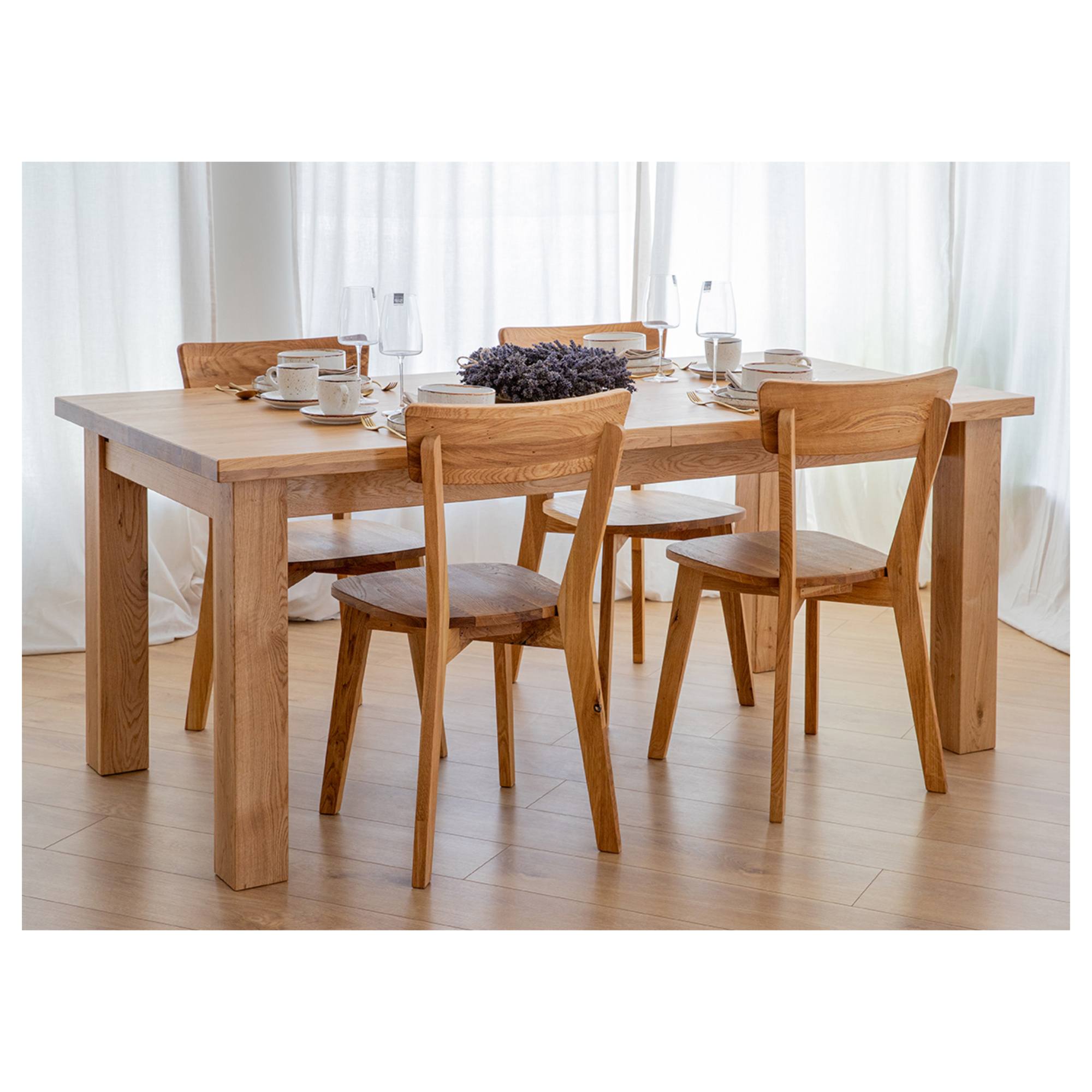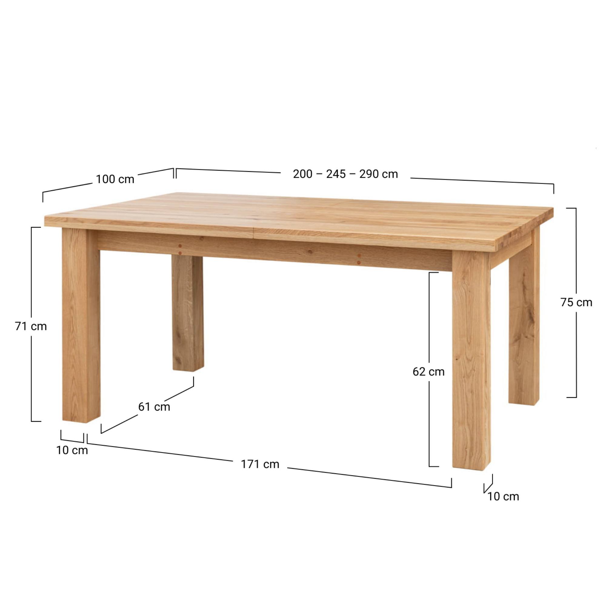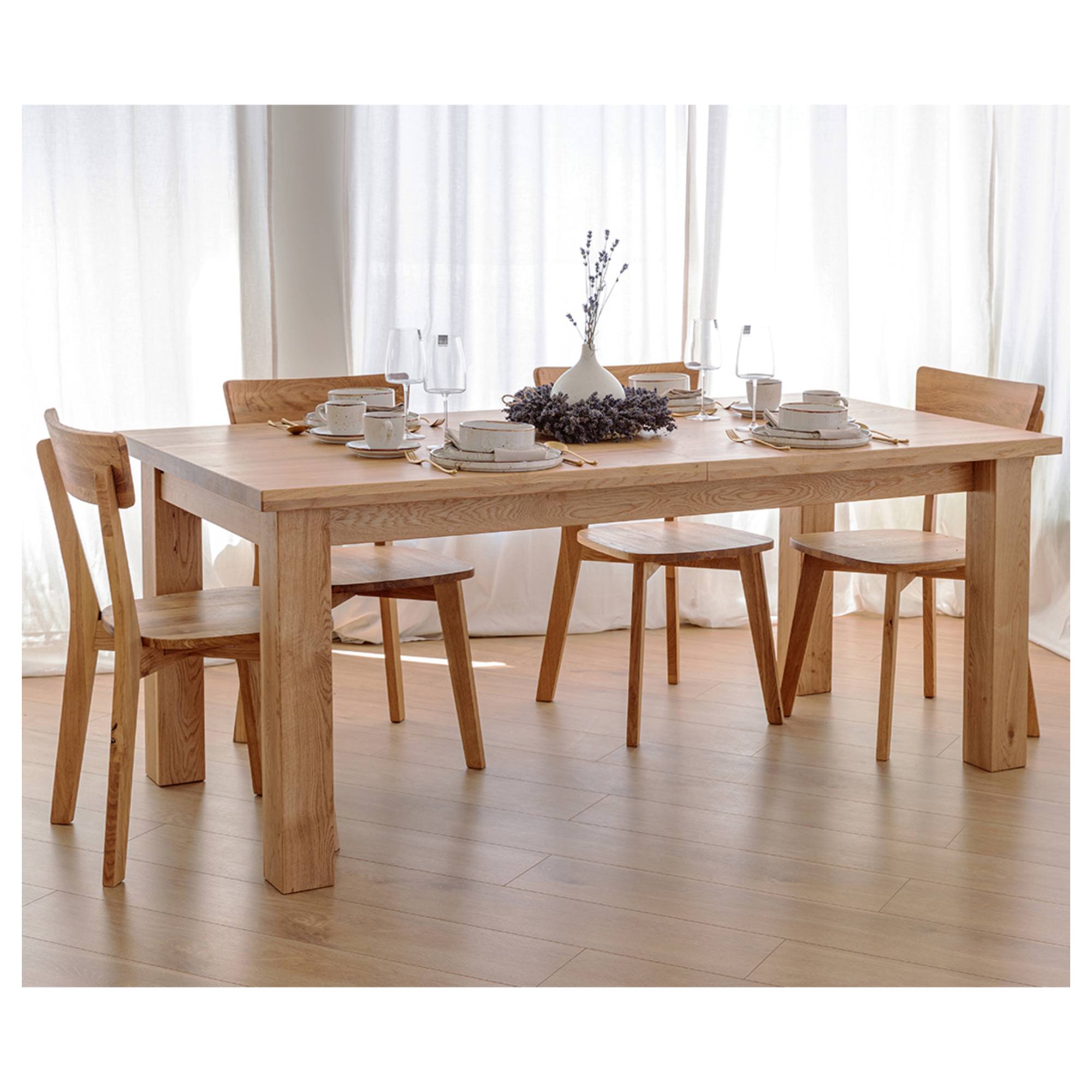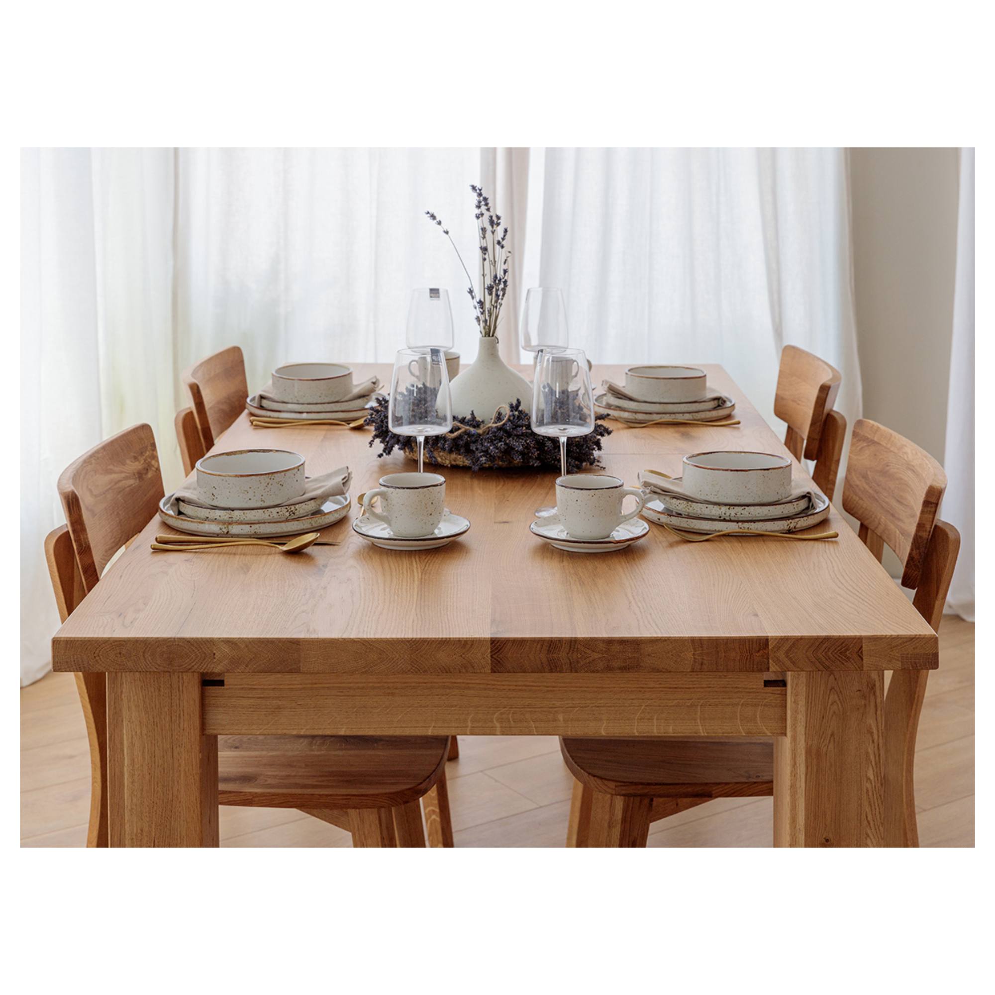 Jeho konštrukcia je vyrobená z masívneho dubového dreva s prirodzenou kresbou, ktorá robí z každého kusa originál. Vďaka olejovanému povrchu vám bude stôl dlho slúžiť aj sa ľahko udržiava v čistote. Priestranná doska je rozkladacia a umožňuje rozšírenie o ďalších 90 cm. Stôl sa tak dokonale prispôsobí vašim potrebám a bez problémov pohostíte aj väčšie skupiny stravníkov. Celkovú stabilitu a pevnosť zaisťujú vysoké, masívne nohy.
