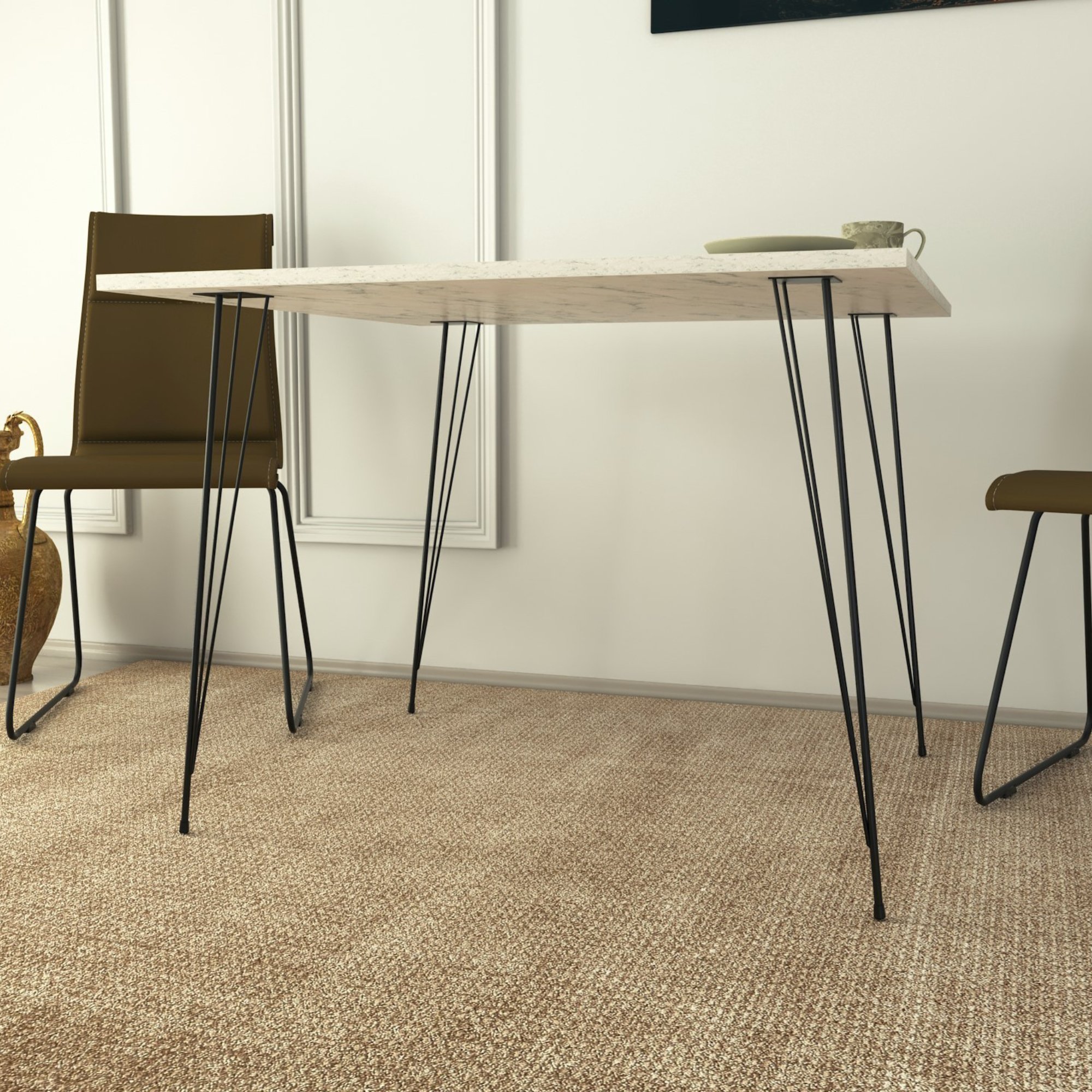 Stabilitu stola zaručujú pevné kovové nohy. Na výrobu hornej dosky bol využitý drevovláknitý materiál MDF.