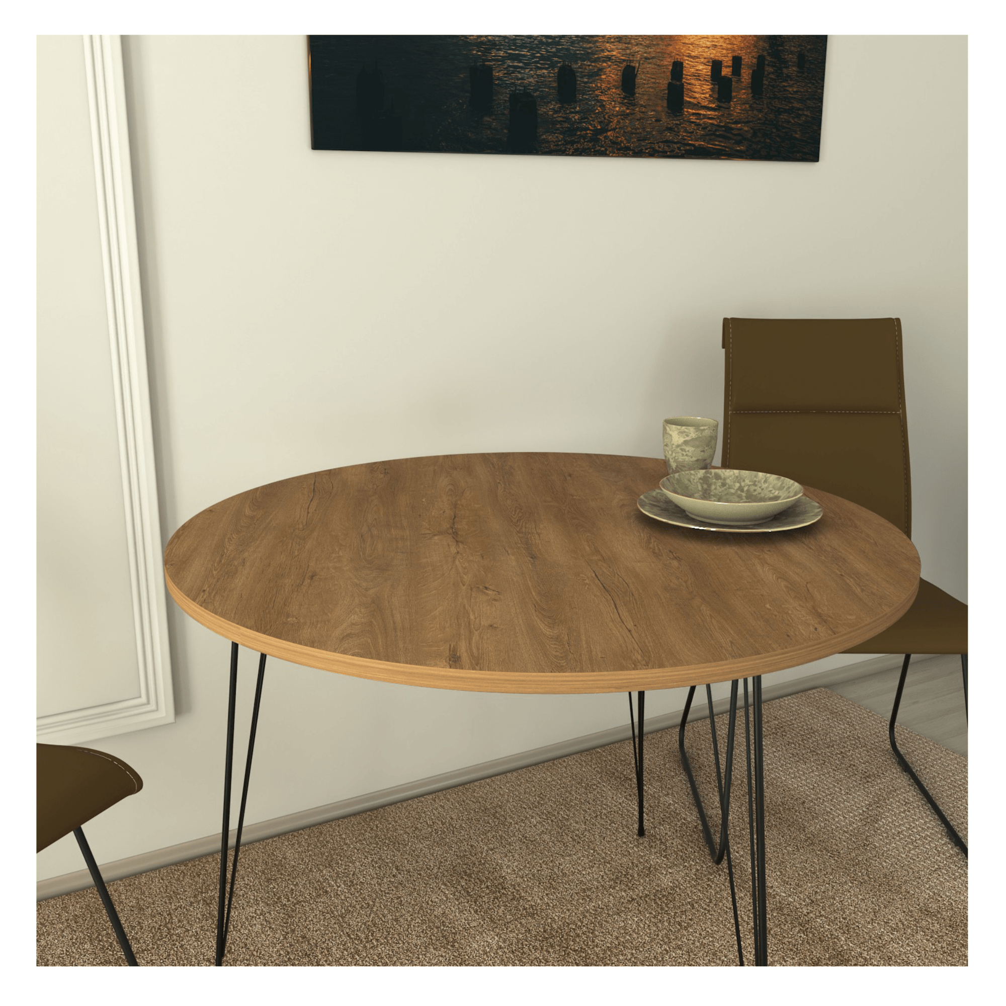 Okrúhla odkladacia doska je vyrobená z laminovaného dreveného materiálu, ktorý sa vyznačuje ľahkou udržiavateľnosťou aj dlho živosťou. Maximálnu stabilitu zaisťuje elegantná trojnohá podnož z kovu.