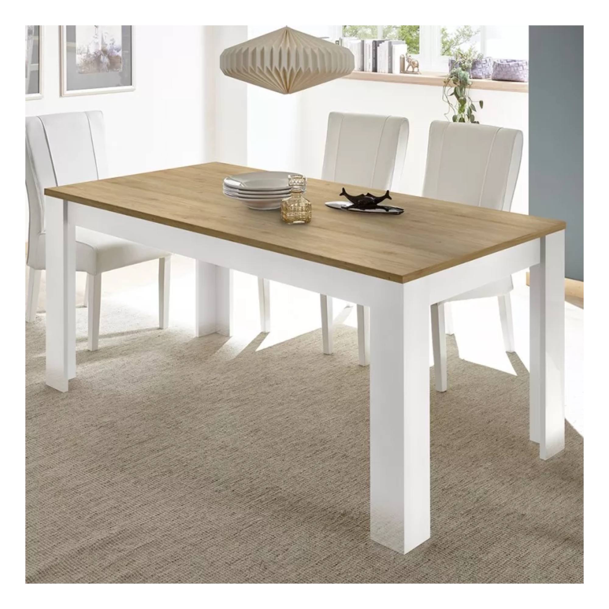 Vyrobený je z laminovaného dreveného materiálu, ktorý sa vyznačuje ľahkou udržiavateľnosťou aj dlhou životnosťou. Doska je ladená do dekora duba svetlého s decentnou kresbou dreva, ktoré dobre ladí k podnožiu v lesklom bielom vyhotovení. Maximálnu stabilitu majú na starosť štyri robustné nohy.