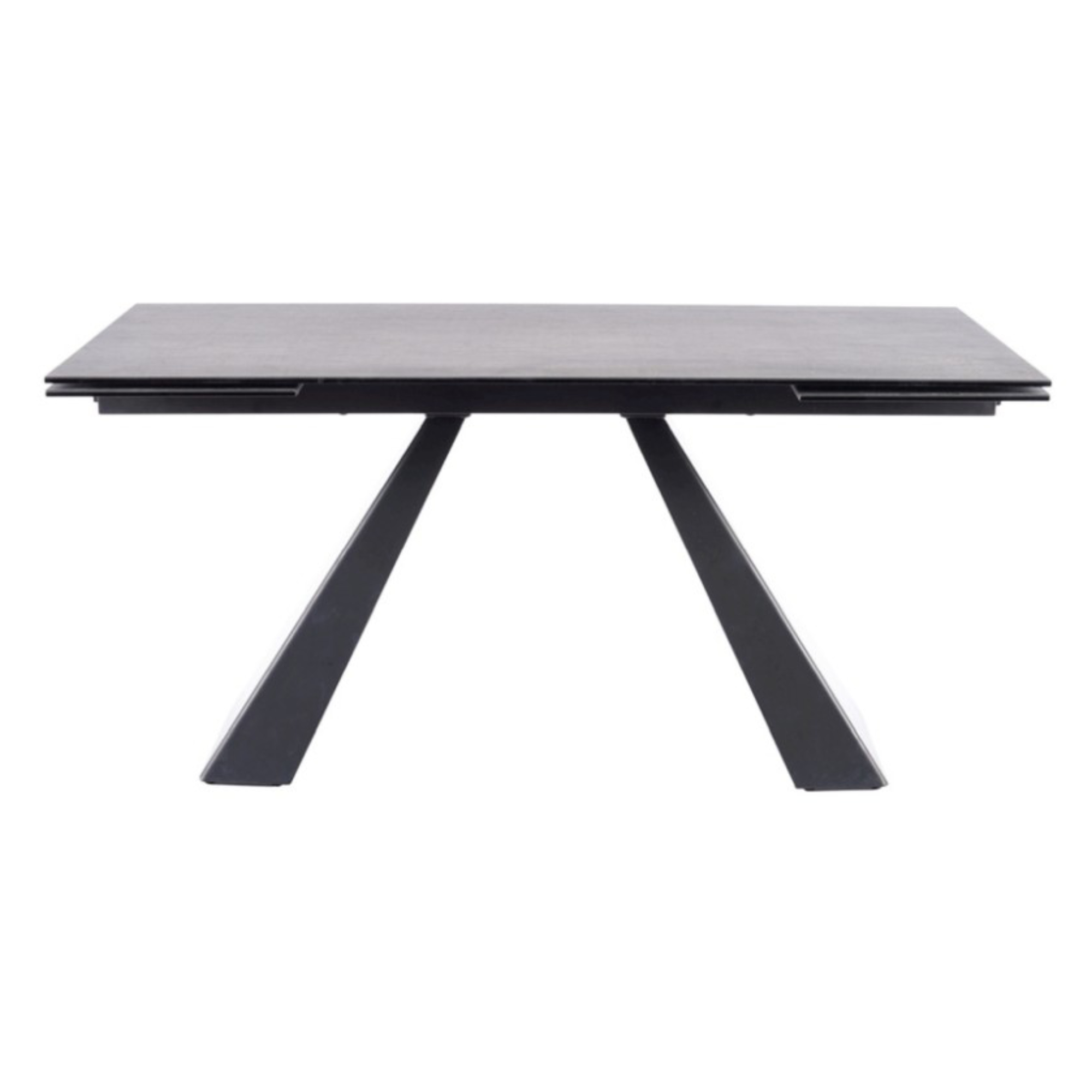Doska stola je vyrobená z kombinácie odolného tvrdeného skla a vysoko kvalitnej keramiky s mramorovým efektom. Maximálnu stabilitu zabezpečuje dekoratívna podnož z kovu v čiernom matnom vyhotovení. Komfort stolovania podporuje rozkladacia funkcia na 180 cm, k stolu sa tak pohodlne usadí až šesť osôb.