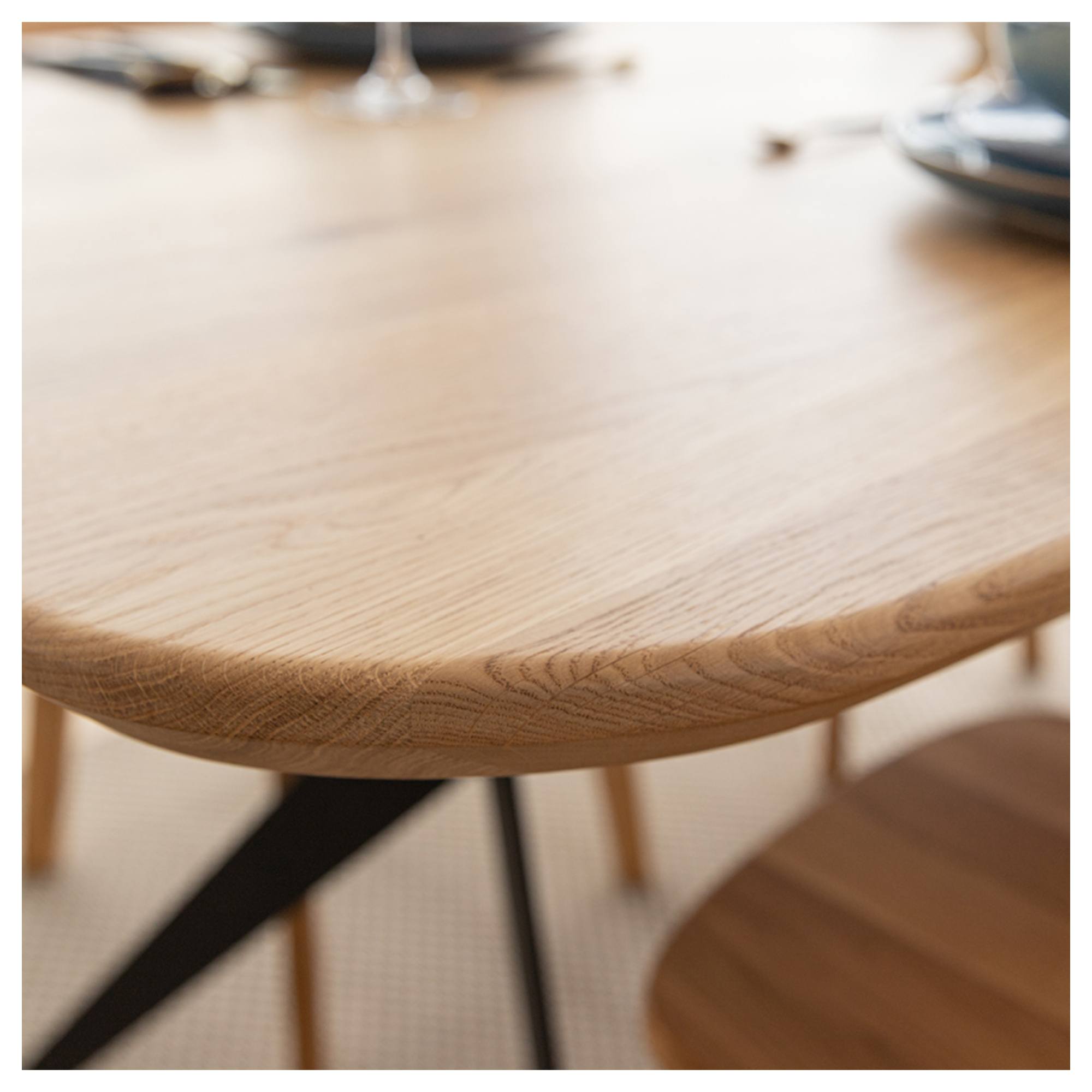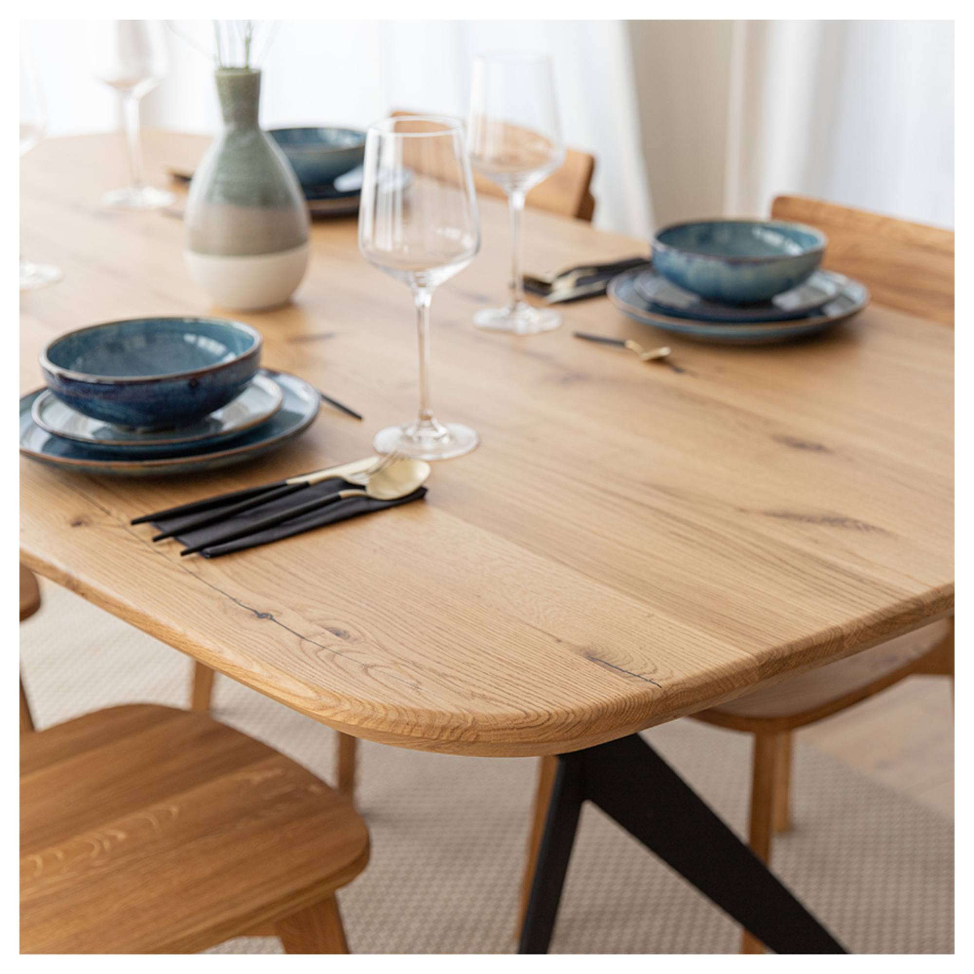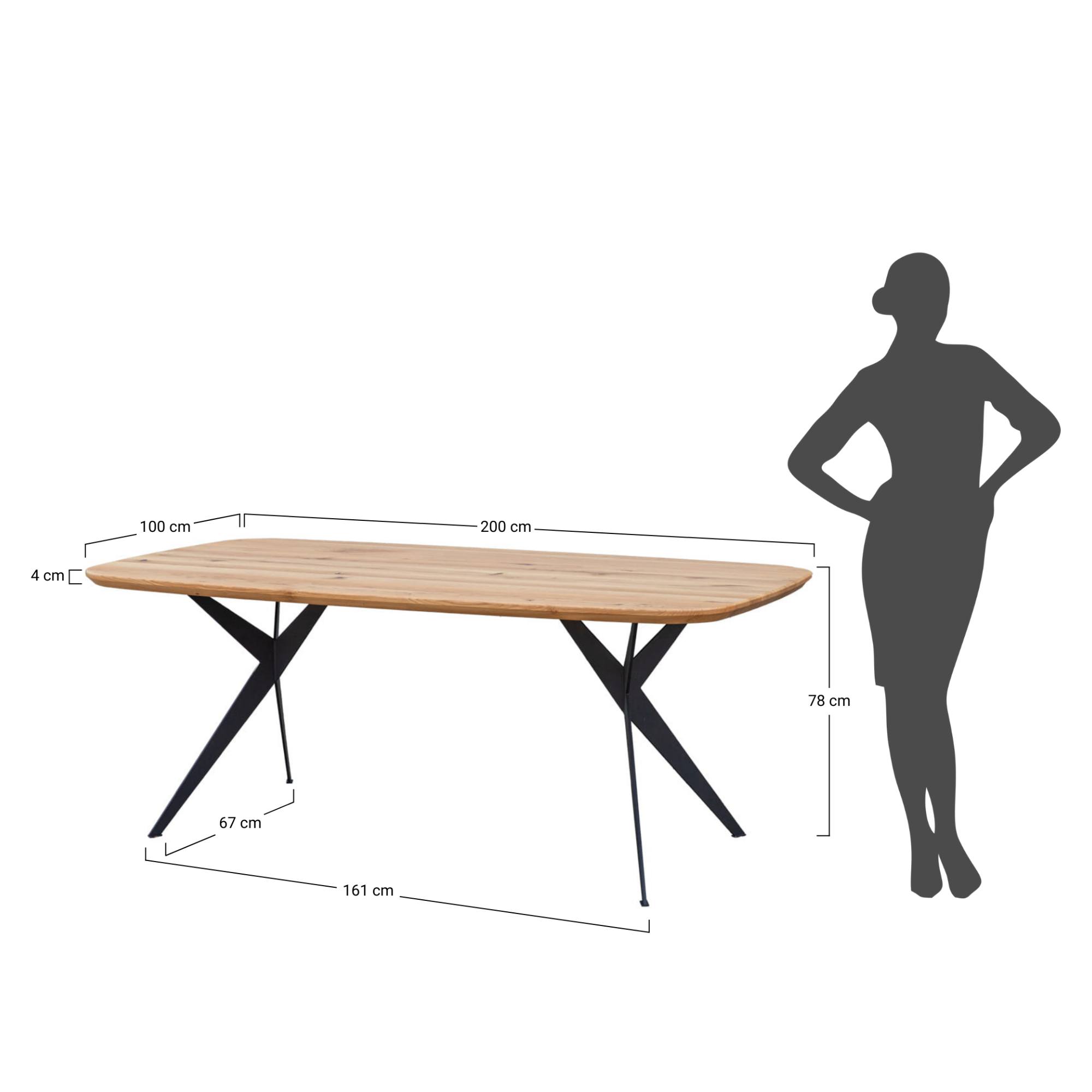 Priestranná vrchná doska s hrúbkou 4 cm je vyrobená z masívneho dubového dreva zaisťujúceho pevnosť a dlhú životnosť. Drevo je navyše pokryté hrubou olejovou vrstvou na ľahkú údržbu. Dosku podopiera originálne riešená podnož z práškovo lakovanej ocele v čiernej farbe. Vzhľadom k zaobleným rohom je stôl vhodný aj do domácností s malými deťmi.