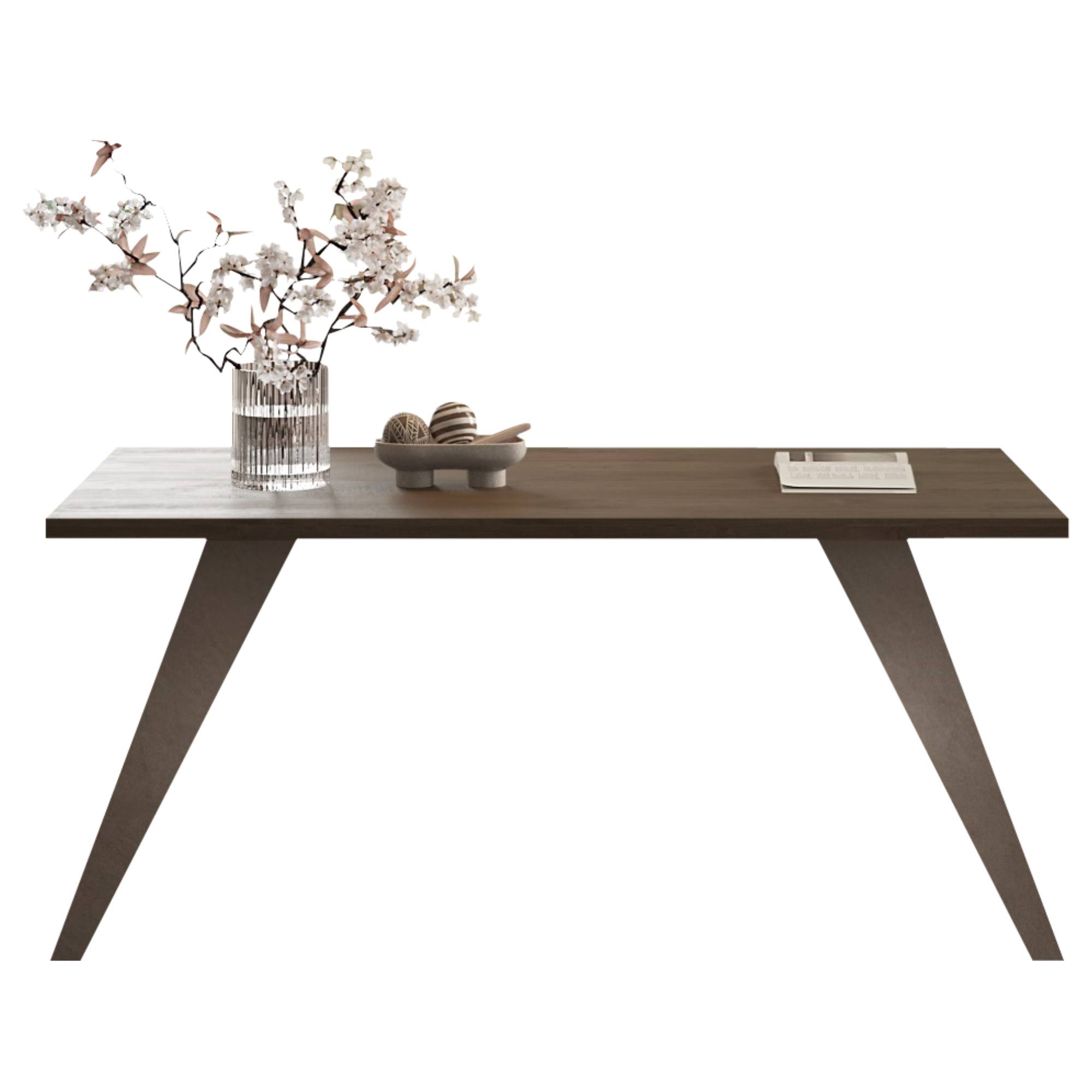 Jeho jednoduchá konštrukcia je tvorená priestrannou vrchnou doskou so šírkou 180 cm. Dosku podopiera štvorica pevných, kovových nôh. ktoré zaisťujú celkovú stabilitu a zdôrazňujú elegantný vzhľad stola. Konštrukcia je vyrobená z laminovanej drevotriesky a kovu, takže poteší nenáročnou údržbou.