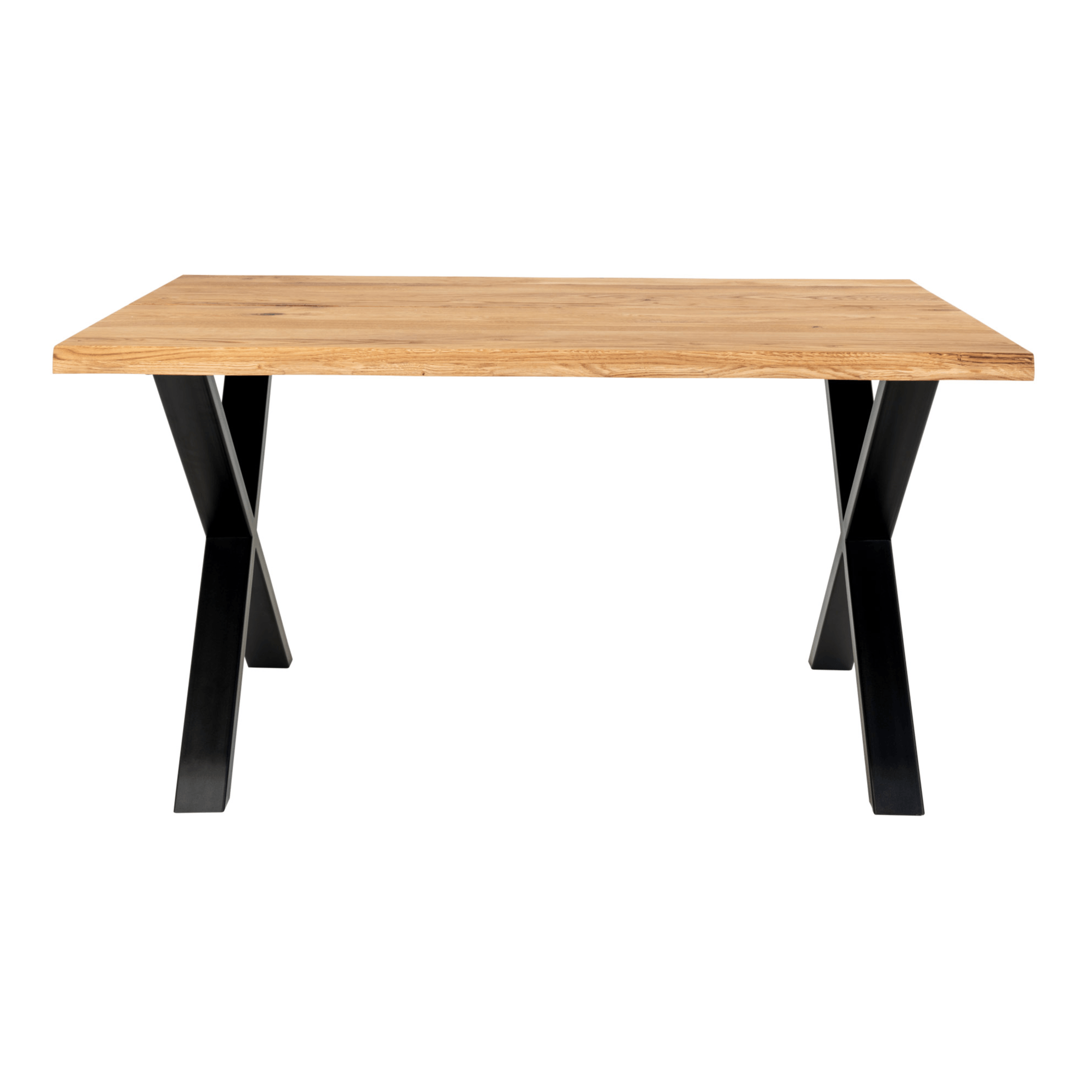 Hlavná odkladacia doska je vyrobená z masívneho dubového dreva s výraznou kresbou a okrajmi, ktoré kopírujú prirodzené línie rastu stromu. Doska je navyše ošetrená olejom, ktorý zvyšuje odolnosť a predlžuje životnosť dreva. Maximálnu stabilitu zaisťuje podnož z kovu v čiernej farbe. Komfort stolovania maximalizujú štedré rozmery, vďaka ktorým sa k stolu pohodlne usadíte s celou rodinou či početnou partiou priateľov.