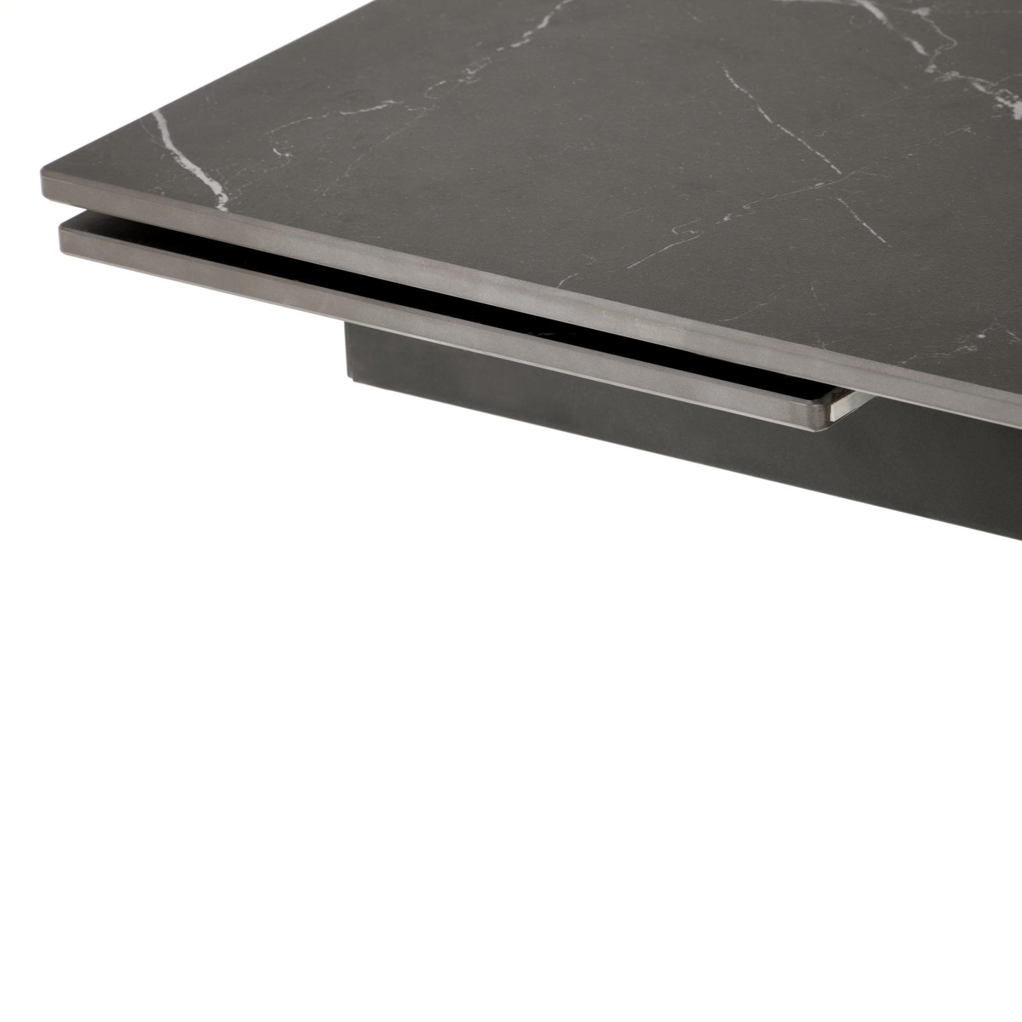 Pevná konštrukcia, ktorá je zárukou stability stola, je vyrobená z kovu. Doska je z kvalitného spekaného kameňa a zdobí ju štýlový dekor mramoru.