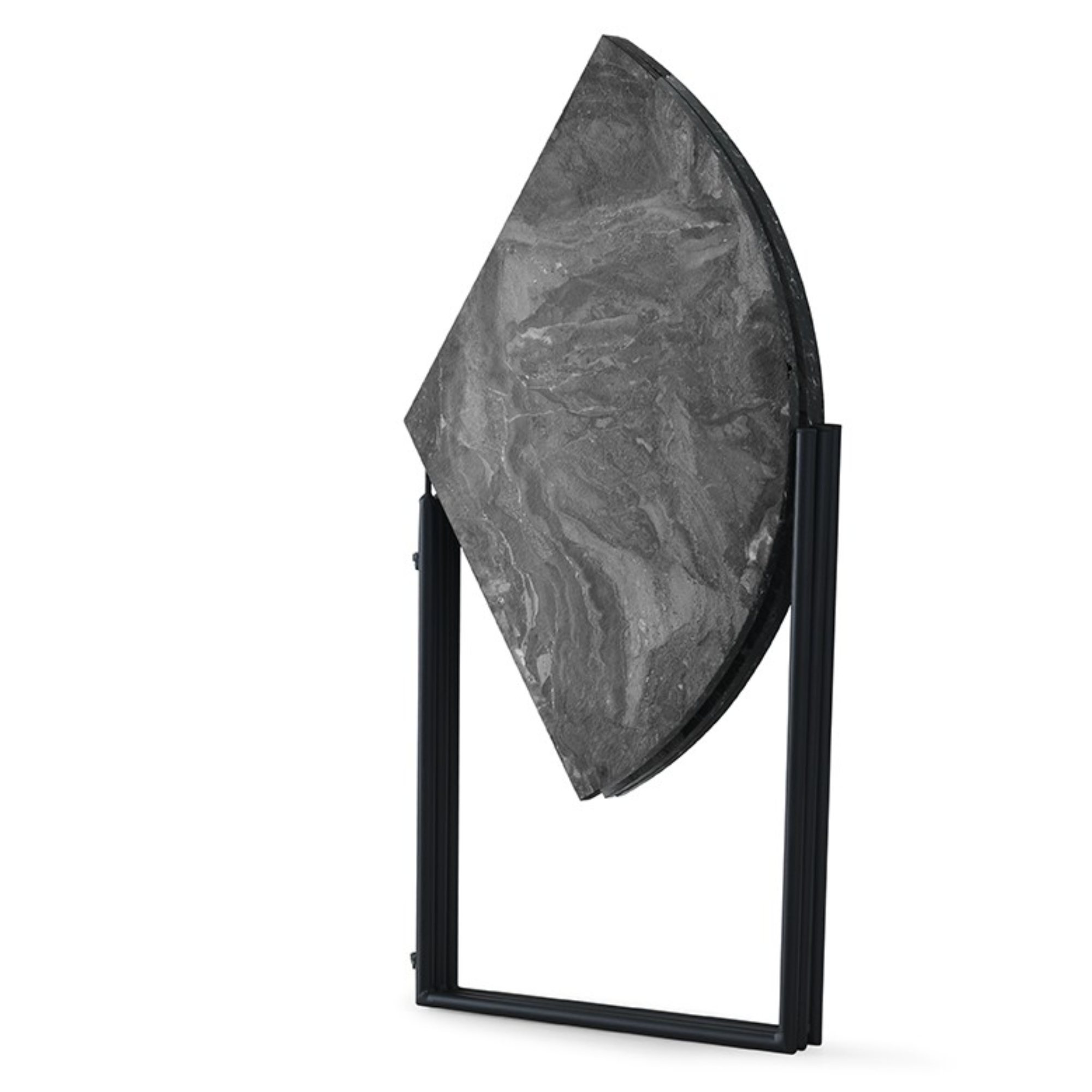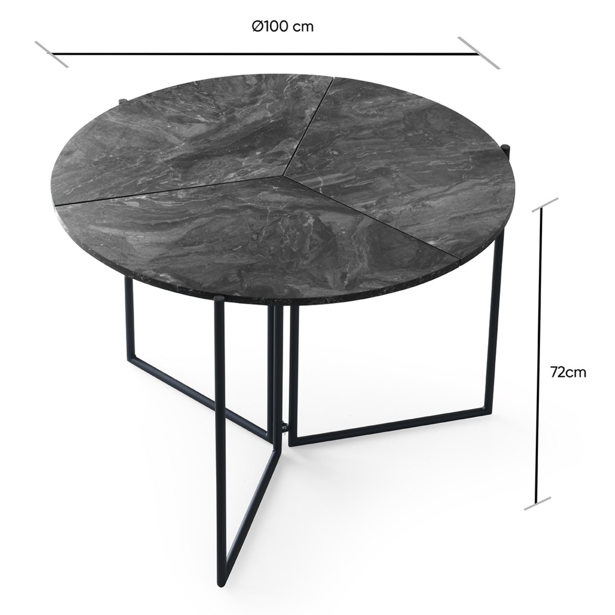 Stôl stojí na pevných a stabilných nohách, ktoré sú vyrobené z kovu. Horná doska je z laminovaného drevotrieskového materiálu, ktorý je nenáročný na údržbu, a zdobí ju štýlový dekor mramoru.