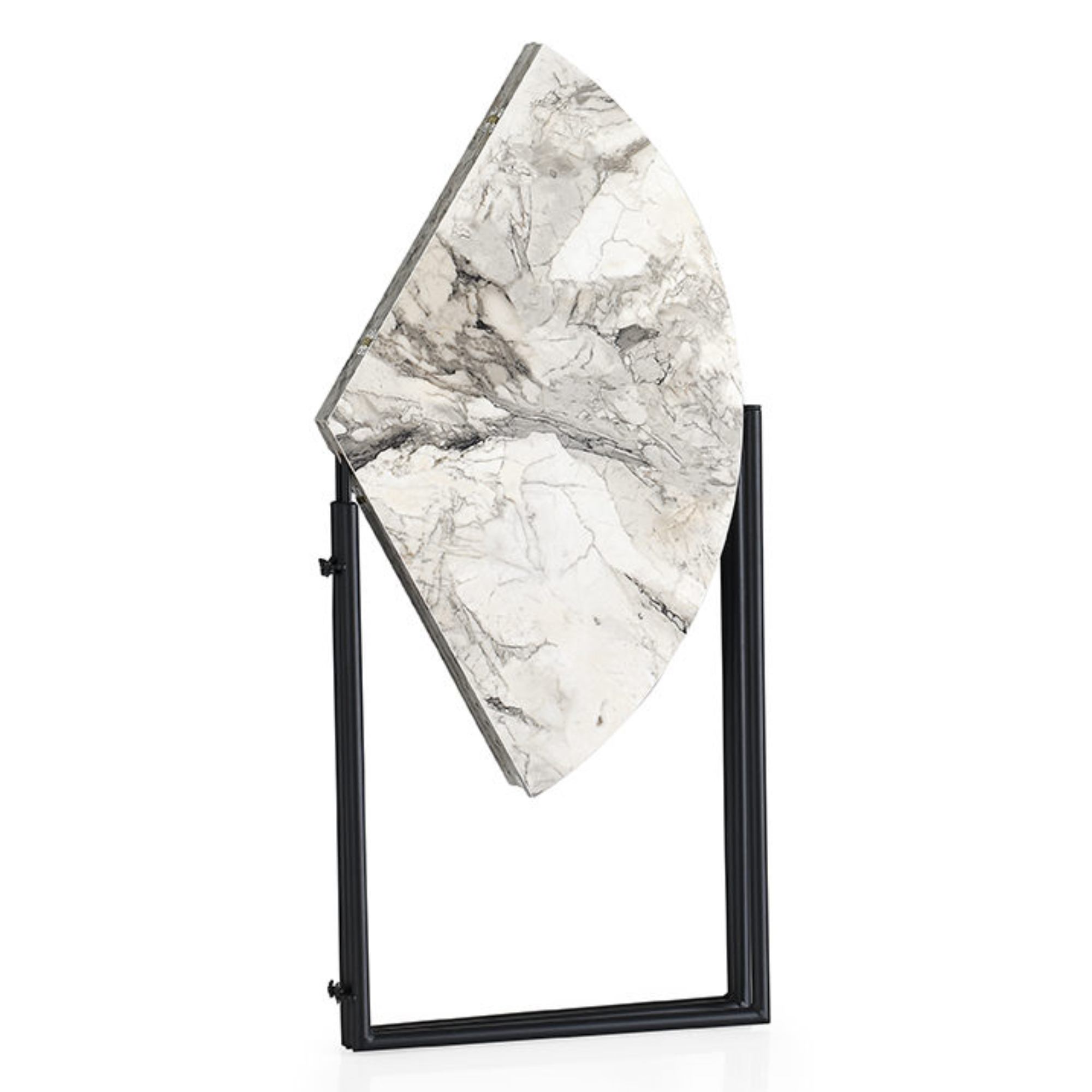 Stôl stojí na pevných a stabilných nohách, ktoré sú vyrobené z kovu. Horná doska je z laminovaného drevotrieskového materiálu, ktorý je nenáročný na údržbu, a zdobí ju štýlový dekor mramoru.