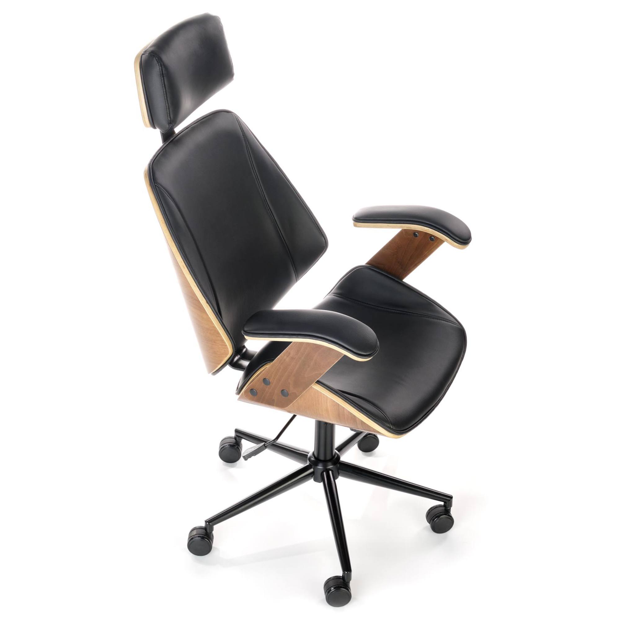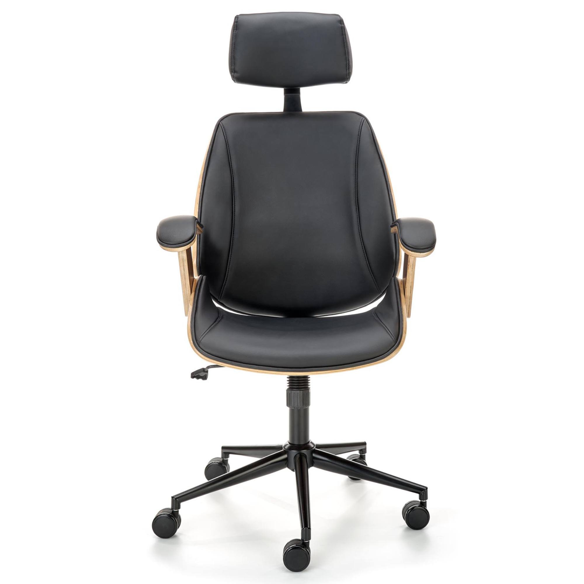 Kancelárska stolička AGNOZAU splní vaše požiadavky na pohodlné každodenné sedenie. Tento komfort vám dopraje príjemný poťah z ekokože a čalúnenie v oblasti sedadla, podrúčok, chrbtovej a hlavovej opierky. Konštrukcia zadnej strany operadla a spodnej strany sedadla je z dizajnovo ohýbanej preglejky a pridáva na celkovom elegantnom štýle stoličky. Výšku stoličky je možné nastaviť podľa vašich potrieb pomocou plynového piestu, tuhosť zase prispôsobíte skrutkou pod sedadlom. Maximálna nosnosť až 100 kg.