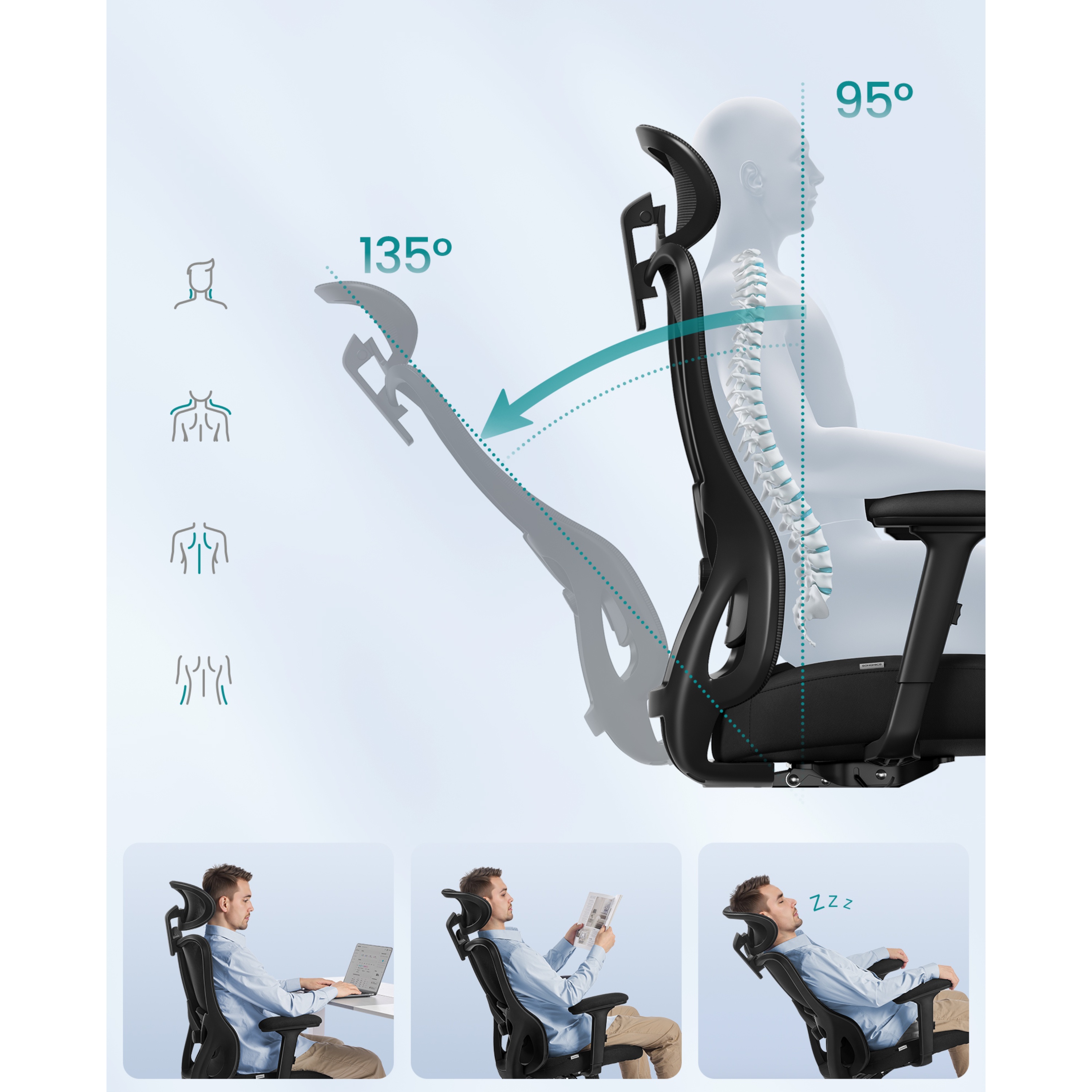 - Nastaviteľné podrúčky, bedrová opierka aj opierka hlavy