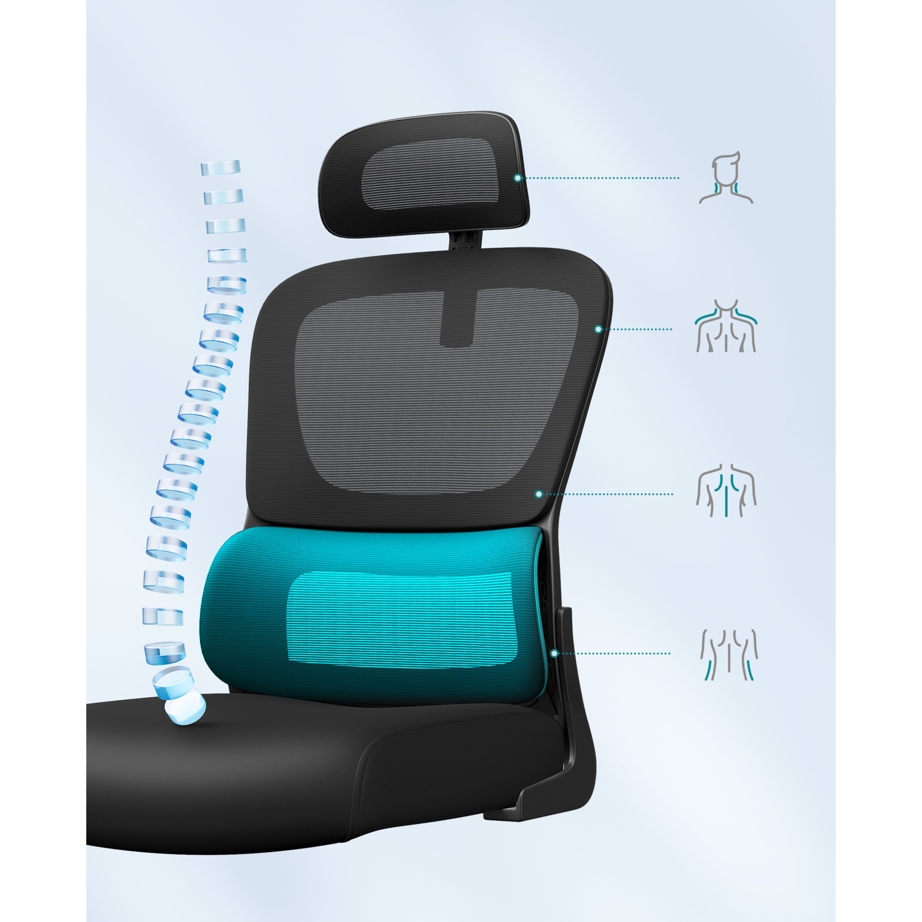 Súčasťou tejto nadčasovej stoličky je potiahnuté sedadlo, ktoré dopĺňa chrbtové operadlo a opierka hlavy z kvalitnej a priedušnej sieťoviny. Ruky si môžete pohodlne oprieť o nastaviteľné podrúčky s mäkkou vrchnou vrstvou. Opierku hlavy a bedrovú opierku je možné nastaviť podľa vašich preferencií pre čo najkomfortnejšie sedenie. Stoličku je možné výškovo nastaviť pomocou plynového piestu, tuhosť hojdania si zase prispôsobíte skrutkou pod sedadlom. Maximálna nosnosť až 120 kg.
