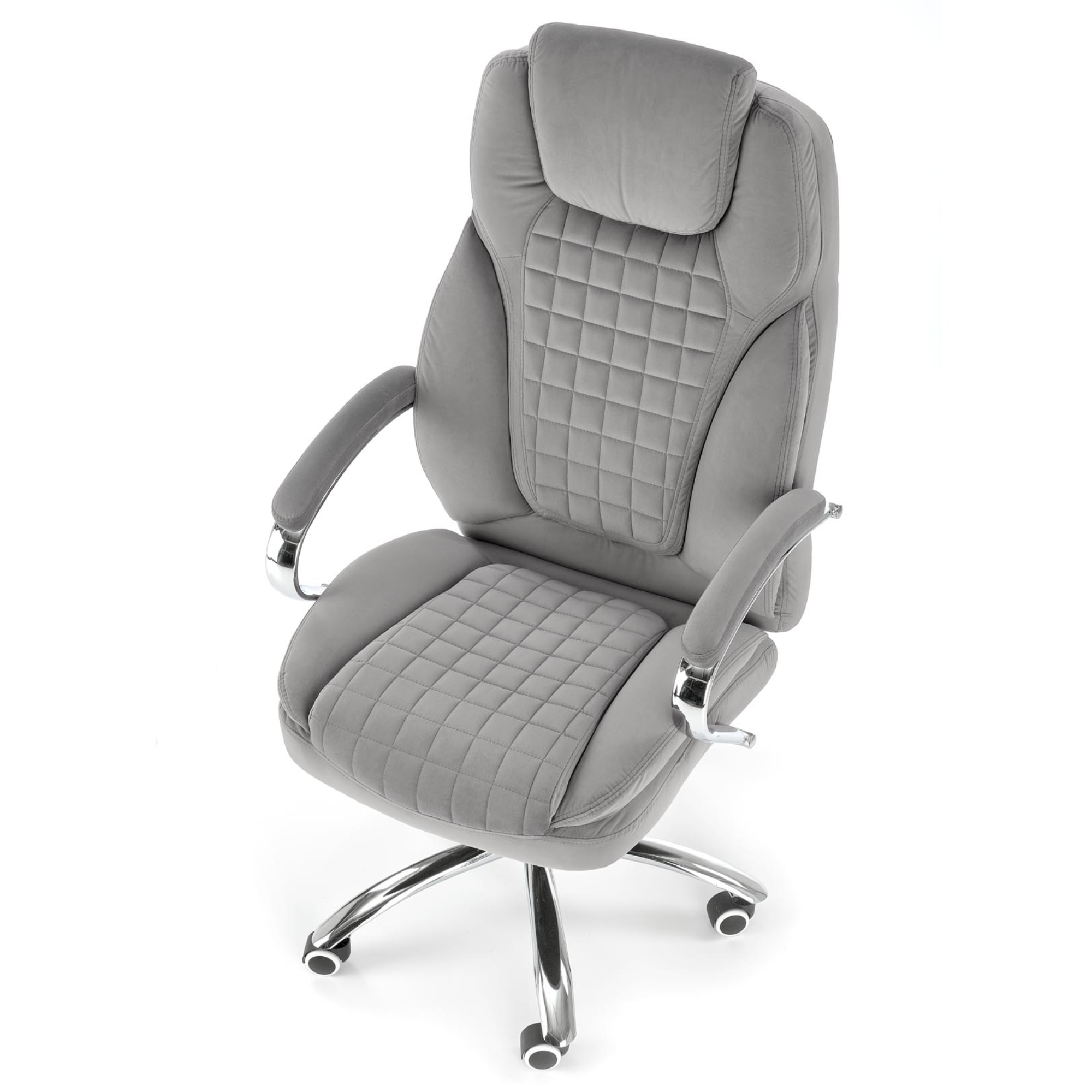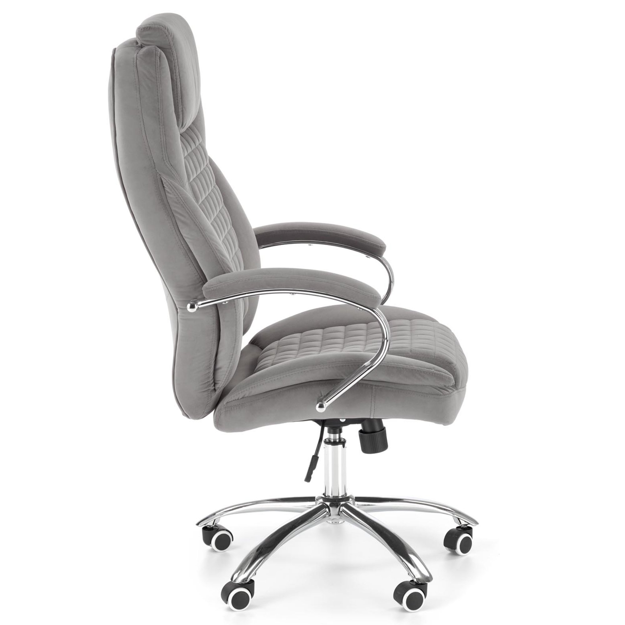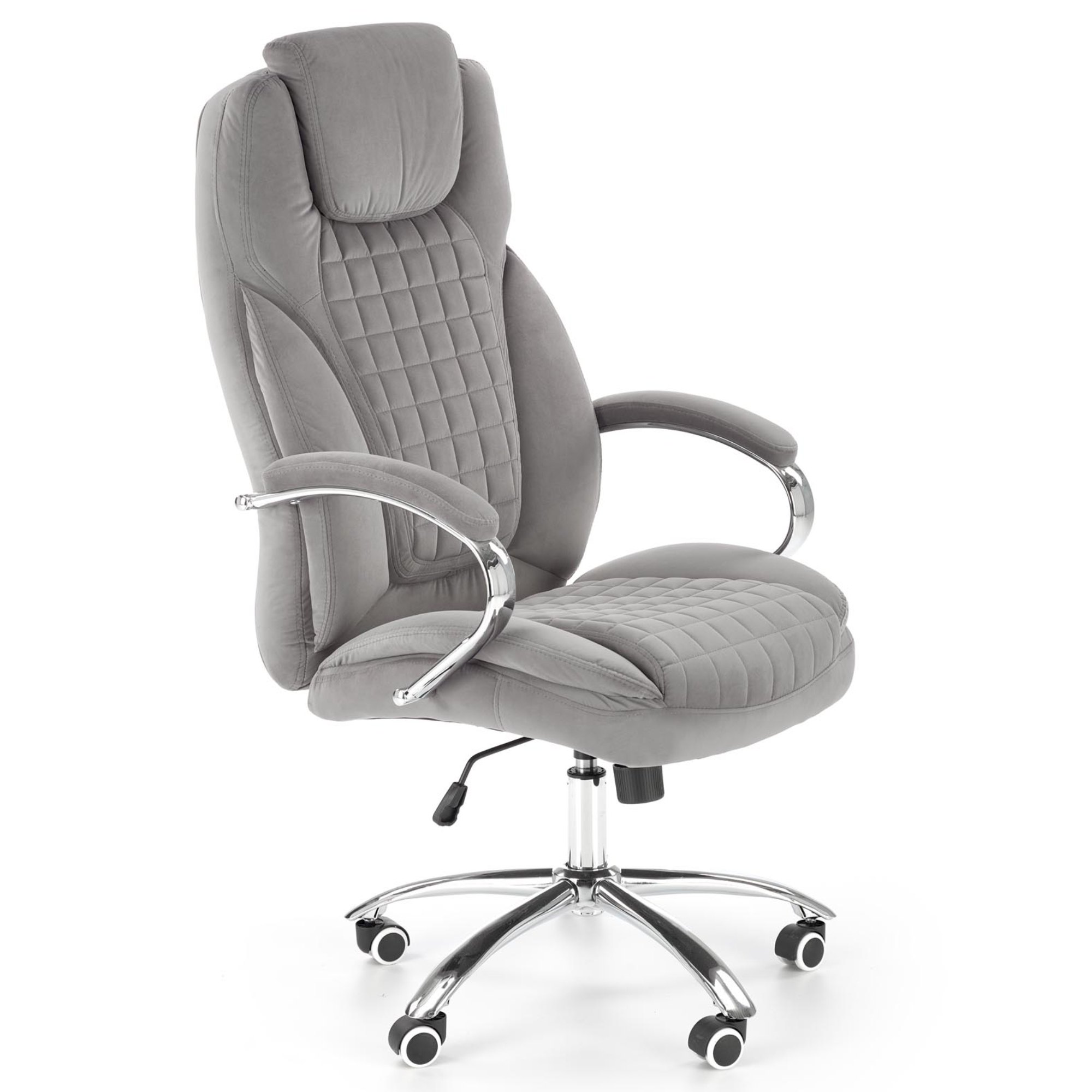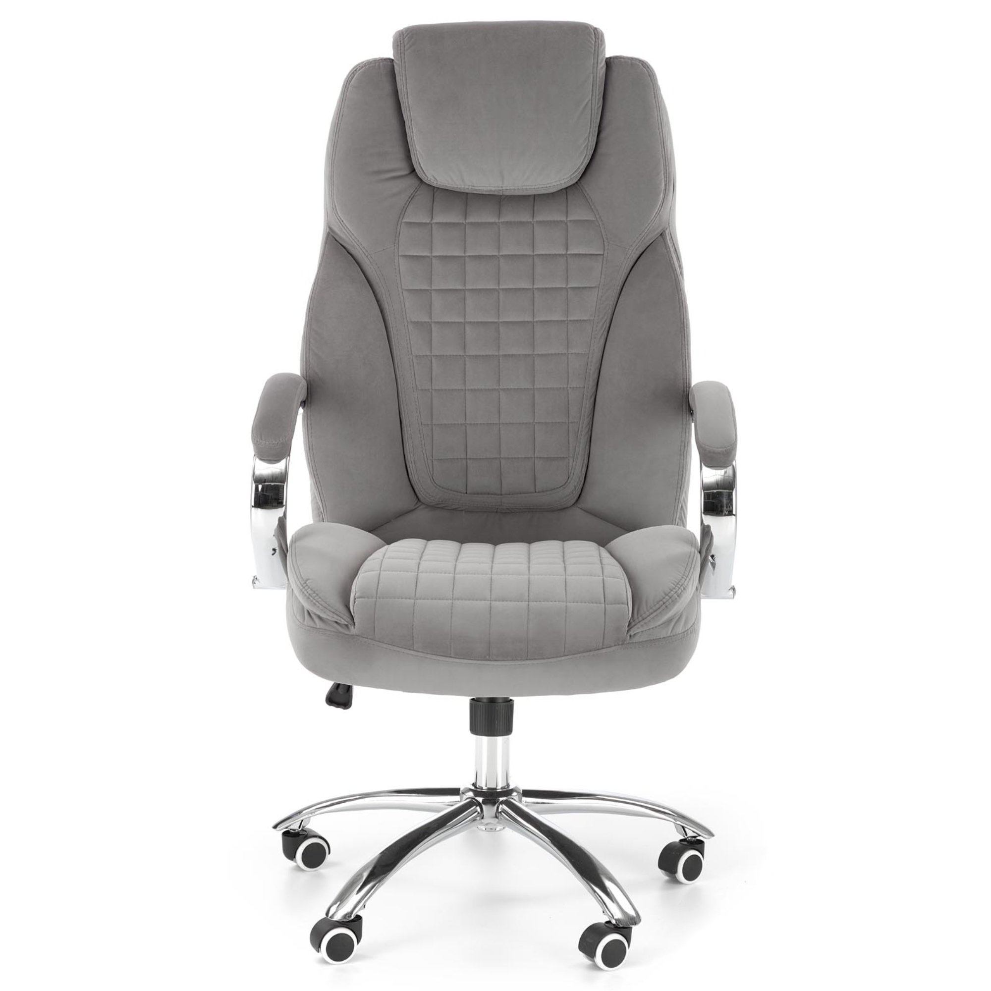 Luxusné kancelárske kreslo KANG 2 vám dopraje maximálny komfort pri každodennej práci u vás v kancelárii, či doma v pracovni. Poťah z hladkej tkaniny zamatového vzhľadu spoločne s mäkkým čalúnením v oblasti sedadla, podrúčok a chrbtovej opierky pridáva na celkovej pohodlnosti. Sivé vyhotovenie pôsobí čistým dojmom a hodí sa tak do akokoľvek zariadeného interiéru. Vďaka pogumovaným kolieskam je vhodné aj na tvrdé podlahy. Kreslo ďalej disponuje hojdacím mechanizmom a výškovo nastaviteľným sedadlom, tuhosť hojdania si prispôsobíte dolnou skrutkou. Maximálna nosnosť 120 kg.