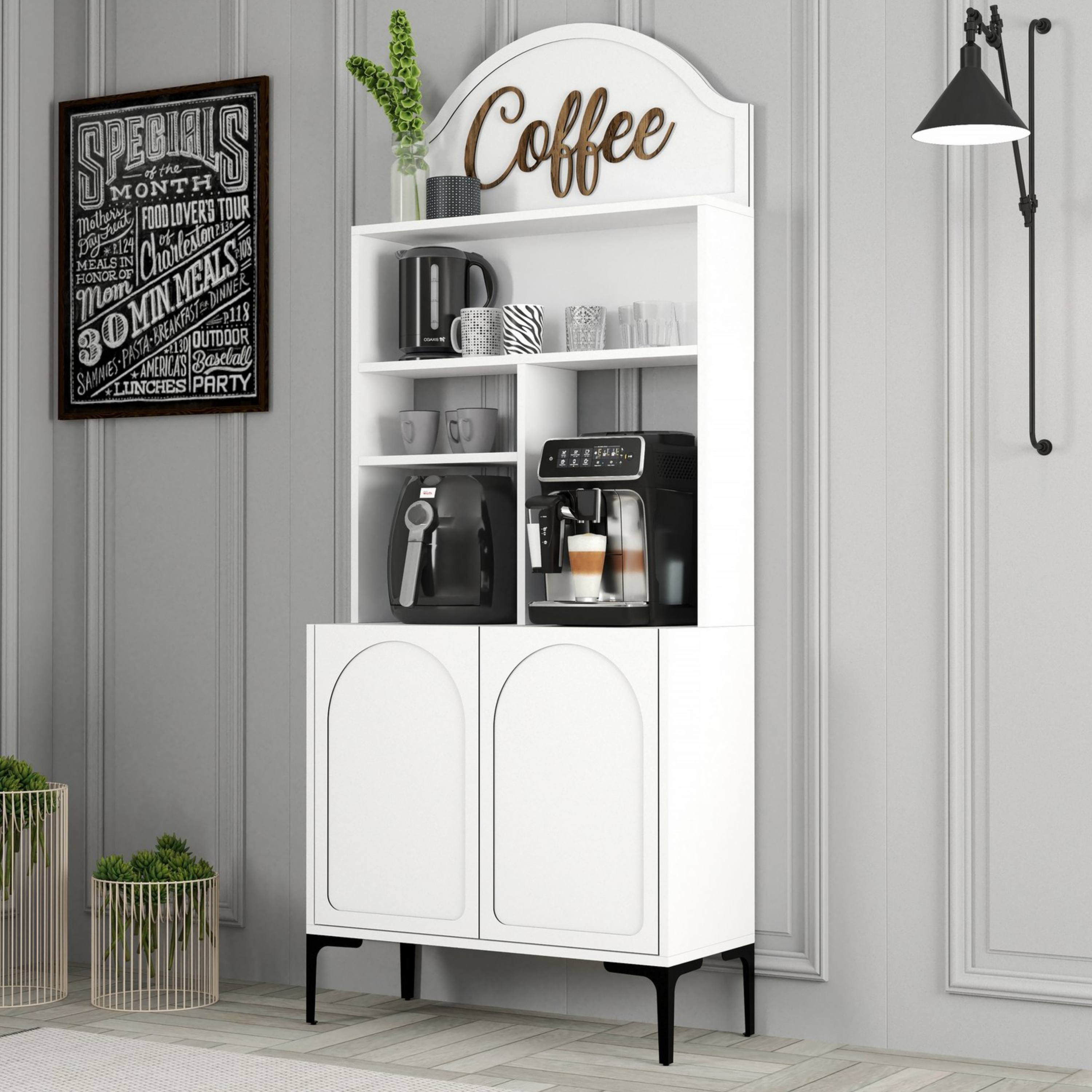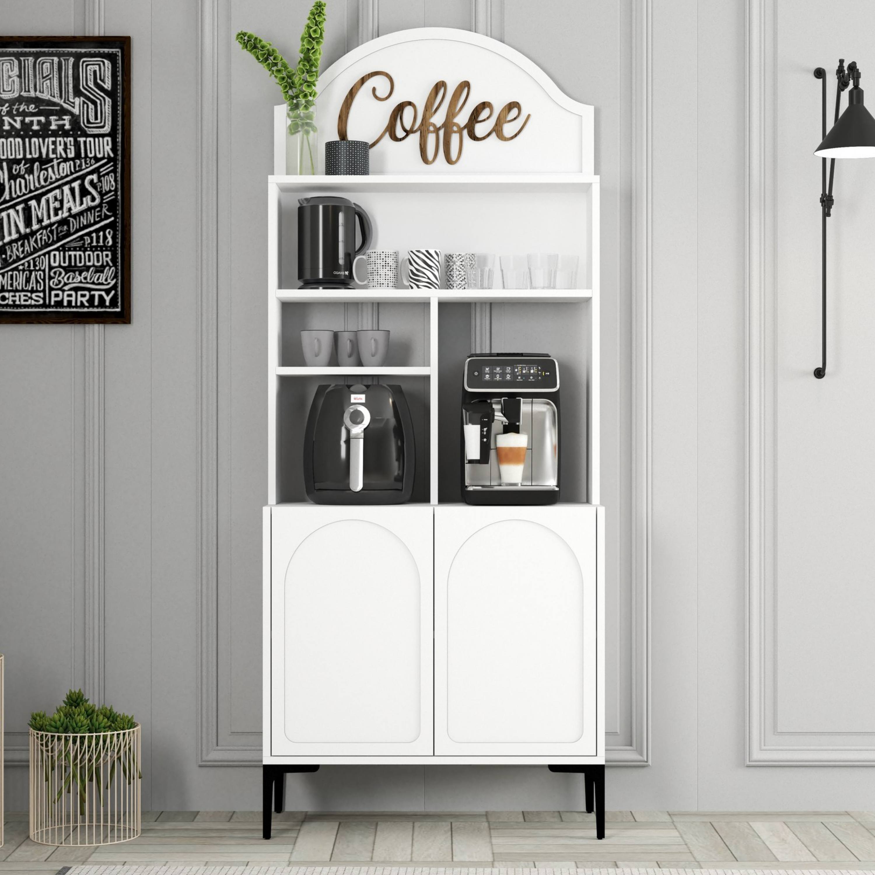 Disponuje otvorenými policami, kde si odložíte všetko príslušenstvo na prípravu kávy. Spodný uzatvárateľný priestor môžete využiť aj na predmety, ktoré nechcete mať hneď na očiach. Vzhľadom na použité materiály je regál nenáročný na údržbu.