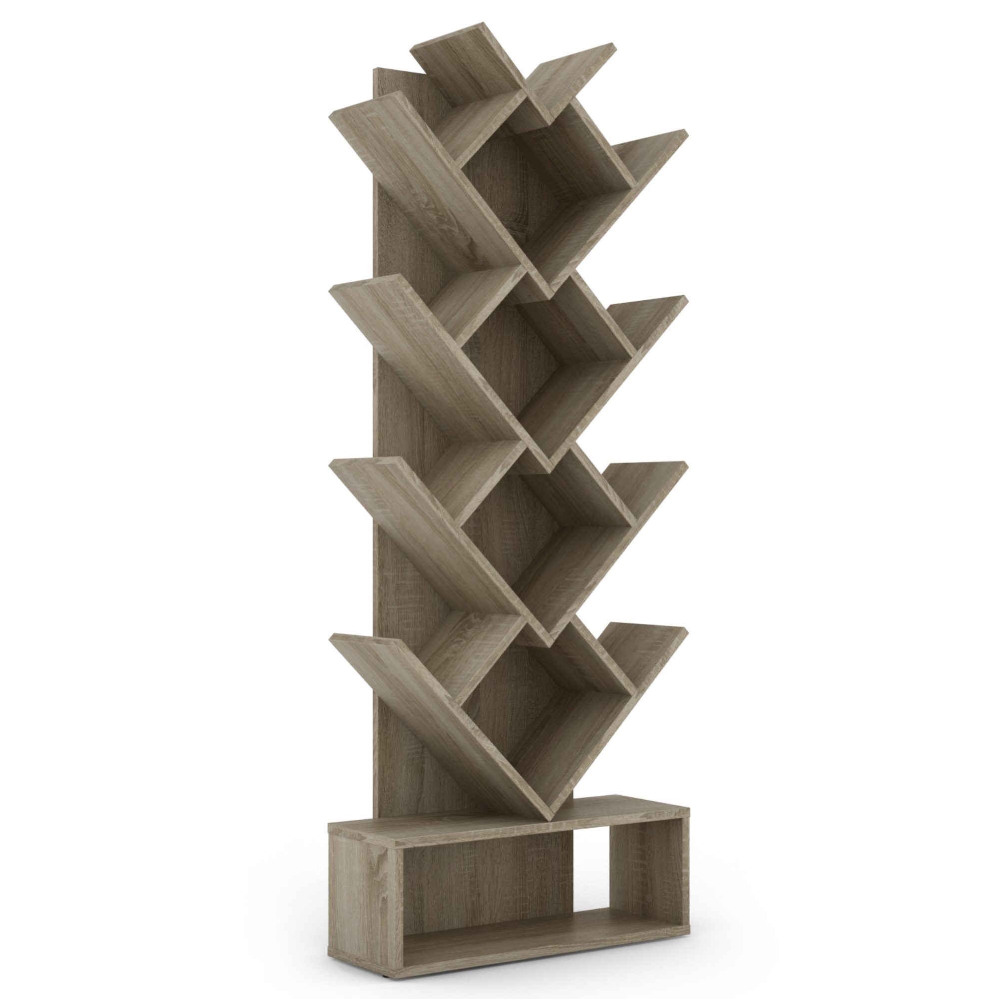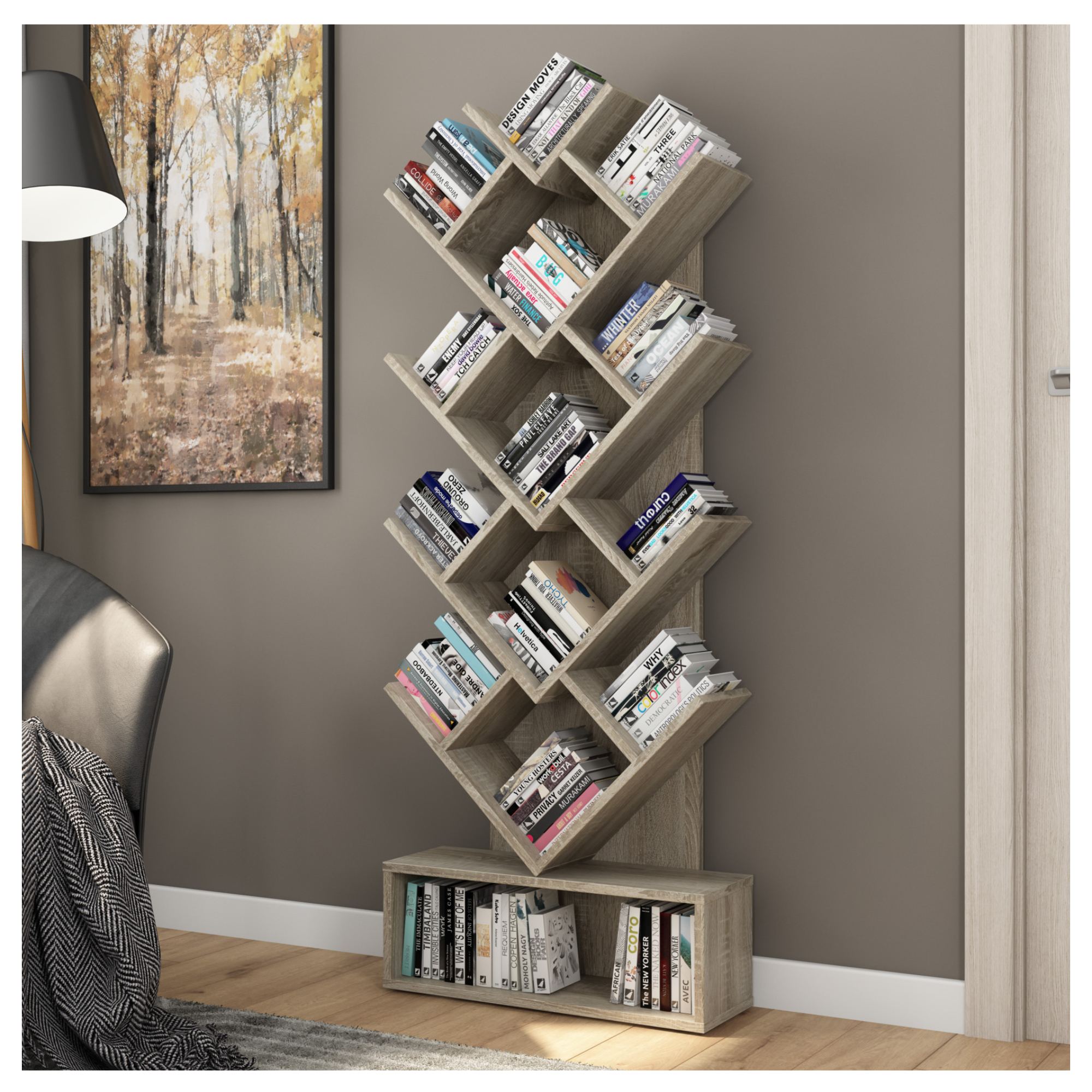 Nezvyčajne usporiadané police ponúkajú dostatočný priestor na uloženie kníh a časopisov. Horná sekcia knižnice je členená do niekoľkých úrovní a poskytuje celkovo 13 otvorených políc. Podstavec potom ponúka dodatočný úložný priestor na vaše knihy alebo dekorácie. Konštrukcia je vyrobená z laminovanej drevotrieskovej dosky, ktorá sa vyznačuje jednoduchou údržbou.