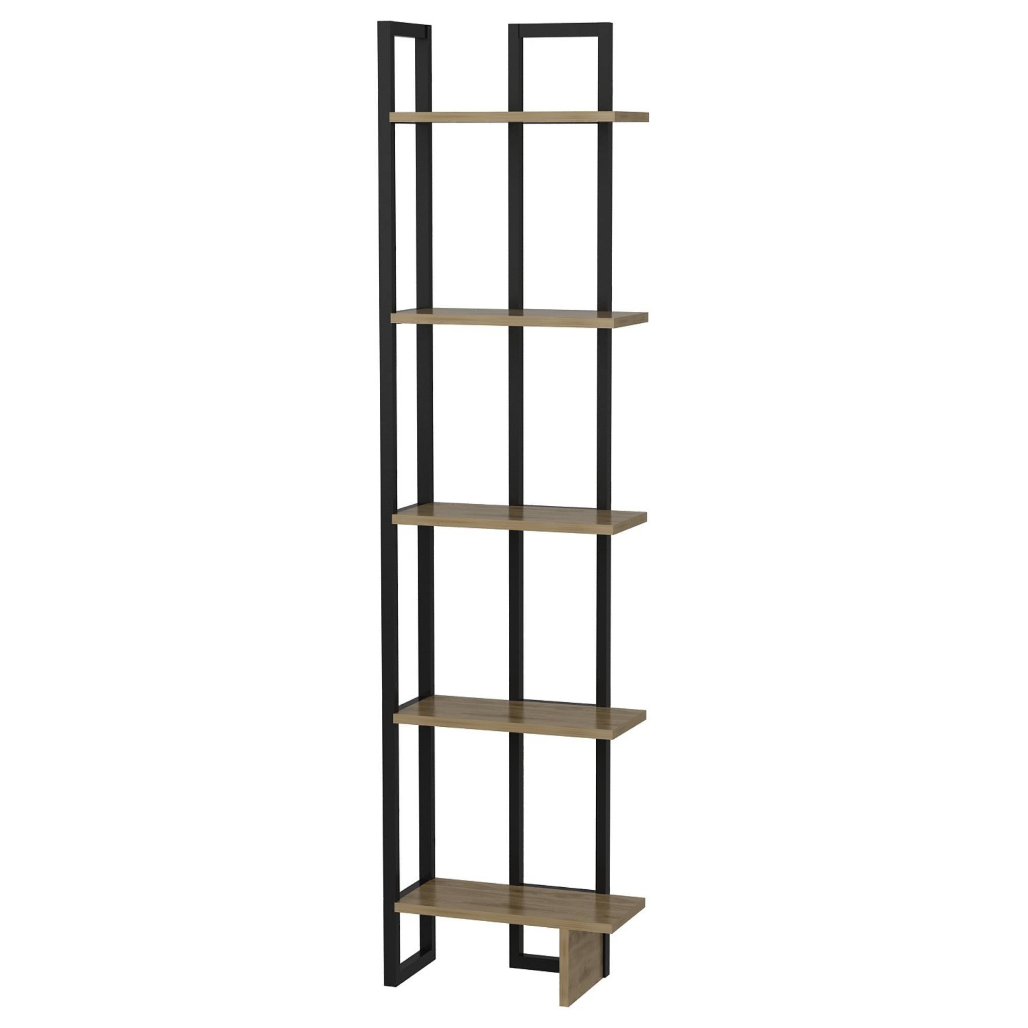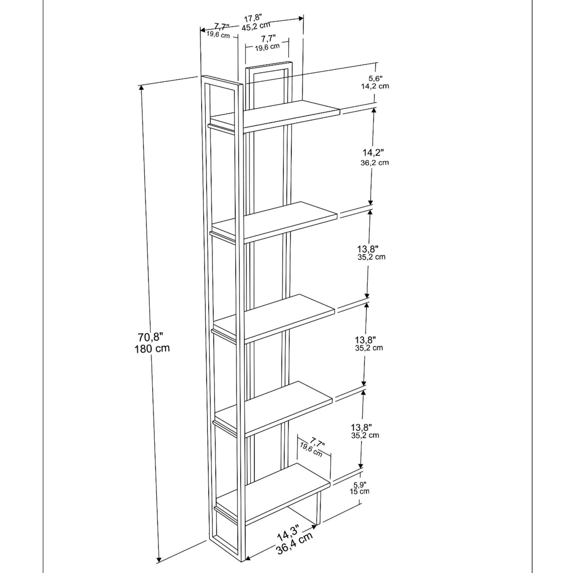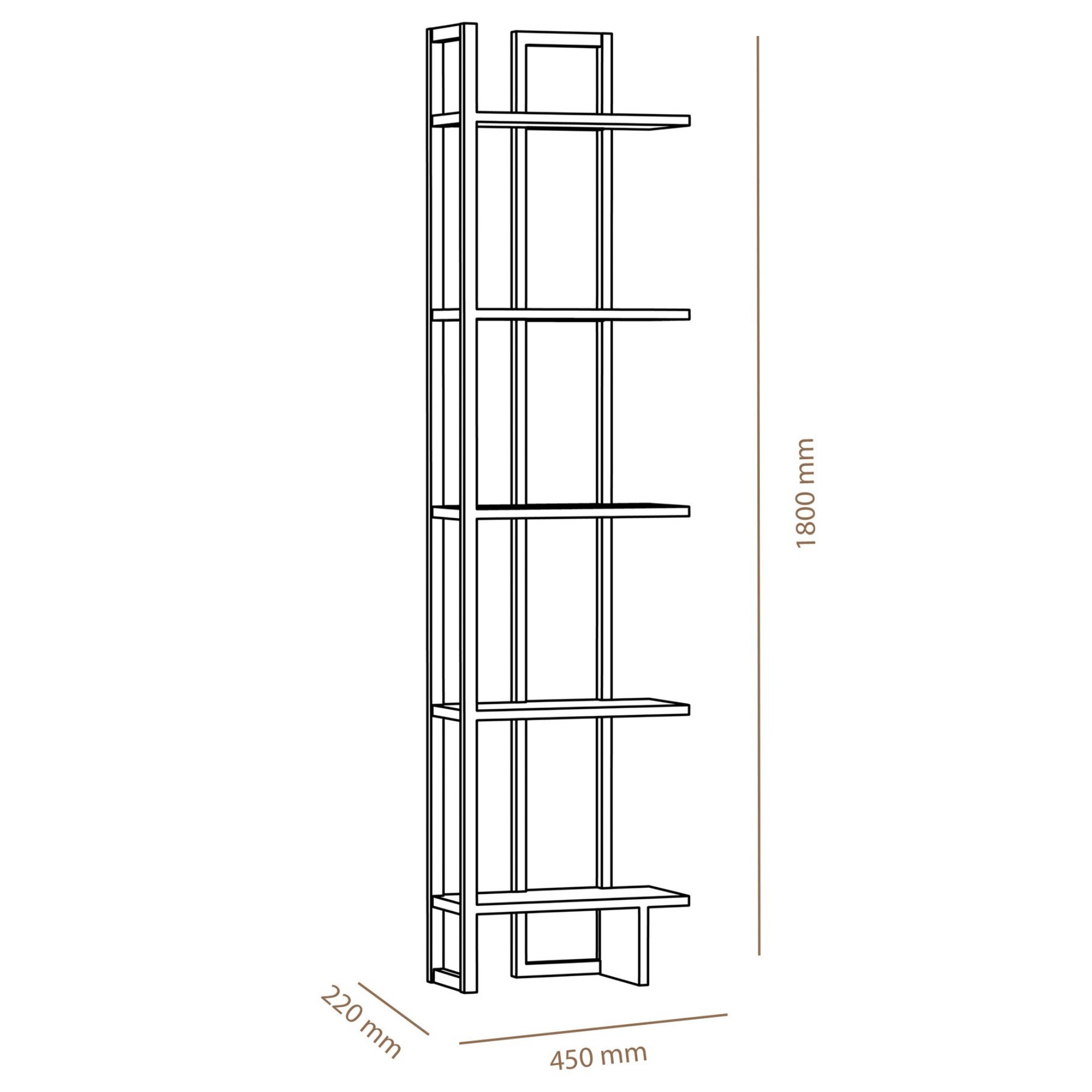 Kovová konštrukcia zaisťuje pevnosť, stabilitu a odolnosť celej knižnice. Do rámu je zasadených 5 otvorených políc z laminovanej drevotriesky, ktoré ponúkajú dostatok miesta na prehľadné uloženie vašich kníh a ďalších predmetov. Vďaka praktickému spracovaniu do výšky je ideálnou voľbou aj do malých miestností.