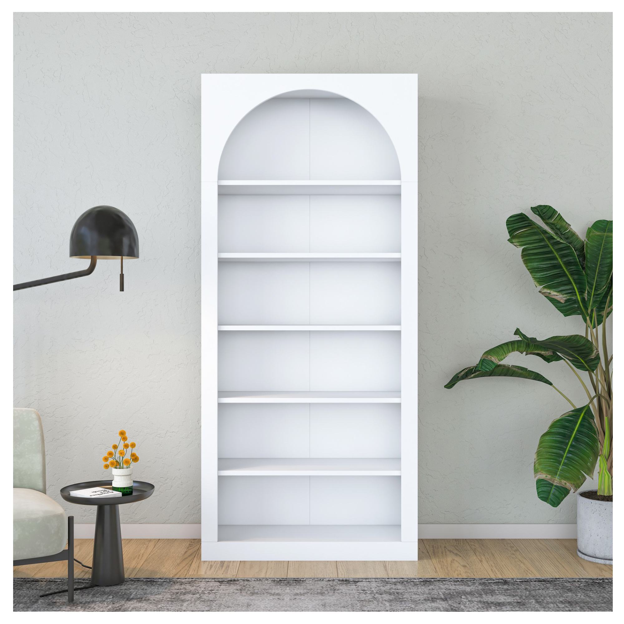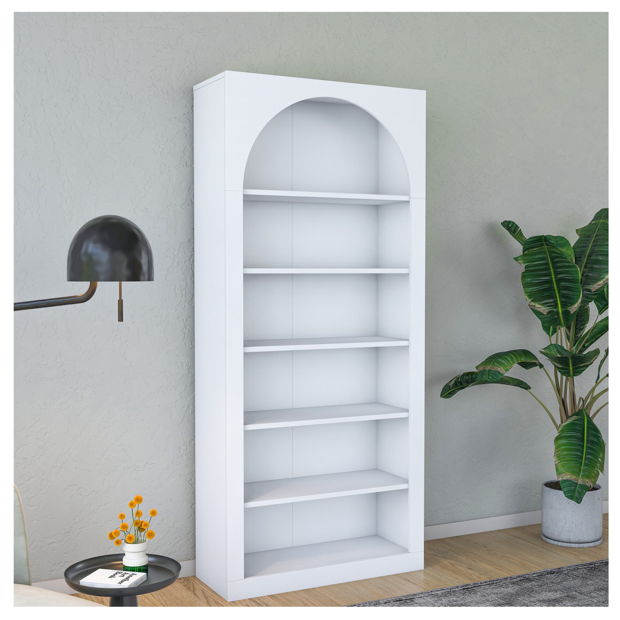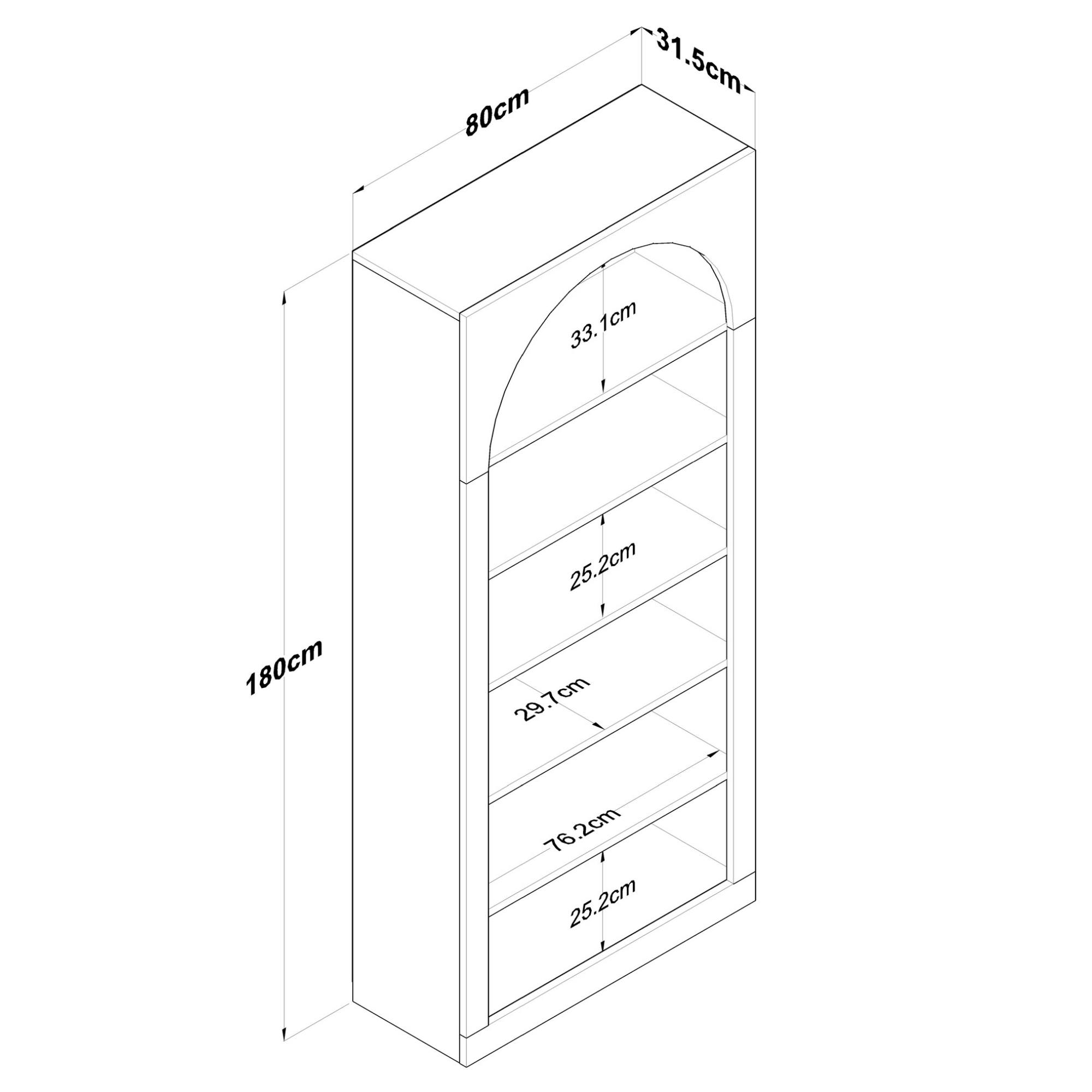 Knižnica je unikátna svojou konštrukciou s oblúkovým vykrojením, ktorá jej dodáva rozprávkovú atmosféru. Disponuje 5 policami s dostatkom priestoru na vaše knihy, dekorácie a rastliny. Je možné ju pripevniť k stene pre väčšiu stabilitu a bezpečnosť. Je vyrobená z kvalitnej laminovanej drevotrieskovej dosky, ktorá zaisťuje jednoduchú údržbu.