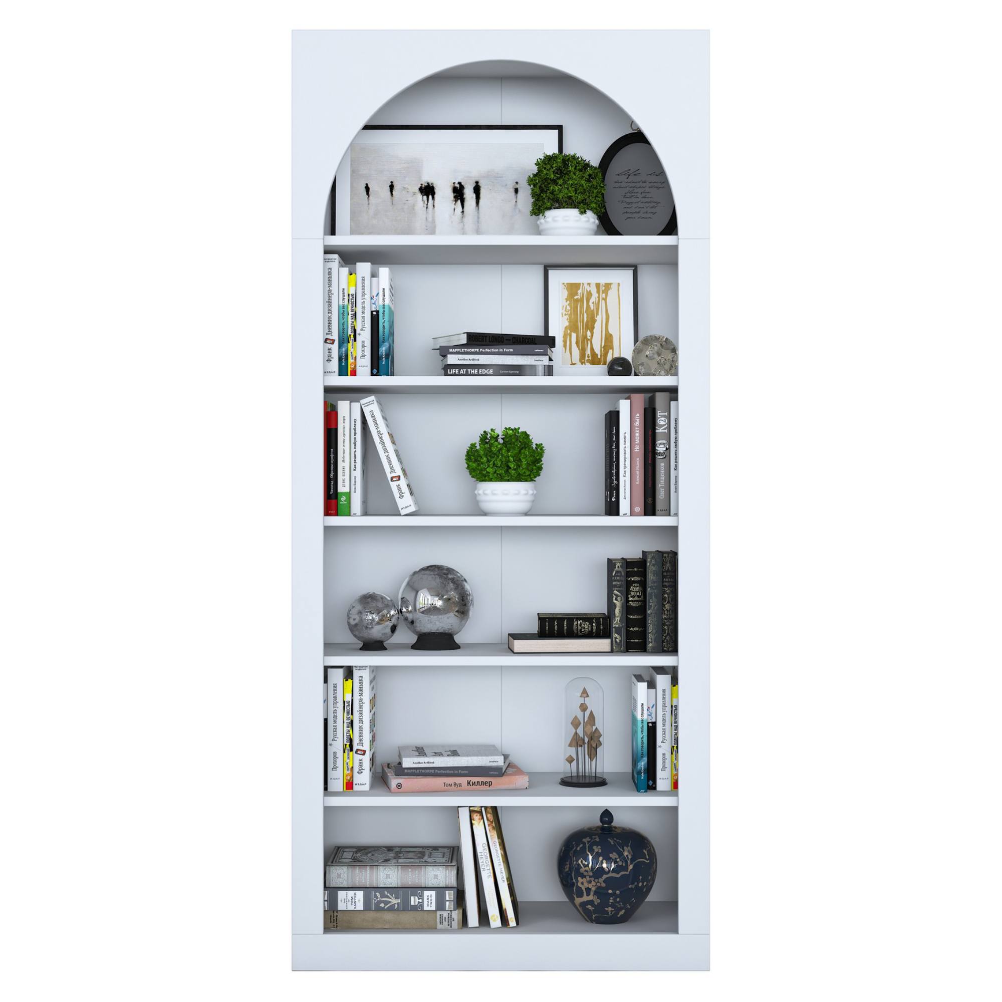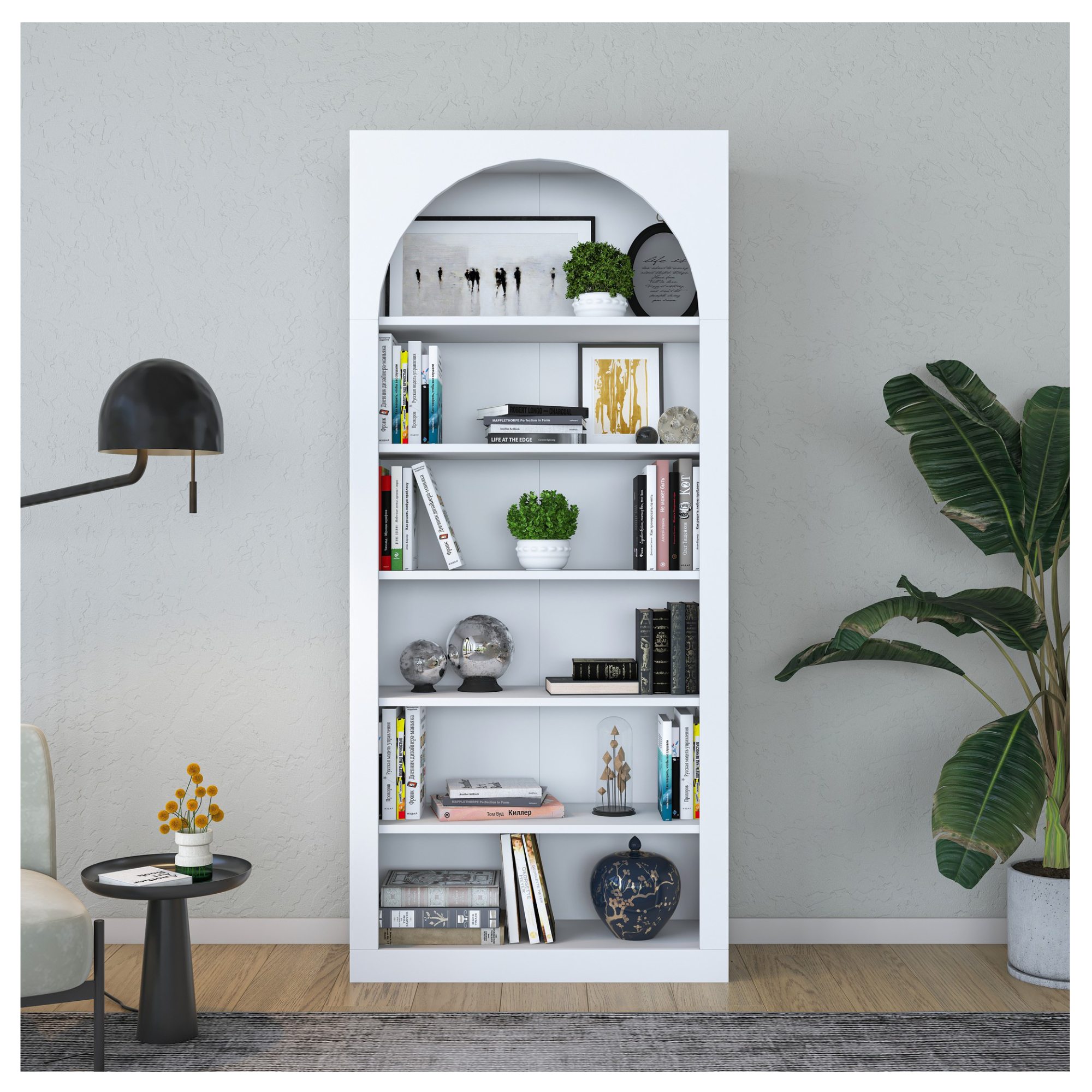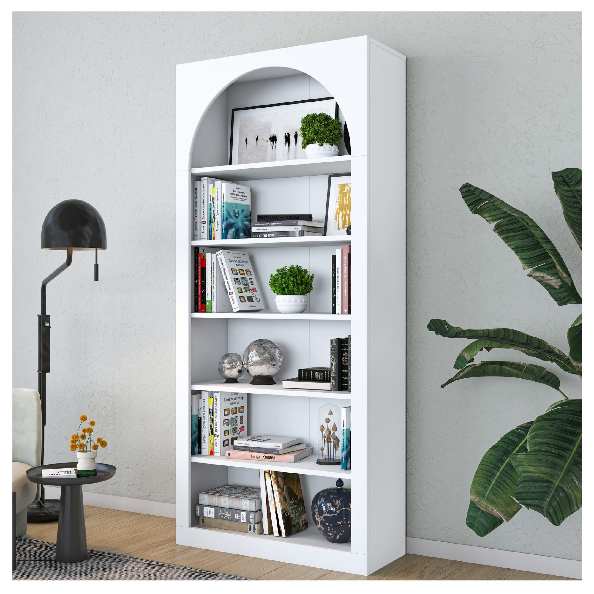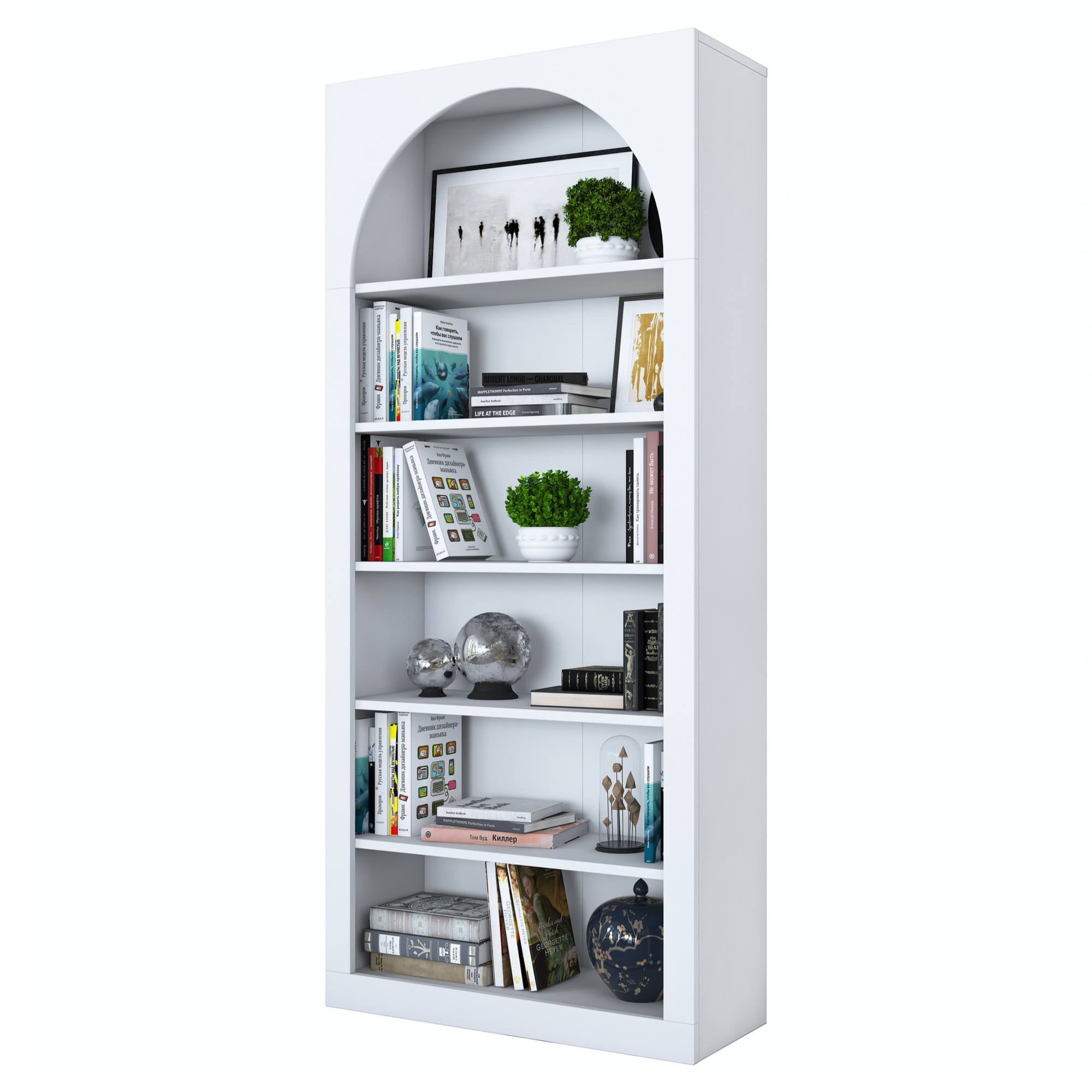 Knižnica je unikátna svojou konštrukciou s oblúkovým vykrojením, ktorá jej dodáva rozprávkovú atmosféru. Disponuje 5 policami s dostatkom priestoru na vaše knihy, dekorácie a rastliny. Je možné ju pripevniť k stene pre väčšiu stabilitu a bezpečnosť. Je vyrobená z kvalitnej laminovanej drevotrieskovej dosky, ktorá zaisťuje jednoduchú údržbu.